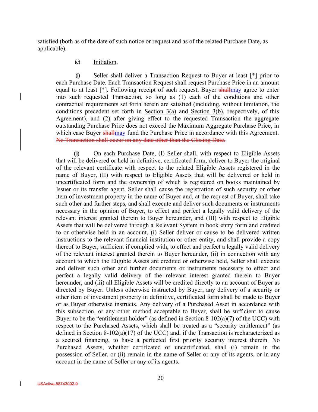 20 USActive 58743092.9 satisfied (both as of the date of such notice or request and as of the related Purchase Date, as applicable). (c) Initiation. (i) Seller shall deliver a Transaction Request to Buyer at least [*] prior to each Purchase Date. Each Transaction Request shall request Purchase Price in an amount equal to at least [*]. Following receipt of such request, Buyer shallmay agree to enter into such requested Transaction, so long as (1) each of the conditions and other contractual requirements set forth herein are satisfied (including, without limitation, the conditions precedent set forth in Section 3(a) and Section 3(b), respectively, of this Agreement), and (2) after giving effect to the requested Transaction the aggregate outstanding Purchase Price does not exceed the Maximum Aggregate Purchase Price, in which case Buyer shallmay fund the Purchase Price in accordance with this Agreement. No Transaction shall occur on any date other than the Closing Date. (ii) On each Purchase Date, (I) Seller shall, with respect to Eligible Assets that will be delivered or held in definitive, certificated form, deliver to Buyer the original of the relevant certificate with respect to the related Eligible Assets registered in the name of Buyer, (II) with respect to Eligible Assets that will be delivered or held in uncertificated form and the ownership of which is registered on books maintained by Issuer or its transfer agent, Seller shall cause the registration of such security or other item of investment property in the name of Buyer and, at the request of Buyer, shall take such other and further steps, and shall execute and deliver such documents or instruments necessary in the opinion of Buyer, to effect and perfect a legally valid delivery of the relevant interest granted therein to Buyer hereunder, and (III) with respect to Eligible Assets that will be delivered through a Relevant System in book entry form and credited to or otherwise held in an account, (i) Seller deliver or cause to be delivered written instructions to the relevant financial institution or other entity, and shall provide a copy thereof to Buyer, sufficient if complied with, to effect and perfect a legally valid delivery of the relevant interest granted therein to Buyer hereunder, (ii) in connection with any account to which the Eligible Assets are credited or otherwise held, Seller shall execute and deliver such other and further documents or instruments necessary to effect and perfect a legally valid delivery of the relevant interest granted therein to Buyer hereunder, and (iii) all Eligible Assets will be credited directly to an account of Buyer as directed by Buyer. Unless otherwise instructed by Buyer, any delivery of a security or other item of investment property in definitive, certificated form shall be made to Buyer or as Buyer otherwise instructs. Any delivery of a Purchased Asset in accordance with this subsection, or any other method acceptable to Buyer, shall be sufficient to cause Buyer to be the “entitlement holder” (as defined in Section 8-102(a)(7) of the UCC) with respect to the Purchased Assets, which shall be treated as a “security entitlement” (as defined in Section 8-102(a)(17) of the UCC) and, if the Transaction is recharacterized as a secured financing, to have a perfected first priority security interest therein. No Purchased Assets, whether certificated or uncertificated, shall (i) remain in the possession of Seller, or (ii) remain in the name of Seller or any of its agents, or in any account in the name of Seller or any of its agents.