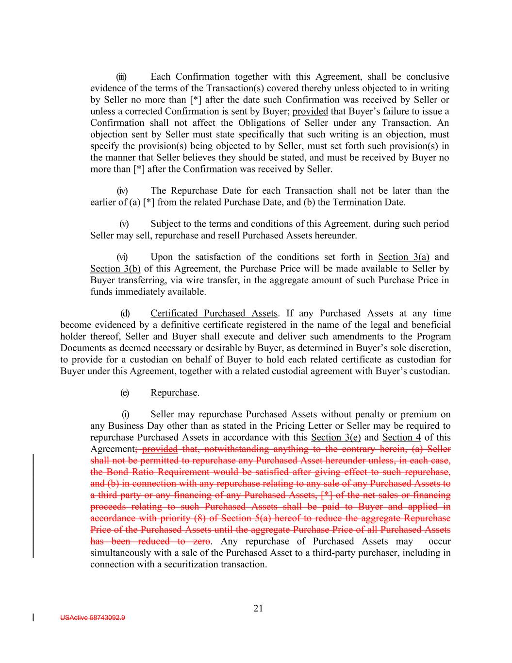 21 USActive 58743092.9 (iii) Each Confirmation together with this Agreement, shall be conclusive evidence of the terms of the Transaction(s) covered thereby unless objected to in writing by Seller no more than [*] after the date such Confirmation was received by Seller or unless a corrected Confirmation is sent by Buyer; provided that Buyer’s failure to issue a Confirmation shall not affect the Obligations of Seller under any Transaction. An objection sent by Seller must state specifically that such writing is an objection, must specify the provision(s) being objected to by Seller, must set forth such provision(s) in the manner that Seller believes they should be stated, and must be received by Buyer no more than [*] after the Confirmation was received by Seller. (iv) The Repurchase Date for each Transaction shall not be later than the earlier of (a) [*] from the related Purchase Date, and (b) the Termination Date. (v) Subject to the terms and conditions of this Agreement, during such period Seller may sell, repurchase and resell Purchased Assets hereunder. (vi) Upon the satisfaction of the conditions set forth in Section 3(a) and Section 3(b) of this Agreement, the Purchase Price will be made available to Seller by Buyer transferring, via wire transfer, in the aggregate amount of such Purchase Price in funds immediately available. (d) Certificated Purchased Assets. If any Purchased Assets at any time become evidenced by a definitive certificate registered in the name of the legal and beneficial holder thereof, Seller and Buyer shall execute and deliver such amendments to the Program Documents as deemed necessary or desirable by Buyer, as determined in Buyer’s sole discretion, to provide for a custodian on behalf of Buyer to hold each related certificate as custodian for Buyer under this Agreement, together with a related custodial agreement with Buyer’s custodian. (e) Repurchase. (i) Seller may repurchase Purchased Assets without penalty or premium on any Business Day other than as stated in the Pricing Letter or Seller may be required to repurchase Purchased Assets in accordance with this Section 3(e) and Section 4 of this Agreement; provided that, notwithstanding anything to the contrary herein, (a) Seller shall not be permitted to repurchase any Purchased Asset hereunder unless, in each case, the Bond Ratio Requirement would be satisfied after giving effect to such repurchase, and (b) in connection with any repurchase relating to any sale of any Purchased Assets to a third party or any financing of any Purchased Assets, [*] of the net sales or financing proceeds relating to such Purchased Assets shall be paid to Buyer and applied in accordance with priority (8) of Section 5(a) hereof to reduce the aggregate Repurchase Price of the Purchased Assets until the aggregate Purchase Price of all Purchased Assets has been reduced to zero. Any repurchase of Purchased Assets may occur simultaneously with a sale of the Purchased Asset to a third-party purchaser, including in connection with a securitization transaction.