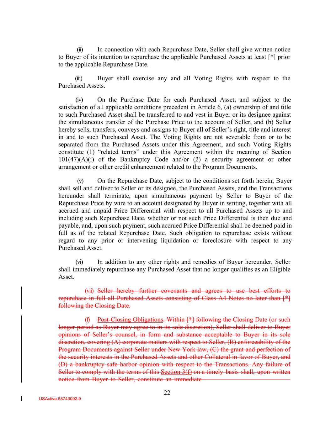 22 USActive 58743092.9 (ii) In connection with each Repurchase Date, Seller shall give written notice to Buyer of its intention to repurchase the applicable Purchased Assets at least [*] prior to the applicable Repurchase Date. (iii) Buyer shall exercise any and all Voting Rights with respect to the Purchased Assets. (iv) On the Purchase Date for each Purchased Asset, and subject to the satisfaction of all applicable conditions precedent in Article 6, (a) ownership of and title to such Purchased Asset shall be transferred to and vest in Buyer or its designee against the simultaneous transfer of the Purchase Price to the account of Seller, and (b) Seller hereby sells, transfers, conveys and assigns to Buyer all of Seller’s right, title and interest in and to such Purchased Asset. The Voting Rights are not severable from or to be separated from the Purchased Assets under this Agreement, and such Voting Rights constitute (1) “related terms” under this Agreement within the meaning of Section 101(47)(A)(i) of the Bankruptcy Code and/or (2) a security agreement or other arrangement or other credit enhancement related to the Program Documents. (v) On the Repurchase Date, subject to the conditions set forth herein, Buyer shall sell and deliver to Seller or its designee, the Purchased Assets, and the Transactions hereunder shall terminate, upon simultaneous payment by Seller to Buyer of the Repurchase Price by wire to an account designated by Buyer in writing, together with all accrued and unpaid Price Differential with respect to all Purchased Assets up to and including such Repurchase Date, whether or not such Price Differential is then due and payable, and, upon such payment, such accrued Price Differential shall be deemed paid in full as of the related Repurchase Date. Such obligation to repurchase exists without regard to any prior or intervening liquidation or foreclosure with respect to any Purchased Asset. (vi) In addition to any other rights and remedies of Buyer hereunder, Seller shall immediately repurchase any Purchased Asset that no longer qualifies as an Eligible Asset. (vii) Seller hereby further covenants and agrees to use best efforts to repurchase in full all Purchased Assets consisting of Class A4 Notes no later than [*] following the Closing Date. (f) Post-Closing Obligations. Within [*] following the Closing Date (or such longer period as Buyer may agree to in its sole discretion), Seller shall deliver to Buyer opinions of Seller’s counsel, in form and substance acceptable to Buyer in its sole discretion, covering (A) corporate matters with respect to Seller, (B) enforceability of the Program Documents against Seller under New York law, (C) the grant and perfection of the security interests in the Purchased Assets and other Collateral in favor of Buyer, and (D) a bankruptcy safe harbor opinion with respect to the Transactions. Any failure of Seller to comply with the terms of this Section 3(f) on a timely basis shall, upon written notice from Buyer to Seller, constitute an immediate