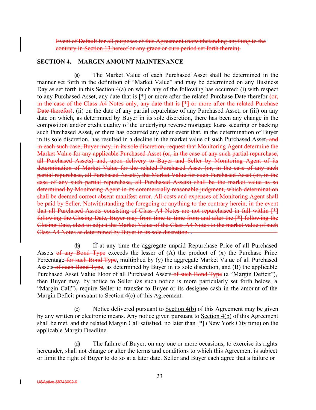 23 USActive 58743092.9 Event of Default for all purposes of this Agreement (notwithstanding anything to the contrary in Section 13 hereof or any grace or cure period set forth therein). SECTION 4. MARGIN AMOUNT MAINTENANCE (a) The Market Value of each Purchased Asset shall be determined in the manner set forth in the definition of “Market Value” and may be determined on any Business Day as set forth in this Section 4(a) on which any of the following has occurred: (i) with respect to any Purchased Asset, any date that is [*] or more after the related Purchase Date therefor (or, in the case of the Class A4 Notes only, any date that is [*] or more after the related Purchase Date therefor), (ii) on the date of any partial repurchase of any Purchased Asset, or (iii) on any date on which, as determined by Buyer in its sole discretion, there has been any change in the composition and/or credit quality of the underlying reverse mortgage loans securing or backing such Purchased Asset, or there has occurred any other event that, in the determination of Buyer in its sole discretion, has resulted in a decline in the market value of such Purchased Asset, and in each such case, Buyer may, in its sole discretion, request that Monitoring Agent determine the Market Value for any applicable Purchased Asset (or, in the case of any such partial repurchase, all Purchased Assets) and, upon delivery to Buyer and Seller by Monitoring Agent of its determination of Market Value for the related Purchased Asset (or, in the case of any such partial repurchase, all Purchased Assets), the Market Value for such Purchased Asset (or, in the case of any such partial repurchase, all Purchased Assets) shall be the market value as so determined by Monitoring Agent in its commercially reasonable judgment, which determination shall be deemed correct absent manifest error. All costs and expenses of Monitoring Agent shall be paid by Seller. Notwithstanding the foregoing or anything to the contrary herein, in the event that all Purchased Assets consisting of Class A4 Notes are not repurchased in full within [*] following the Closing Date, Buyer may from time to time from and after the [*] following the Closing Date, elect to adjust the Market Value of the Class A4 Notes to the market value of such Class A4 Notes as determined by Buyer in its sole discretion. . (b) If at any time the aggregate unpaid Repurchase Price of all Purchased Assets of any Bond Type exceeds the lesser of (A) the product of (x) the Purchase Price Percentage for such Bond Type, multiplied by (y) the aggregate Market Value of all Purchased Assets of such Bond Type, as determined by Buyer in its sole discretion, and (B) the applicable Purchased Asset Value Floor of all Purchased Assets of such Bond Type (a “Margin Deficit”), then Buyer may, by notice to Seller (as such notice is more particularly set forth below, a “Margin Call”), require Seller to transfer to Buyer or its designee cash in the amount of the Margin Deficit pursuant to Section 4(c) of this Agreement. (c) Notice delivered pursuant to Section 4(b) of this Agreement may be given by any written or electronic means. Any notice given pursuant to Section 4(b) of this Agreement shall be met, and the related Margin Call satisfied, no later than [*] (New York City time) on the applicable Margin Deadline. (d) The failure of Buyer, on any one or more occasions, to exercise its rights hereunder, shall not change or alter the terms and conditions to which this Agreement is subject or limit the right of Buyer to do so at a later date. Seller and Buyer each agree that a failure or