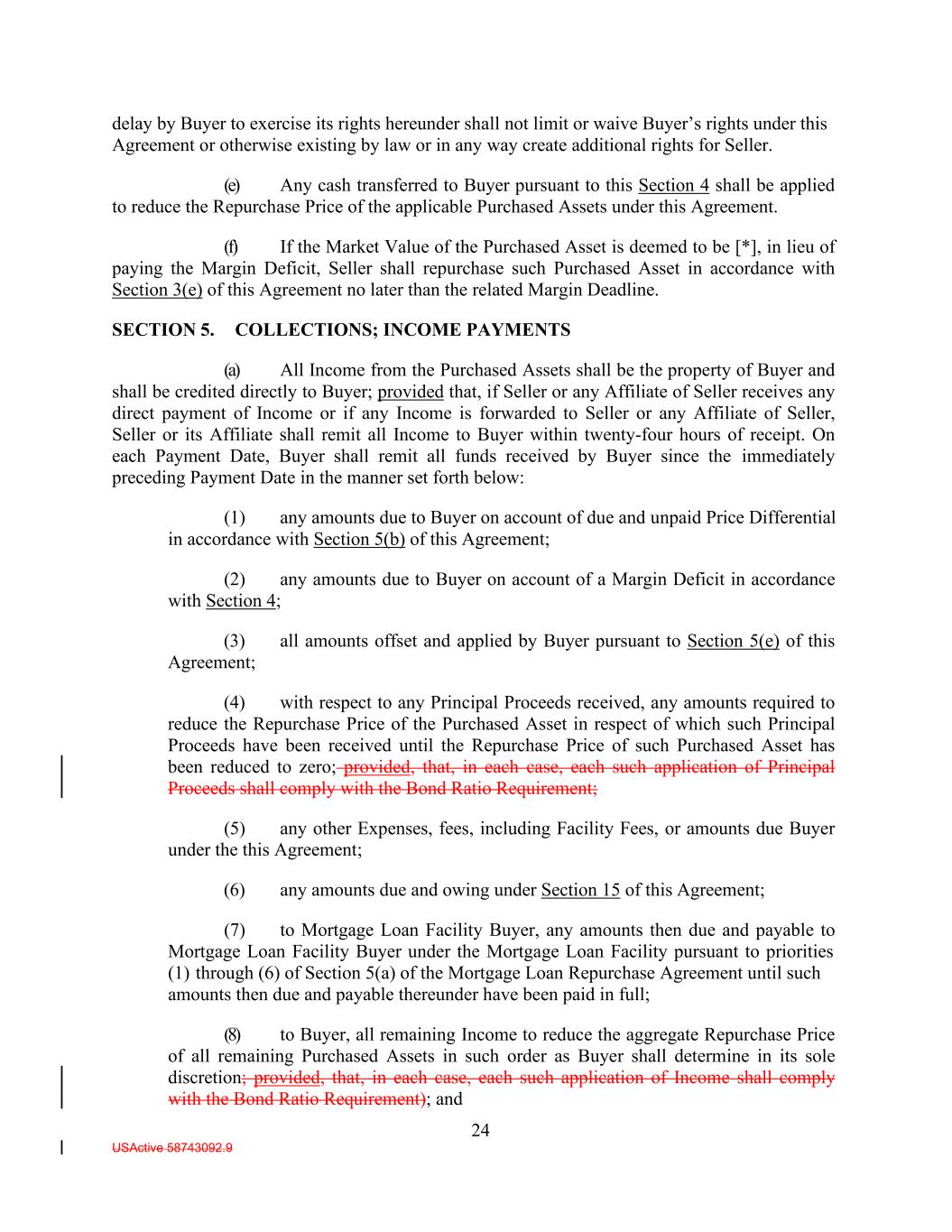 24 USActive 58743092.9 delay by Buyer to exercise its rights hereunder shall not limit or waive Buyer’s rights under this Agreement or otherwise existing by law or in any way create additional rights for Seller. (e) Any cash transferred to Buyer pursuant to this Section 4 shall be applied to reduce the Repurchase Price of the applicable Purchased Assets under this Agreement. (f) If the Market Value of the Purchased Asset is deemed to be [*], in lieu of paying the Margin Deficit, Seller shall repurchase such Purchased Asset in accordance with Section 3(e) of this Agreement no later than the related Margin Deadline. SECTION 5. COLLECTIONS; INCOME PAYMENTS (a) All Income from the Purchased Assets shall be the property of Buyer and shall be credited directly to Buyer; provided that, if Seller or any Affiliate of Seller receives any direct payment of Income or if any Income is forwarded to Seller or any Affiliate of Seller, Seller or its Affiliate shall remit all Income to Buyer within twenty-four hours of receipt. On each Payment Date, Buyer shall remit all funds received by Buyer since the immediately preceding Payment Date in the manner set forth below: (1) any amounts due to Buyer on account of due and unpaid Price Differential in accordance with Section 5(b) of this Agreement; (2) any amounts due to Buyer on account of a Margin Deficit in accordance with Section 4; (3) all amounts offset and applied by Buyer pursuant to Section 5(e) of this Agreement; (4) with respect to any Principal Proceeds received, any amounts required to reduce the Repurchase Price of the Purchased Asset in respect of which such Principal Proceeds have been received until the Repurchase Price of such Purchased Asset has been reduced to zero; provided, that, in each case, each such application of Principal Proceeds shall comply with the Bond Ratio Requirement; (5) any other Expenses, fees, including Facility Fees, or amounts due Buyer under the this Agreement; (6) any amounts due and owing under Section 15 of this Agreement; (7) to Mortgage Loan Facility Buyer, any amounts then due and payable to Mortgage Loan Facility Buyer under the Mortgage Loan Facility pursuant to priorities (1) through (6) of Section 5(a) of the Mortgage Loan Repurchase Agreement until such amounts then due and payable thereunder have been paid in full; (8) to Buyer, all remaining Income to reduce the aggregate Repurchase Price of all remaining Purchased Assets in such order as Buyer shall determine in its sole discretion; provided, that, in each case, each such application of Income shall comply with the Bond Ratio Requirement); and