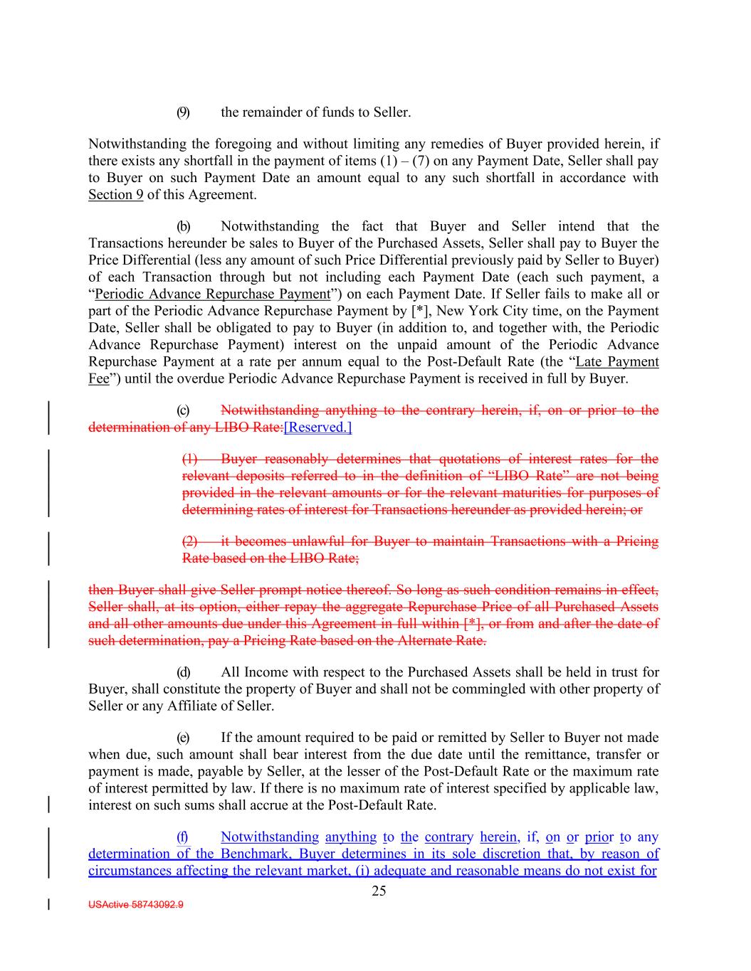 25 USActive 58743092.9 (9) the remainder of funds to Seller. Notwithstanding the foregoing and without limiting any remedies of Buyer provided herein, if there exists any shortfall in the payment of items (1) – (7) on any Payment Date, Seller shall pay to Buyer on such Payment Date an amount equal to any such shortfall in accordance with Section 9 of this Agreement. (b) Notwithstanding the fact that Buyer and Seller intend that the Transactions hereunder be sales to Buyer of the Purchased Assets, Seller shall pay to Buyer the Price Differential (less any amount of such Price Differential previously paid by Seller to Buyer) of each Transaction through but not including each Payment Date (each such payment, a “Periodic Advance Repurchase Payment”) on each Payment Date. If Seller fails to make all or part of the Periodic Advance Repurchase Payment by [*], New York City time, on the Payment Date, Seller shall be obligated to pay to Buyer (in addition to, and together with, the Periodic Advance Repurchase Payment) interest on the unpaid amount of the Periodic Advance Repurchase Payment at a rate per annum equal to the Post-Default Rate (the “Late Payment Fee”) until the overdue Periodic Advance Repurchase Payment is received in full by Buyer. (c) Notwithstanding anything to the contrary herein, if, on or prior to the determination of any LIBO Rate:[Reserved.] (1) Buyer reasonably determines that quotations of interest rates for the relevant deposits referred to in the definition of “LIBO Rate” are not being provided in the relevant amounts or for the relevant maturities for purposes of determining rates of interest for Transactions hereunder as provided herein; or (2) it becomes unlawful for Buyer to maintain Transactions with a Pricing Rate based on the LIBO Rate; then Buyer shall give Seller prompt notice thereof. So long as such condition remains in effect, Seller shall, at its option, either repay the aggregate Repurchase Price of all Purchased Assets and all other amounts due under this Agreement in full within [*], or from and after the date of such determination, pay a Pricing Rate based on the Alternate Rate. (d) All Income with respect to the Purchased Assets shall be held in trust for Buyer, shall constitute the property of Buyer and shall not be commingled with other property of Seller or any Affiliate of Seller. (e) If the amount required to be paid or remitted by Seller to Buyer not made when due, such amount shall bear interest from the due date until the remittance, transfer or payment is made, payable by Seller, at the lesser of the Post-Default Rate or the maximum rate of interest permitted by law. If there is no maximum rate of interest specified by applicable law, interest on such sums shall accrue at the Post-Default Rate. (f) Notwithstanding anything to the contrary herein, if, on or prior to any determination of the Benchmark, Buyer determines in its sole discretion that, by reason of circumstances affecting the relevant market, (i) adequate and reasonable means do not exist for