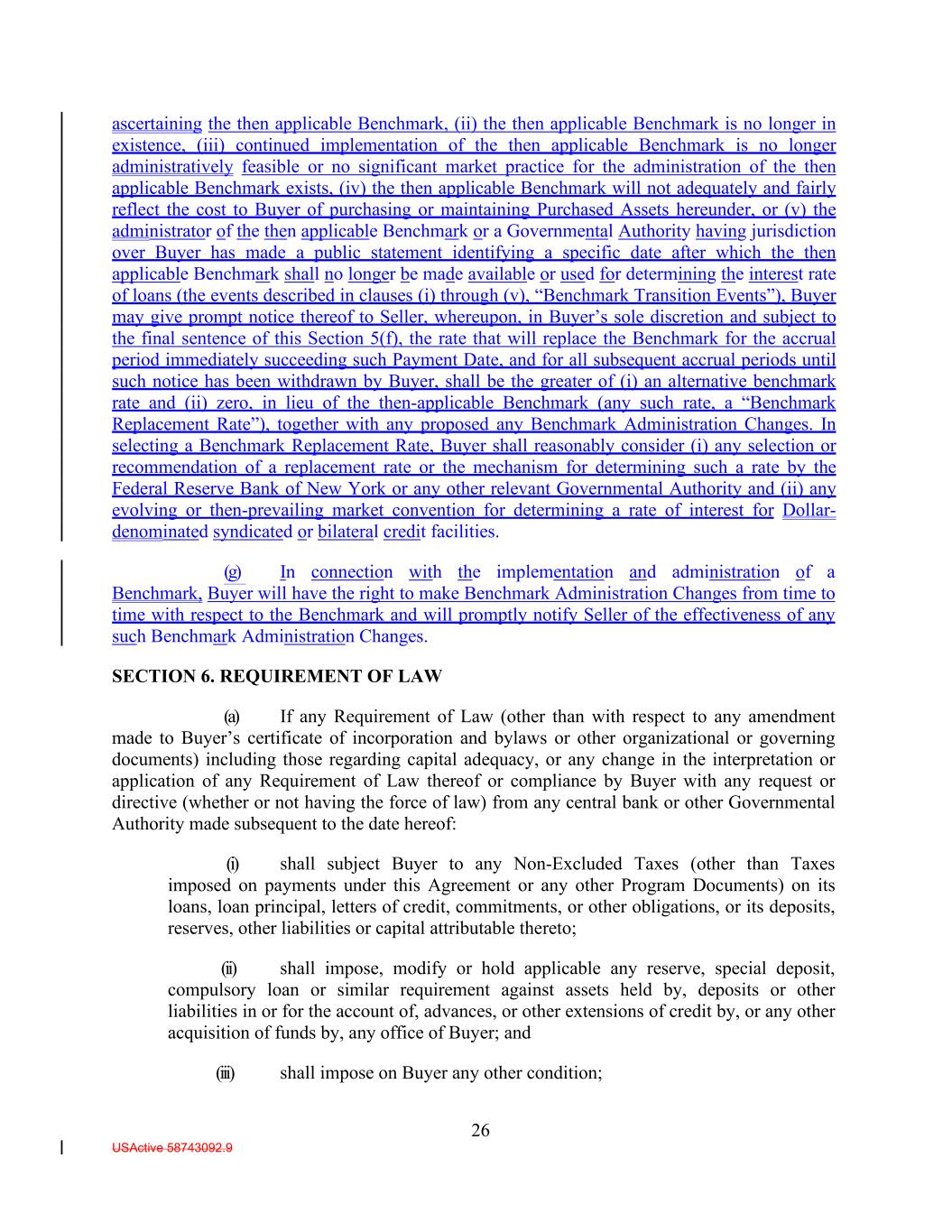 26 USActive 58743092.9 ascertaining the then applicable Benchmark, (ii) the then applicable Benchmark is no longer in existence, (iii) continued implementation of the then applicable Benchmark is no longer administratively feasible or no significant market practice for the administration of the then applicable Benchmark exists, (iv) the then applicable Benchmark will not adequately and fairly reflect the cost to Buyer of purchasing or maintaining Purchased Assets hereunder, or (v) the administrator of the then applicable Benchmark or a Governmental Authority having jurisdiction over Buyer has made a public statement identifying a specific date after which the then applicable Benchmark shall no longer be made available or used for determining the interest rate of loans (the events described in clauses (i) through (v), “Benchmark Transition Events”), Buyer may give prompt notice thereof to Seller, whereupon, in Buyer’s sole discretion and subject to the final sentence of this Section 5(f), the rate that will replace the Benchmark for the accrual period immediately succeeding such Payment Date, and for all subsequent accrual periods until such notice has been withdrawn by Buyer, shall be the greater of (i) an alternative benchmark rate and (ii) zero, in lieu of the then-applicable Benchmark (any such rate, a “Benchmark Replacement Rate”), together with any proposed any Benchmark Administration Changes. In selecting a Benchmark Replacement Rate, Buyer shall reasonably consider (i) any selection or recommendation of a replacement rate or the mechanism for determining such a rate by the Federal Reserve Bank of New York or any other relevant Governmental Authority and (ii) any evolving or then-prevailing market convention for determining a rate of interest for Dollar- denominated syndicated or bilateral credit facilities. (g) In connection with the implementation and administration of a Benchmark, Buyer will have the right to make Benchmark Administration Changes from time to time with respect to the Benchmark and will promptly notify Seller of the effectiveness of any such Benchmark Administration Changes. SECTION 6. REQUIREMENT OF LAW (a) If any Requirement of Law (other than with respect to any amendment made to Buyer’s certificate of incorporation and bylaws or other organizational or governing documents) including those regarding capital adequacy, or any change in the interpretation or application of any Requirement of Law thereof or compliance by Buyer with any request or directive (whether or not having the force of law) from any central bank or other Governmental Authority made subsequent to the date hereof: (i) shall subject Buyer to any Non-Excluded Taxes (other than Taxes imposed on payments under this Agreement or any other Program Documents) on its loans, loan principal, letters of credit, commitments, or other obligations, or its deposits, reserves, other liabilities or capital attributable thereto; (ii) shall impose, modify or hold applicable any reserve, special deposit, compulsory loan or similar requirement against assets held by, deposits or other liabilities in or for the account of, advances, or other extensions of credit by, or any other acquisition of funds by, any office of Buyer; and (iii) shall impose on Buyer any other condition;