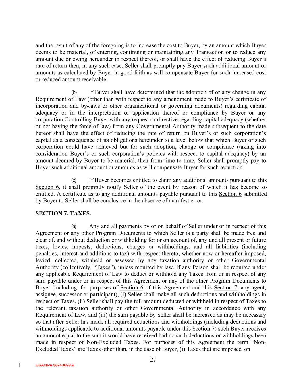 27 USActive 58743092.9 and the result of any of the foregoing is to increase the cost to Buyer, by an amount which Buyer deems to be material, of entering, continuing or maintaining any Transaction or to reduce any amount due or owing hereunder in respect thereof, or shall have the effect of reducing Buyer’s rate of return then, in any such case, Seller shall promptly pay Buyer such additional amount or amounts as calculated by Buyer in good faith as will compensate Buyer for such increased cost or reduced amount receivable. (b) If Buyer shall have determined that the adoption of or any change in any Requirement of Law (other than with respect to any amendment made to Buyer’s certificate of incorporation and by-laws or other organizational or governing documents) regarding capital adequacy or in the interpretation or application thereof or compliance by Buyer or any corporation Controlling Buyer with any request or directive regarding capital adequacy (whether or not having the force of law) from any Governmental Authority made subsequent to the date hereof shall have the effect of reducing the rate of return on Buyer’s or such corporation’s capital as a consequence of its obligations hereunder to a level below that which Buyer or such corporation could have achieved but for such adoption, change or compliance (taking into consideration Buyer’s or such corporation’s policies with respect to capital adequacy) by an amount deemed by Buyer to be material, then from time to time, Seller shall promptly pay to Buyer such additional amount or amounts as will compensate Buyer for such reduction. (c) If Buyer becomes entitled to claim any additional amounts pursuant to this Section 6, it shall promptly notify Seller of the event by reason of which it has become so entitled. A certificate as to any additional amounts payable pursuant to this Section 6 submitted by Buyer to Seller shall be conclusive in the absence of manifest error. SECTION 7. TAXES. (a) Any and all payments by or on behalf of Seller under or in respect of this Agreement or any other Program Documents to which Seller is a party shall be made free and clear of, and without deduction or withholding for or on account of, any and all present or future taxes, levies, imposts, deductions, charges or withholdings, and all liabilities (including penalties, interest and additions to tax) with respect thereto, whether now or hereafter imposed, levied, collected, withheld or assessed by any taxation authority or other Governmental Authority (collectively, “Taxes”), unless required by law. If any Person shall be required under any applicable Requirement of Law to deduct or withhold any Taxes from or in respect of any sum payable under or in respect of this Agreement or any of the other Program Documents to Buyer (including, for purposes of Section 6 of this Agreement and this Section 7, any agent, assignee, successor or participant), (i) Seller shall make all such deductions and withholdings in respect of Taxes, (ii) Seller shall pay the full amount deducted or withheld in respect of Taxes to the relevant taxation authority or other Governmental Authority in accordance with any Requirement of Law, and (iii) the sum payable by Seller shall be increased as may be necessary so that after Seller has made all required deductions and withholdings (including deductions and withholdings applicable to additional amounts payable under this Section 7) such Buyer receives an amount equal to the sum it would have received had no such deductions or withholdings been made in respect of Non-Excluded Taxes. For purposes of this Agreement the term “Non- Excluded Taxes” are Taxes other than, in the case of Buyer, (i) Taxes that are imposed on