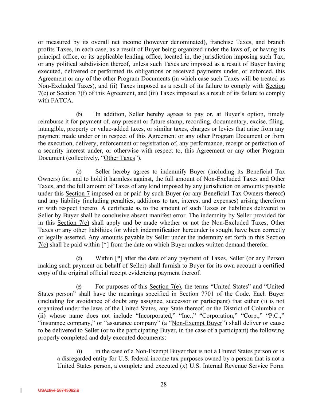 28 USActive 58743092.9 or measured by its overall net income (however denominated), franchise Taxes, and branch profits Taxes, in each case, as a result of Buyer being organized under the laws of, or having its principal office, or its applicable lending office, located in, the jurisdiction imposing such Tax, or any political subdivision thereof, unless such Taxes are imposed as a result of Buyer having executed, delivered or performed its obligations or received payments under, or enforced, this Agreement or any of the other Program Documents (in which case such Taxes will be treated as Non-Excluded Taxes), and (ii) Taxes imposed as a result of its failure to comply with Section 7(e) or Section 7(f) of this Agreement, and (iii) Taxes imposed as a result of its failure to comply with FATCA. (b) In addition, Seller hereby agrees to pay or, at Buyer’s option, timely reimburse it for payment of, any present or future stamp, recording, documentary, excise, filing, intangible, property or value-added taxes, or similar taxes, charges or levies that arise from any payment made under or in respect of this Agreement or any other Program Document or from the execution, delivery, enforcement or registration of, any performance, receipt or perfection of a security interest under, or otherwise with respect to, this Agreement or any other Program Document (collectively, “Other Taxes”). (c) Seller hereby agrees to indemnify Buyer (including its Beneficial Tax Owners) for, and to hold it harmless against, the full amount of Non-Excluded Taxes and Other Taxes, and the full amount of Taxes of any kind imposed by any jurisdiction on amounts payable under this Section 7 imposed on or paid by such Buyer (or any Beneficial Tax Owners thereof) and any liability (including penalties, additions to tax, interest and expenses) arising therefrom or with respect thereto. A certificate as to the amount of such Taxes or liabilities delivered to Seller by Buyer shall be conclusive absent manifest error. The indemnity by Seller provided for in this Section 7(c) shall apply and be made whether or not the Non-Excluded Taxes, Other Taxes or any other liabilities for which indemnification hereunder is sought have been correctly or legally asserted. Any amounts payable by Seller under the indemnity set forth in this Section 7(c) shall be paid within [*] from the date on which Buyer makes written demand therefor. (d) Within [*] after the date of any payment of Taxes, Seller (or any Person making such payment on behalf of Seller) shall furnish to Buyer for its own account a certified copy of the original official receipt evidencing payment thereof. (e) For purposes of this Section 7(e), the terms “United States” and “United States person” shall have the meanings specified in Section 7701 of the Code. Each Buyer (including for avoidance of doubt any assignee, successor or participant) that either (i) is not organized under the laws of the United States, any State thereof, or the District of Columbia or (ii) whose name does not include “Incorporated,” “Inc.,” “Corporation,” “Corp.,” “P.C.,” “insurance company,” or “assurance company” (a “Non-Exempt Buyer”) shall deliver or cause to be delivered to Seller (or to the participating Buyer, in the case of a participant) the following properly completed and duly executed documents: (i) in the case of a Non-Exempt Buyer that is not a United States person or is a disregarded entity for U.S. federal income tax purposes owned by a person that is not a United States person, a complete and executed (x) U.S. Internal Revenue Service Form