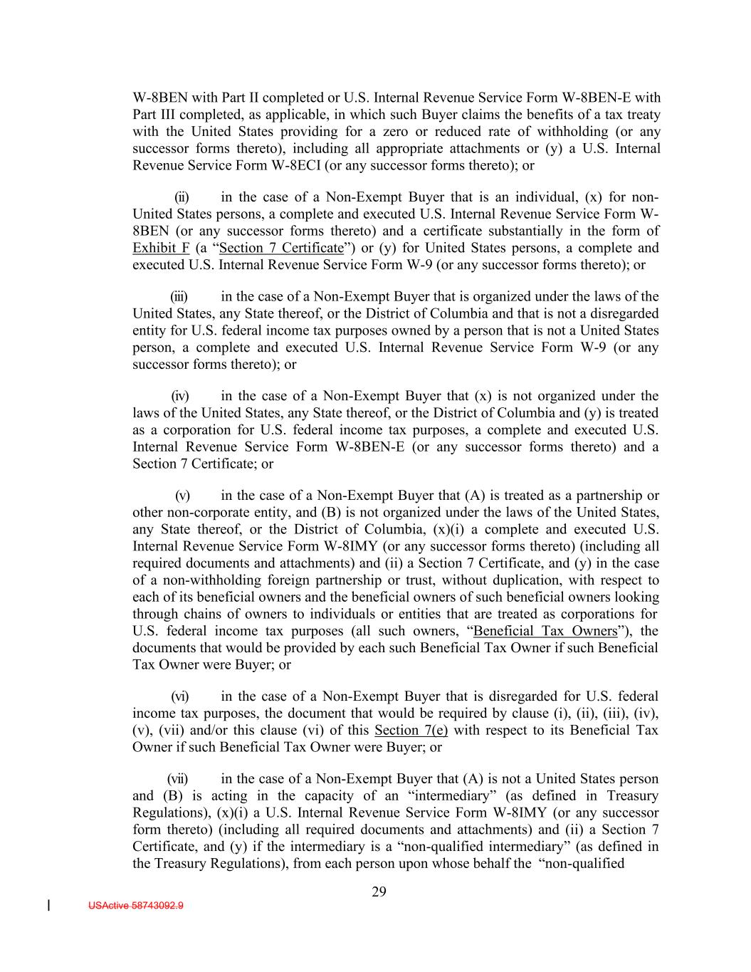 29 USActive 58743092.9 W-8BEN with Part II completed or U.S. Internal Revenue Service Form W-8BEN-E with Part III completed, as applicable, in which such Buyer claims the benefits of a tax treaty with the United States providing for a zero or reduced rate of withholding (or any successor forms thereto), including all appropriate attachments or (y) a U.S. Internal Revenue Service Form W-8ECI (or any successor forms thereto); or (ii) in the case of a Non-Exempt Buyer that is an individual, (x) for non- United States persons, a complete and executed U.S. Internal Revenue Service Form W- 8BEN (or any successor forms thereto) and a certificate substantially in the form of Exhibit F (a “Section 7 Certificate”) or (y) for United States persons, a complete and executed U.S. Internal Revenue Service Form W-9 (or any successor forms thereto); or (iii) in the case of a Non-Exempt Buyer that is organized under the laws of the United States, any State thereof, or the District of Columbia and that is not a disregarded entity for U.S. federal income tax purposes owned by a person that is not a United States person, a complete and executed U.S. Internal Revenue Service Form W-9 (or any successor forms thereto); or (iv) in the case of a Non-Exempt Buyer that (x) is not organized under the laws of the United States, any State thereof, or the District of Columbia and (y) is treated as a corporation for U.S. federal income tax purposes, a complete and executed U.S. Internal Revenue Service Form W-8BEN-E (or any successor forms thereto) and a Section 7 Certificate; or (v) in the case of a Non-Exempt Buyer that (A) is treated as a partnership or other non-corporate entity, and (B) is not organized under the laws of the United States, any State thereof, or the District of Columbia, (x)(i) a complete and executed U.S. Internal Revenue Service Form W-8IMY (or any successor forms thereto) (including all required documents and attachments) and (ii) a Section 7 Certificate, and (y) in the case of a non-withholding foreign partnership or trust, without duplication, with respect to each of its beneficial owners and the beneficial owners of such beneficial owners looking through chains of owners to individuals or entities that are treated as corporations for U.S. federal income tax purposes (all such owners, “Beneficial Tax Owners”), the documents that would be provided by each such Beneficial Tax Owner if such Beneficial Tax Owner were Buyer; or (vi) in the case of a Non-Exempt Buyer that is disregarded for U.S. federal income tax purposes, the document that would be required by clause (i), (ii), (iii), (iv), (v), (vii) and/or this clause (vi) of this Section 7(e) with respect to its Beneficial Tax Owner if such Beneficial Tax Owner were Buyer; or (vii) in the case of a Non-Exempt Buyer that (A) is not a United States person and (B) is acting in the capacity of an “intermediary” (as defined in Treasury Regulations), (x)(i) a U.S. Internal Revenue Service Form W-8IMY (or any successor form thereto) (including all required documents and attachments) and (ii) a Section 7 Certificate, and (y) if the intermediary is a “non-qualified intermediary” (as defined in the Treasury Regulations), from each person upon whose behalf the “non-qualified