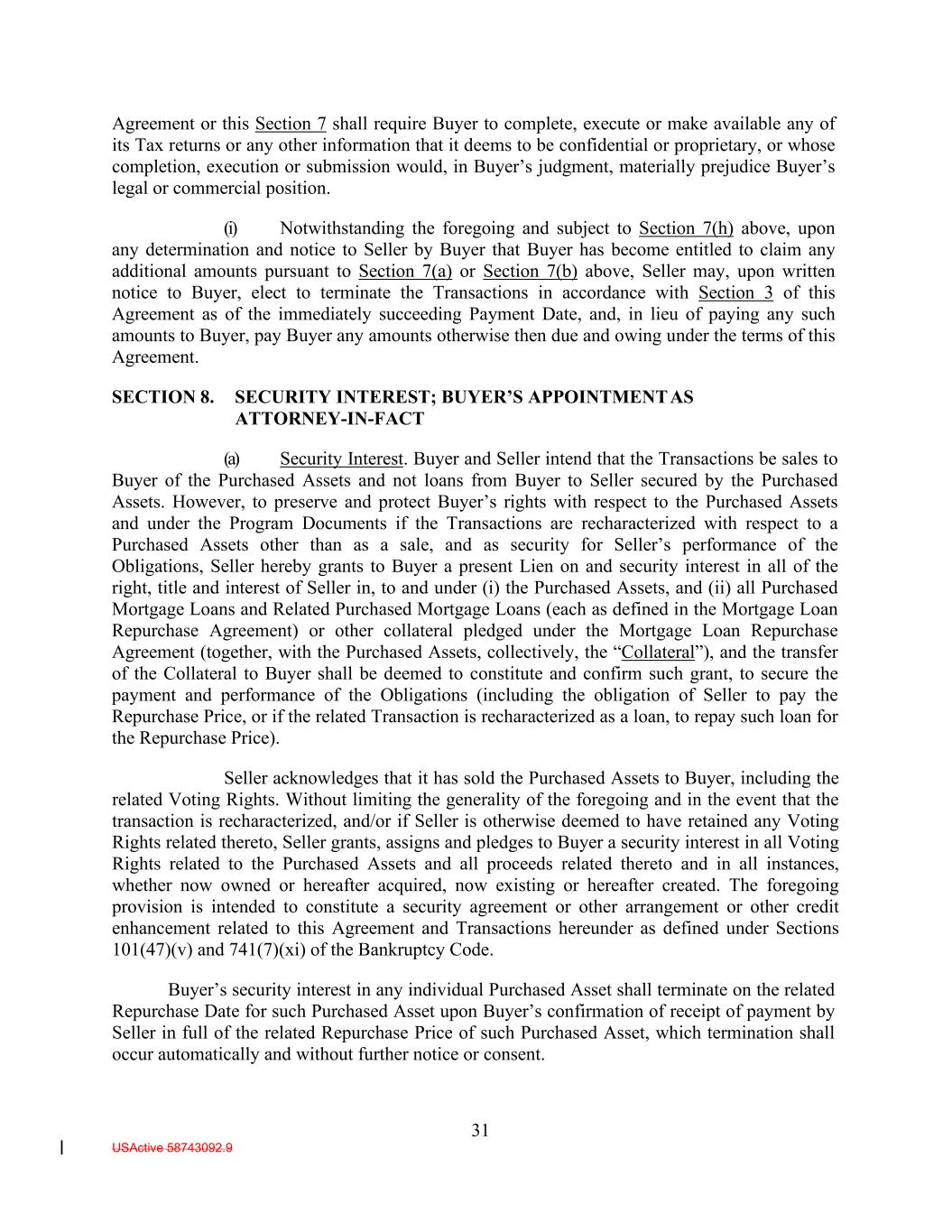 31 USActive 58743092.9 Agreement or this Section 7 shall require Buyer to complete, execute or make available any of its Tax returns or any other information that it deems to be confidential or proprietary, or whose completion, execution or submission would, in Buyer’s judgment, materially prejudice Buyer’s legal or commercial position. (i) Notwithstanding the foregoing and subject to Section 7(h) above, upon any determination and notice to Seller by Buyer that Buyer has become entitled to claim any additional amounts pursuant to Section 7(a) or Section 7(b) above, Seller may, upon written notice to Buyer, elect to terminate the Transactions in accordance with Section 3 of this Agreement as of the immediately succeeding Payment Date, and, in lieu of paying any such amounts to Buyer, pay Buyer any amounts otherwise then due and owing under the terms of this Agreement. SECTION 8. SECURITY INTEREST; BUYER’S APPOINTMENT AS ATTORNEY-IN-FACT (a) Security Interest. Buyer and Seller intend that the Transactions be sales to Buyer of the Purchased Assets and not loans from Buyer to Seller secured by the Purchased Assets. However, to preserve and protect Buyer’s rights with respect to the Purchased Assets and under the Program Documents if the Transactions are recharacterized with respect to a Purchased Assets other than as a sale, and as security for Seller’s performance of the Obligations, Seller hereby grants to Buyer a present Lien on and security interest in all of the right, title and interest of Seller in, to and under (i) the Purchased Assets, and (ii) all Purchased Mortgage Loans and Related Purchased Mortgage Loans (each as defined in the Mortgage Loan Repurchase Agreement) or other collateral pledged under the Mortgage Loan Repurchase Agreement (together, with the Purchased Assets, collectively, the “Collateral”), and the transfer of the Collateral to Buyer shall be deemed to constitute and confirm such grant, to secure the payment and performance of the Obligations (including the obligation of Seller to pay the Repurchase Price, or if the related Transaction is recharacterized as a loan, to repay such loan for the Repurchase Price). Seller acknowledges that it has sold the Purchased Assets to Buyer, including the related Voting Rights. Without limiting the generality of the foregoing and in the event that the transaction is recharacterized, and/or if Seller is otherwise deemed to have retained any Voting Rights related thereto, Seller grants, assigns and pledges to Buyer a security interest in all Voting Rights related to the Purchased Assets and all proceeds related thereto and in all instances, whether now owned or hereafter acquired, now existing or hereafter created. The foregoing provision is intended to constitute a security agreement or other arrangement or other credit enhancement related to this Agreement and Transactions hereunder as defined under Sections 101(47)(v) and 741(7)(xi) of the Bankruptcy Code. Buyer’s security interest in any individual Purchased Asset shall terminate on the related Repurchase Date for such Purchased Asset upon Buyer’s confirmation of receipt of payment by Seller in full of the related Repurchase Price of such Purchased Asset, which termination shall occur automatically and without further notice or consent.