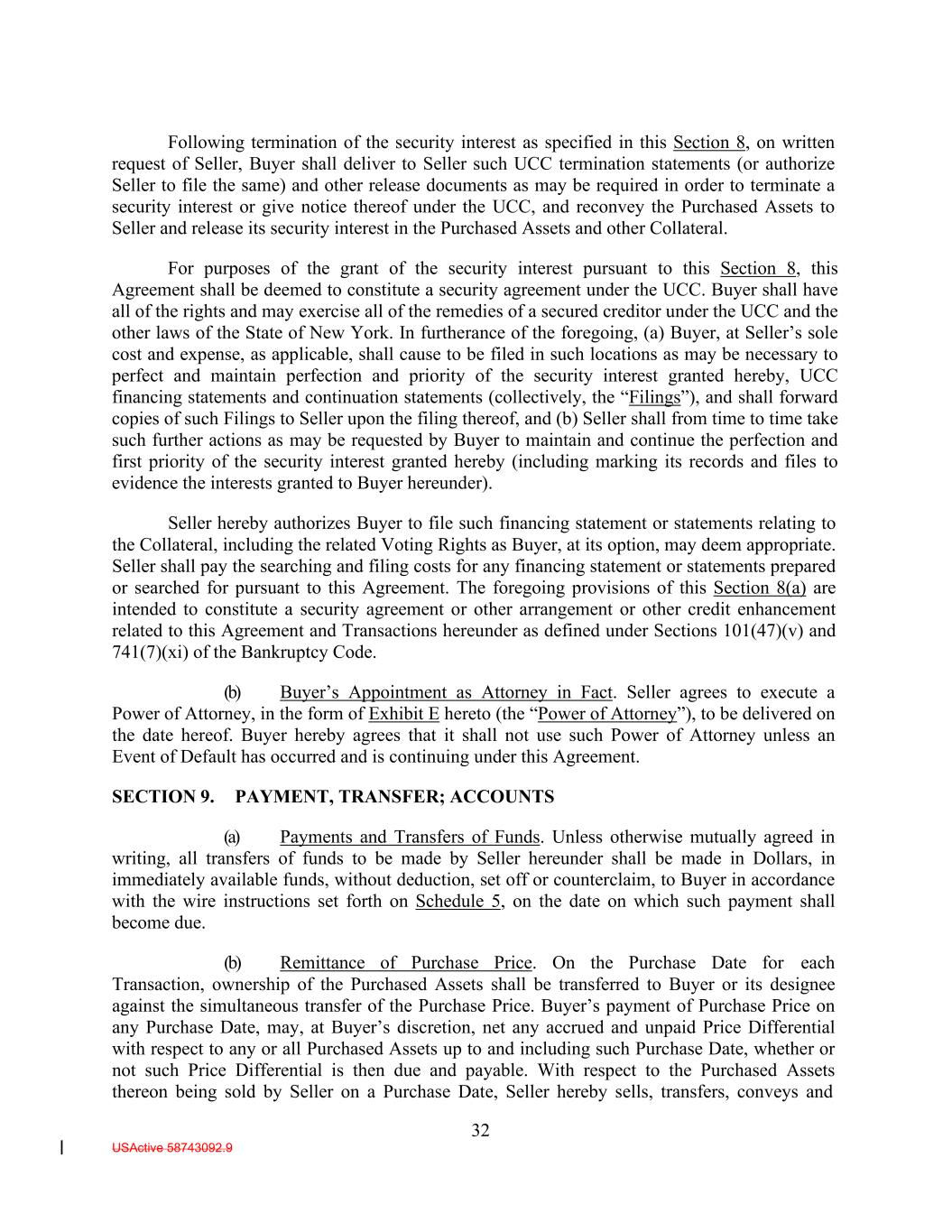 32 USActive 58743092.9 Following termination of the security interest as specified in this Section 8, on written request of Seller, Buyer shall deliver to Seller such UCC termination statements (or authorize Seller to file the same) and other release documents as may be required in order to terminate a security interest or give notice thereof under the UCC, and reconvey the Purchased Assets to Seller and release its security interest in the Purchased Assets and other Collateral. For purposes of the grant of the security interest pursuant to this Section 8, this Agreement shall be deemed to constitute a security agreement under the UCC. Buyer shall have all of the rights and may exercise all of the remedies of a secured creditor under the UCC and the other laws of the State of New York. In furtherance of the foregoing, (a) Buyer, at Seller’s sole cost and expense, as applicable, shall cause to be filed in such locations as may be necessary to perfect and maintain perfection and priority of the security interest granted hereby, UCC financing statements and continuation statements (collectively, the “Filings”), and shall forward copies of such Filings to Seller upon the filing thereof, and (b) Seller shall from time to time take such further actions as may be requested by Buyer to maintain and continue the perfection and first priority of the security interest granted hereby (including marking its records and files to evidence the interests granted to Buyer hereunder). Seller hereby authorizes Buyer to file such financing statement or statements relating to the Collateral, including the related Voting Rights as Buyer, at its option, may deem appropriate. Seller shall pay the searching and filing costs for any financing statement or statements prepared or searched for pursuant to this Agreement. The foregoing provisions of this Section 8(a) are intended to constitute a security agreement or other arrangement or other credit enhancement related to this Agreement and Transactions hereunder as defined under Sections 101(47)(v) and 741(7)(xi) of the Bankruptcy Code. (b) Buyer’s Appointment as Attorney in Fact. Seller agrees to execute a Power of Attorney, in the form of Exhibit E hereto (the “Power of Attorney”), to be delivered on the date hereof. Buyer hereby agrees that it shall not use such Power of Attorney unless an Event of Default has occurred and is continuing under this Agreement. SECTION 9. PAYMENT, TRANSFER; ACCOUNTS (a) Payments and Transfers of Funds. Unless otherwise mutually agreed in writing, all transfers of funds to be made by Seller hereunder shall be made in Dollars, in immediately available funds, without deduction, set off or counterclaim, to Buyer in accordance with the wire instructions set forth on Schedule 5, on the date on which such payment shall become due. (b) Remittance of Purchase Price. On the Purchase Date for each Transaction, ownership of the Purchased Assets shall be transferred to Buyer or its designee against the simultaneous transfer of the Purchase Price. Buyer’s payment of Purchase Price on any Purchase Date, may, at Buyer’s discretion, net any accrued and unpaid Price Differential with respect to any or all Purchased Assets up to and including such Purchase Date, whether or not such Price Differential is then due and payable. With respect to the Purchased Assets thereon being sold by Seller on a Purchase Date, Seller hereby sells, transfers, conveys and
