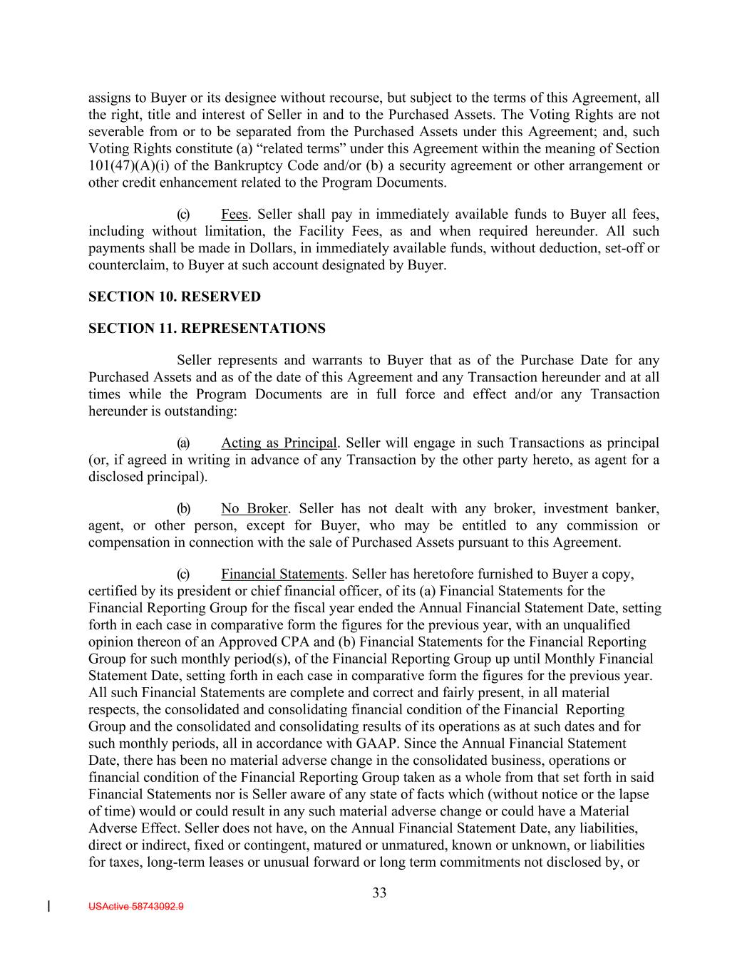 33 USActive 58743092.9 assigns to Buyer or its designee without recourse, but subject to the terms of this Agreement, all the right, title and interest of Seller in and to the Purchased Assets. The Voting Rights are not severable from or to be separated from the Purchased Assets under this Agreement; and, such Voting Rights constitute (a) “related terms” under this Agreement within the meaning of Section 101(47)(A)(i) of the Bankruptcy Code and/or (b) a security agreement or other arrangement or other credit enhancement related to the Program Documents. (c) Fees. Seller shall pay in immediately available funds to Buyer all fees, including without limitation, the Facility Fees, as and when required hereunder. All such payments shall be made in Dollars, in immediately available funds, without deduction, set-off or counterclaim, to Buyer at such account designated by Buyer. SECTION 10. RESERVED SECTION 11. REPRESENTATIONS Seller represents and warrants to Buyer that as of the Purchase Date for any Purchased Assets and as of the date of this Agreement and any Transaction hereunder and at all times while the Program Documents are in full force and effect and/or any Transaction hereunder is outstanding: (a) Acting as Principal. Seller will engage in such Transactions as principal (or, if agreed in writing in advance of any Transaction by the other party hereto, as agent for a disclosed principal). (b) No Broker. Seller has not dealt with any broker, investment banker, agent, or other person, except for Buyer, who may be entitled to any commission or compensation in connection with the sale of Purchased Assets pursuant to this Agreement. (c) Financial Statements. Seller has heretofore furnished to Buyer a copy, certified by its president or chief financial officer, of its (a) Financial Statements for the Financial Reporting Group for the fiscal year ended the Annual Financial Statement Date, setting forth in each case in comparative form the figures for the previous year, with an unqualified opinion thereon of an Approved CPA and (b) Financial Statements for the Financial Reporting Group for such monthly period(s), of the Financial Reporting Group up until Monthly Financial Statement Date, setting forth in each case in comparative form the figures for the previous year. All such Financial Statements are complete and correct and fairly present, in all material respects, the consolidated and consolidating financial condition of the Financial Reporting Group and the consolidated and consolidating results of its operations as at such dates and for such monthly periods, all in accordance with GAAP. Since the Annual Financial Statement Date, there has been no material adverse change in the consolidated business, operations or financial condition of the Financial Reporting Group taken as a whole from that set forth in said Financial Statements nor is Seller aware of any state of facts which (without notice or the lapse of time) would or could result in any such material adverse change or could have a Material Adverse Effect. Seller does not have, on the Annual Financial Statement Date, any liabilities, direct or indirect, fixed or contingent, matured or unmatured, known or unknown, or liabilities for taxes, long-term leases or unusual forward or long term commitments not disclosed by, or