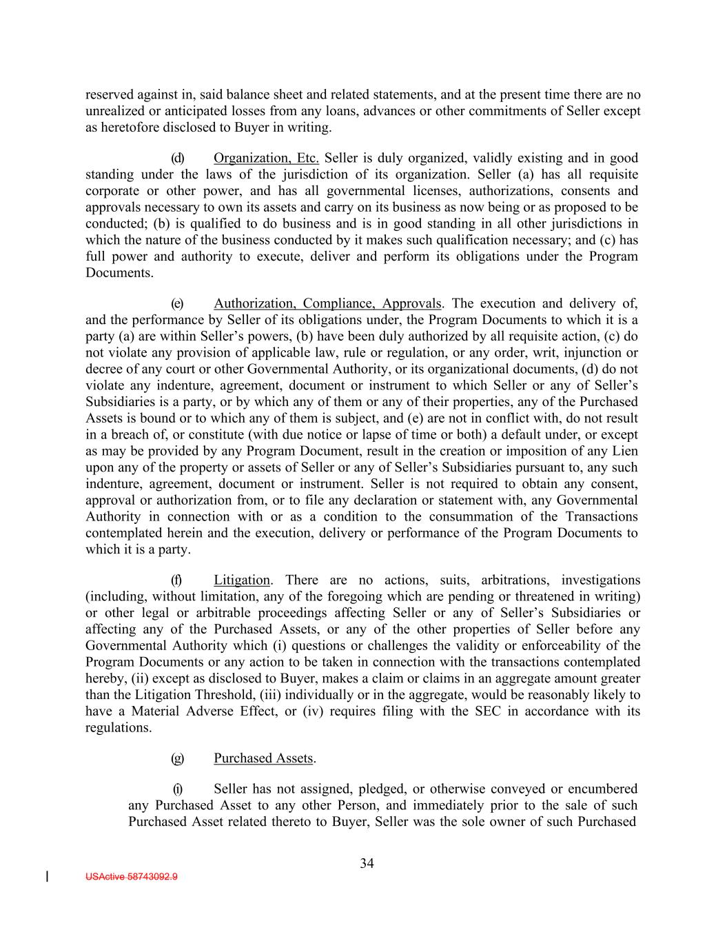 34 USActive 58743092.9 reserved against in, said balance sheet and related statements, and at the present time there are no unrealized or anticipated losses from any loans, advances or other commitments of Seller except as heretofore disclosed to Buyer in writing. (d) Organization, Etc. Seller is duly organized, validly existing and in good standing under the laws of the jurisdiction of its organization. Seller (a) has all requisite corporate or other power, and has all governmental licenses, authorizations, consents and approvals necessary to own its assets and carry on its business as now being or as proposed to be conducted; (b) is qualified to do business and is in good standing in all other jurisdictions in which the nature of the business conducted by it makes such qualification necessary; and (c) has full power and authority to execute, deliver and perform its obligations under the Program Documents. (e) Authorization, Compliance, Approvals. The execution and delivery of, and the performance by Seller of its obligations under, the Program Documents to which it is a party (a) are within Seller’s powers, (b) have been duly authorized by all requisite action, (c) do not violate any provision of applicable law, rule or regulation, or any order, writ, injunction or decree of any court or other Governmental Authority, or its organizational documents, (d) do not violate any indenture, agreement, document or instrument to which Seller or any of Seller’s Subsidiaries is a party, or by which any of them or any of their properties, any of the Purchased Assets is bound or to which any of them is subject, and (e) are not in conflict with, do not result in a breach of, or constitute (with due notice or lapse of time or both) a default under, or except as may be provided by any Program Document, result in the creation or imposition of any Lien upon any of the property or assets of Seller or any of Seller’s Subsidiaries pursuant to, any such indenture, agreement, document or instrument. Seller is not required to obtain any consent, approval or authorization from, or to file any declaration or statement with, any Governmental Authority in connection with or as a condition to the consummation of the Transactions contemplated herein and the execution, delivery or performance of the Program Documents to which it is a party. (f) Litigation. There are no actions, suits, arbitrations, investigations (including, without limitation, any of the foregoing which are pending or threatened in writing) or other legal or arbitrable proceedings affecting Seller or any of Seller’s Subsidiaries or affecting any of the Purchased Assets, or any of the other properties of Seller before any Governmental Authority which (i) questions or challenges the validity or enforceability of the Program Documents or any action to be taken in connection with the transactions contemplated hereby, (ii) except as disclosed to Buyer, makes a claim or claims in an aggregate amount greater than the Litigation Threshold, (iii) individually or in the aggregate, would be reasonably likely to have a Material Adverse Effect, or (iv) requires filing with the SEC in accordance with its regulations. (g) Purchased Assets. (i) Seller has not assigned, pledged, or otherwise conveyed or encumbered any Purchased Asset to any other Person, and immediately prior to the sale of such Purchased Asset related thereto to Buyer, Seller was the sole owner of such Purchased