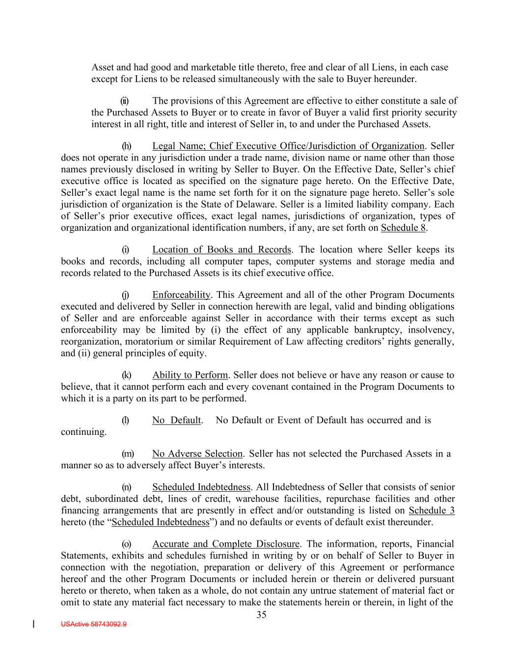 35 USActive 58743092.9 Asset and had good and marketable title thereto, free and clear of all Liens, in each case except for Liens to be released simultaneously with the sale to Buyer hereunder. (ii) The provisions of this Agreement are effective to either constitute a sale of the Purchased Assets to Buyer or to create in favor of Buyer a valid first priority security interest in all right, title and interest of Seller in, to and under the Purchased Assets. (h) Legal Name; Chief Executive Office/Jurisdiction of Organization. Seller does not operate in any jurisdiction under a trade name, division name or name other than those names previously disclosed in writing by Seller to Buyer. On the Effective Date, Seller’s chief executive office is located as specified on the signature page hereto. On the Effective Date, Seller’s exact legal name is the name set forth for it on the signature page hereto. Seller’s sole jurisdiction of organization is the State of Delaware. Seller is a limited liability company. Each of Seller’s prior executive offices, exact legal names, jurisdictions of organization, types of organization and organizational identification numbers, if any, are set forth on Schedule 8. (i) Location of Books and Records. The location where Seller keeps its books and records, including all computer tapes, computer systems and storage media and records related to the Purchased Assets is its chief executive office. (j) Enforceability. This Agreement and all of the other Program Documents executed and delivered by Seller in connection herewith are legal, valid and binding obligations of Seller and are enforceable against Seller in accordance with their terms except as such enforceability may be limited by (i) the effect of any applicable bankruptcy, insolvency, reorganization, moratorium or similar Requirement of Law affecting creditors’ rights generally, and (ii) general principles of equity. (k) Ability to Perform. Seller does not believe or have any reason or cause to believe, that it cannot perform each and every covenant contained in the Program Documents to which it is a party on its part to be performed. (l) No Default. No Default or Event of Default has occurred and is continuing. (m) No Adverse Selection. Seller has not selected the Purchased Assets in a manner so as to adversely affect Buyer’s interests. (n) Scheduled Indebtedness. All Indebtedness of Seller that consists of senior debt, subordinated debt, lines of credit, warehouse facilities, repurchase facilities and other financing arrangements that are presently in effect and/or outstanding is listed on Schedule 3 hereto (the “Scheduled Indebtedness”) and no defaults or events of default exist thereunder. (o) Accurate and Complete Disclosure. The information, reports, Financial Statements, exhibits and schedules furnished in writing by or on behalf of Seller to Buyer in connection with the negotiation, preparation or delivery of this Agreement or performance hereof and the other Program Documents or included herein or therein or delivered pursuant hereto or thereto, when taken as a whole, do not contain any untrue statement of material fact or omit to state any material fact necessary to make the statements herein or therein, in light of the