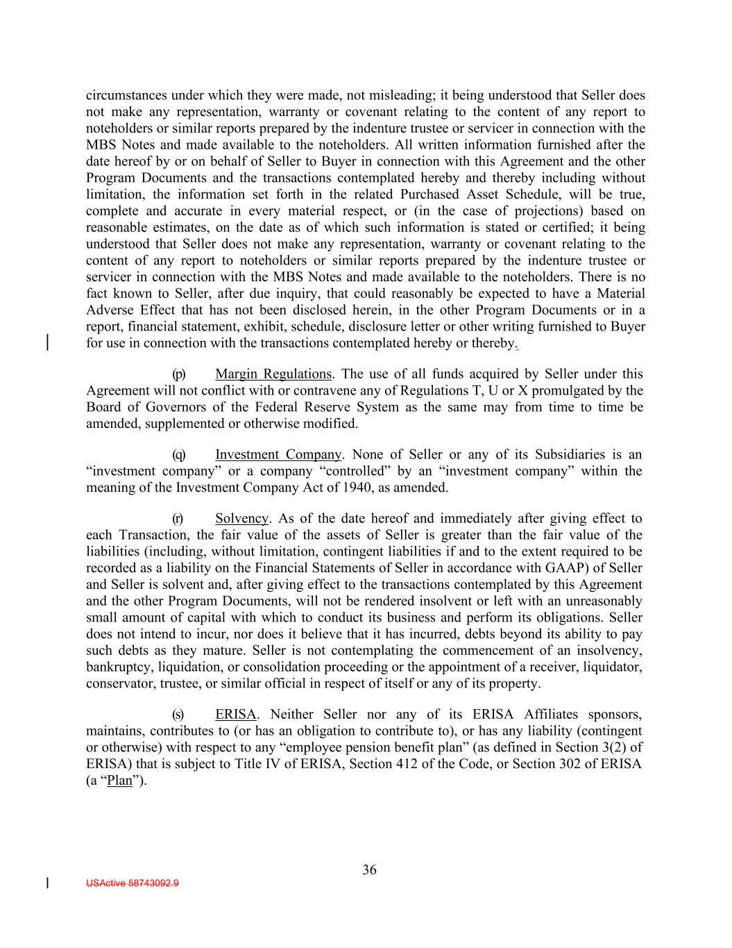 36 USActive 58743092.9 circumstances under which they were made, not misleading; it being understood that Seller does not make any representation, warranty or covenant relating to the content of any report to noteholders or similar reports prepared by the indenture trustee or servicer in connection with the MBS Notes and made available to the noteholders. All written information furnished after the date hereof by or on behalf of Seller to Buyer in connection with this Agreement and the other Program Documents and the transactions contemplated hereby and thereby including without limitation, the information set forth in the related Purchased Asset Schedule, will be true, complete and accurate in every material respect, or (in the case of projections) based on reasonable estimates, on the date as of which such information is stated or certified; it being understood that Seller does not make any representation, warranty or covenant relating to the content of any report to noteholders or similar reports prepared by the indenture trustee or servicer in connection with the MBS Notes and made available to the noteholders. There is no fact known to Seller, after due inquiry, that could reasonably be expected to have a Material Adverse Effect that has not been disclosed herein, in the other Program Documents or in a report, financial statement, exhibit, schedule, disclosure letter or other writing furnished to Buyer for use in connection with the transactions contemplated hereby or thereby. (p) Margin Regulations. The use of all funds acquired by Seller under this Agreement will not conflict with or contravene any of Regulations T, U or X promulgated by the Board of Governors of the Federal Reserve System as the same may from time to time be amended, supplemented or otherwise modified. (q) Investment Company. None of Seller or any of its Subsidiaries is an “investment company” or a company “controlled” by an “investment company” within the meaning of the Investment Company Act of 1940, as amended. (r) Solvency. As of the date hereof and immediately after giving effect to each Transaction, the fair value of the assets of Seller is greater than the fair value of the liabilities (including, without limitation, contingent liabilities if and to the extent required to be recorded as a liability on the Financial Statements of Seller in accordance with GAAP) of Seller and Seller is solvent and, after giving effect to the transactions contemplated by this Agreement and the other Program Documents, will not be rendered insolvent or left with an unreasonably small amount of capital with which to conduct its business and perform its obligations. Seller does not intend to incur, nor does it believe that it has incurred, debts beyond its ability to pay such debts as they mature. Seller is not contemplating the commencement of an insolvency, bankruptcy, liquidation, or consolidation proceeding or the appointment of a receiver, liquidator, conservator, trustee, or similar official in respect of itself or any of its property. (s) ERISA. Neither Seller nor any of its ERISA Affiliates sponsors, maintains, contributes to (or has an obligation to contribute to), or has any liability (contingent or otherwise) with respect to any “employee pension benefit plan” (as defined in Section 3(2) of ERISA) that is subject to Title IV of ERISA, Section 412 of the Code, or Section 302 of ERISA (a “Plan”).