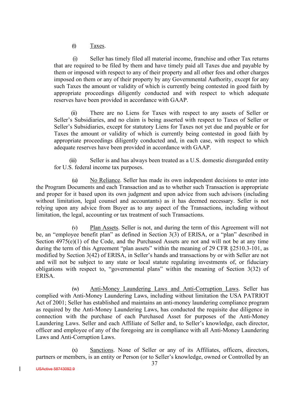 37 USActive 58743092.9 (t) Taxes. (i) Seller has timely filed all material income, franchise and other Tax returns that are required to be filed by them and have timely paid all Taxes due and payable by them or imposed with respect to any of their property and all other fees and other charges imposed on them or any of their property by any Governmental Authority, except for any such Taxes the amount or validity of which is currently being contested in good faith by appropriate proceedings diligently conducted and with respect to which adequate reserves have been provided in accordance with GAAP. (ii) There are no Liens for Taxes with respect to any assets of Seller or Seller’s Subsidiaries, and no claim is being asserted with respect to Taxes of Seller or Seller’s Subsidiaries, except for statutory Liens for Taxes not yet due and payable or for Taxes the amount or validity of which is currently being contested in good faith by appropriate proceedings diligently conducted and, in each case, with respect to which adequate reserves have been provided in accordance with GAAP. (iii) Seller is and has always been treated as a U.S. domestic disregarded entity for U.S. federal income tax purposes. (u) No Reliance. Seller has made its own independent decisions to enter into the Program Documents and each Transaction and as to whether such Transaction is appropriate and proper for it based upon its own judgment and upon advice from such advisors (including without limitation, legal counsel and accountants) as it has deemed necessary. Seller is not relying upon any advice from Buyer as to any aspect of the Transactions, including without limitation, the legal, accounting or tax treatment of such Transactions. (v) Plan Assets. Seller is not, and during the term of this Agreement will not be, an “employee benefit plan” as defined in Section 3(3) of ERISA, or a “plan” described in Section 4975(e)(1) of the Code, and the Purchased Assets are not and will not be at any time during the term of this Agreement “plan assets” within the meaning of 29 CFR §2510.3-101, as modified by Section 3(42) of ERISA, in Seller’s hands and transactions by or with Seller are not and will not be subject to any state or local statute regulating investments of, or fiduciary obligations with respect to, “governmental plans” within the meaning of Section 3(32) of ERISA. (w) Anti-Money Laundering Laws and Anti-Corruption Laws. Seller has complied with Anti-Money Laundering Laws, including without limitation the USA PATRIOT Act of 2001; Seller has established and maintains an anti-money laundering compliance program as required by the Anti-Money Laundering Laws, has conducted the requisite due diligence in connection with the purchase of each Purchased Asset for purposes of the Anti-Money Laundering Laws. Seller and each Affiliate of Seller and, to Seller’s knowledge, each director, officer and employee of any of the foregoing are in compliance with all Anti-Money Laundering Laws and Anti-Corruption Laws. (x) Sanctions. None of Seller or any of its Affiliates, officers, directors, partners or members, is an entity or Person (or to Seller’s knowledge, owned or Controlled by an