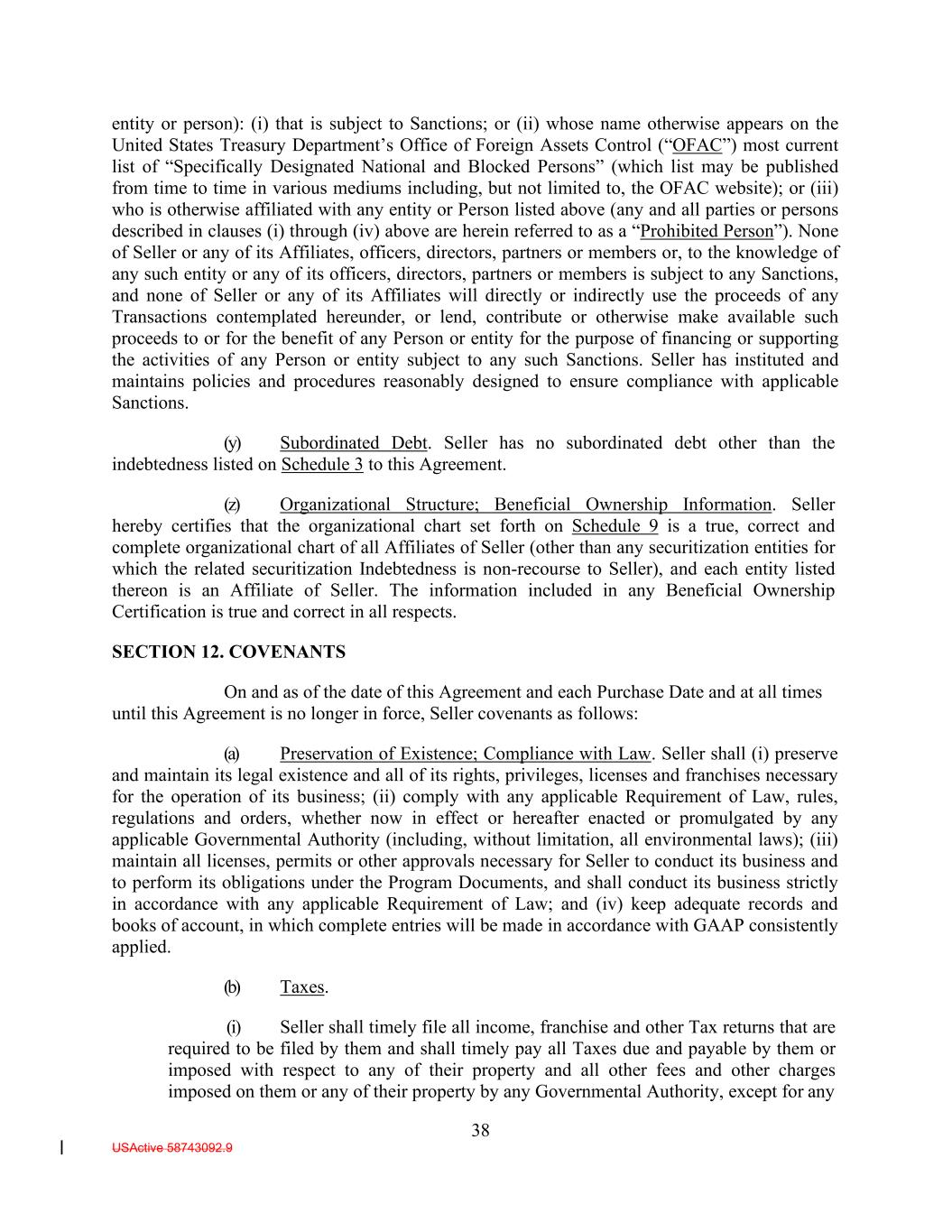 38 USActive 58743092.9 entity or person): (i) that is subject to Sanctions; or (ii) whose name otherwise appears on the United States Treasury Department’s Office of Foreign Assets Control (“OFAC”) most current list of “Specifically Designated National and Blocked Persons” (which list may be published from time to time in various mediums including, but not limited to, the OFAC website); or (iii) who is otherwise affiliated with any entity or Person listed above (any and all parties or persons described in clauses (i) through (iv) above are herein referred to as a “Prohibited Person”). None of Seller or any of its Affiliates, officers, directors, partners or members or, to the knowledge of any such entity or any of its officers, directors, partners or members is subject to any Sanctions, and none of Seller or any of its Affiliates will directly or indirectly use the proceeds of any Transactions contemplated hereunder, or lend, contribute or otherwise make available such proceeds to or for the benefit of any Person or entity for the purpose of financing or supporting the activities of any Person or entity subject to any such Sanctions. Seller has instituted and maintains policies and procedures reasonably designed to ensure compliance with applicable Sanctions. (y) Subordinated Debt. Seller has no subordinated debt other than the indebtedness listed on Schedule 3 to this Agreement. (z) Organizational Structure; Beneficial Ownership Information. Seller hereby certifies that the organizational chart set forth on Schedule 9 is a true, correct and complete organizational chart of all Affiliates of Seller (other than any securitization entities for which the related securitization Indebtedness is non-recourse to Seller), and each entity listed thereon is an Affiliate of Seller. The information included in any Beneficial Ownership Certification is true and correct in all respects. SECTION 12. COVENANTS On and as of the date of this Agreement and each Purchase Date and at all times until this Agreement is no longer in force, Seller covenants as follows: (a) Preservation of Existence; Compliance with Law. Seller shall (i) preserve and maintain its legal existence and all of its rights, privileges, licenses and franchises necessary for the operation of its business; (ii) comply with any applicable Requirement of Law, rules, regulations and orders, whether now in effect or hereafter enacted or promulgated by any applicable Governmental Authority (including, without limitation, all environmental laws); (iii) maintain all licenses, permits or other approvals necessary for Seller to conduct its business and to perform its obligations under the Program Documents, and shall conduct its business strictly in accordance with any applicable Requirement of Law; and (iv) keep adequate records and books of account, in which complete entries will be made in accordance with GAAP consistently applied. (b) Taxes. (i) Seller shall timely file all income, franchise and other Tax returns that are required to be filed by them and shall timely pay all Taxes due and payable by them or imposed with respect to any of their property and all other fees and other charges imposed on them or any of their property by any Governmental Authority, except for any