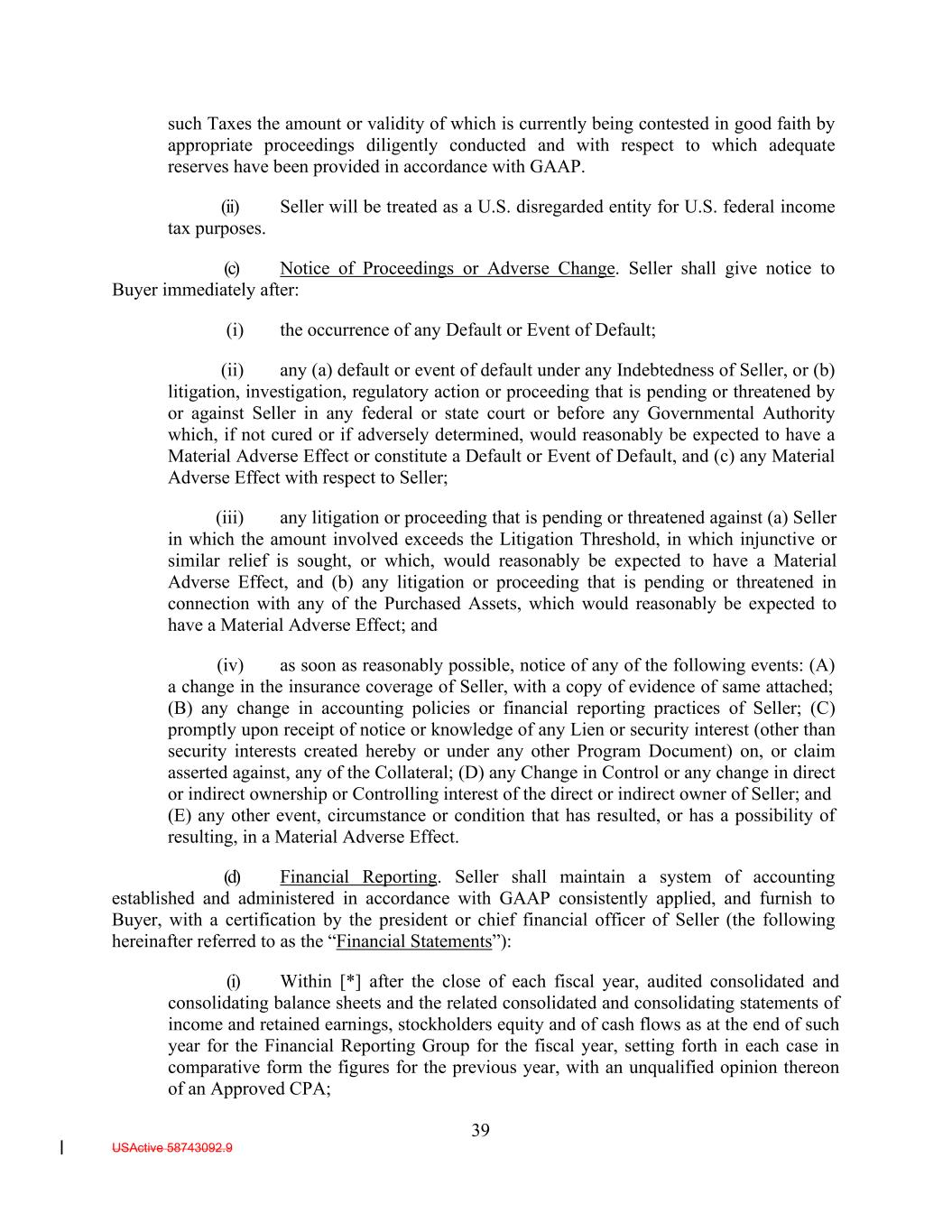 39 USActive 58743092.9 such Taxes the amount or validity of which is currently being contested in good faith by appropriate proceedings diligently conducted and with respect to which adequate reserves have been provided in accordance with GAAP. (ii) Seller will be treated as a U.S. disregarded entity for U.S. federal income tax purposes. (c) Notice of Proceedings or Adverse Change. Seller shall give notice to Buyer immediately after: (i) the occurrence of any Default or Event of Default; (ii) any (a) default or event of default under any Indebtedness of Seller, or (b) litigation, investigation, regulatory action or proceeding that is pending or threatened by or against Seller in any federal or state court or before any Governmental Authority which, if not cured or if adversely determined, would reasonably be expected to have a Material Adverse Effect or constitute a Default or Event of Default, and (c) any Material Adverse Effect with respect to Seller; (iii) any litigation or proceeding that is pending or threatened against (a) Seller in which the amount involved exceeds the Litigation Threshold, in which injunctive or similar relief is sought, or which, would reasonably be expected to have a Material Adverse Effect, and (b) any litigation or proceeding that is pending or threatened in connection with any of the Purchased Assets, which would reasonably be expected to have a Material Adverse Effect; and (iv) as soon as reasonably possible, notice of any of the following events: (A) a change in the insurance coverage of Seller, with a copy of evidence of same attached; (B) any change in accounting policies or financial reporting practices of Seller; (C) promptly upon receipt of notice or knowledge of any Lien or security interest (other than security interests created hereby or under any other Program Document) on, or claim asserted against, any of the Collateral; (D) any Change in Control or any change in direct or indirect ownership or Controlling interest of the direct or indirect owner of Seller; and (E) any other event, circumstance or condition that has resulted, or has a possibility of resulting, in a Material Adverse Effect. (d) Financial Reporting. Seller shall maintain a system of accounting established and administered in accordance with GAAP consistently applied, and furnish to Buyer, with a certification by the president or chief financial officer of Seller (the following hereinafter referred to as the “Financial Statements”): (i) Within [*] after the close of each fiscal year, audited consolidated and consolidating balance sheets and the related consolidated and consolidating statements of income and retained earnings, stockholders equity and of cash flows as at the end of such year for the Financial Reporting Group for the fiscal year, setting forth in each case in comparative form the figures for the previous year, with an unqualified opinion thereon of an Approved CPA;