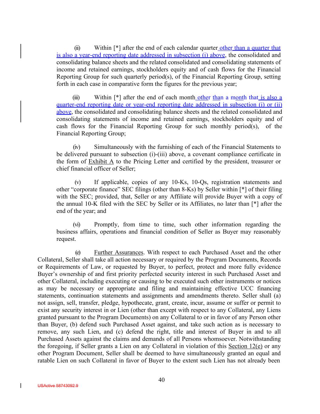 40 USActive 58743092.9 (ii) Within [*] after the end of each calendar quarter other than a quarter that is also a year-end reporting date addressed in subsection (i) above, the consolidated and consolidating balance sheets and the related consolidated and consolidating statements of income and retained earnings, stockholders equity and of cash flows for the Financial Reporting Group for such quarterly period(s), of the Financial Reporting Group, setting forth in each case in comparative form the figures for the previous year; (iii) Within [*] after the end of each month other than a month that is also a quarter-end reporting date or year-end reporting date addressed in subsection (i) or (ii) above, the consolidated and consolidating balance sheets and the related consolidated and consolidating statements of income and retained earnings, stockholders equity and of cash flows for the Financial Reporting Group for such monthly period(s), of the Financial Reporting Group; (iv) Simultaneously with the furnishing of each of the Financial Statements to be delivered pursuant to subsection (i)-(iii) above, a covenant compliance certificate in the form of Exhibit A to the Pricing Letter and certified by the president, treasurer or chief financial officer of Seller; (v) If applicable, copies of any 10-Ks, 10-Qs, registration statements and other “corporate finance” SEC filings (other than 8-Ks) by Seller within [*] of their filing with the SEC; provided, that, Seller or any Affiliate will provide Buyer with a copy of the annual 10-K filed with the SEC by Seller or its Affiliates, no later than [*] after the end of the year; and (vi) Promptly, from time to time, such other information regarding the business affairs, operations and financial condition of Seller as Buyer may reasonably request. (e) Further Assurances. With respect to each Purchased Asset and the other Collateral, Seller shall take all action necessary or required by the Program Documents, Records or Requirements of Law, or requested by Buyer, to perfect, protect and more fully evidence Buyer’s ownership of and first priority perfected security interest in such Purchased Asset and other Collateral, including executing or causing to be executed such other instruments or notices as may be necessary or appropriate and filing and maintaining effective UCC financing statements, continuation statements and assignments and amendments thereto. Seller shall (a) not assign, sell, transfer, pledge, hypothecate, grant, create, incur, assume or suffer or permit to exist any security interest in or Lien (other than except with respect to any Collateral, any Liens granted pursuant to the Program Documents) on any Collateral to or in favor of any Person other than Buyer, (b) defend such Purchased Asset against, and take such action as is necessary to remove, any such Lien, and (c) defend the right, title and interest of Buyer in and to all Purchased Assets against the claims and demands of all Persons whomsoever. Notwithstanding the foregoing, if Seller grants a Lien on any Collateral in violation of this Section 12(e) or any other Program Document, Seller shall be deemed to have simultaneously granted an equal and ratable Lien on such Collateral in favor of Buyer to the extent such Lien has not already been