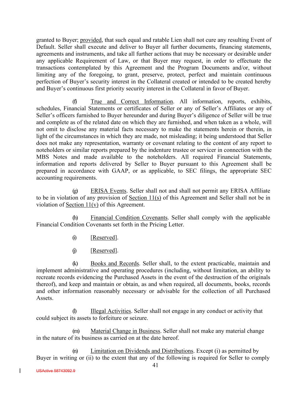 41 USActive 58743092.9 granted to Buyer; provided, that such equal and ratable Lien shall not cure any resulting Event of Default. Seller shall execute and deliver to Buyer all further documents, financing statements, agreements and instruments, and take all further actions that may be necessary or desirable under any applicable Requirement of Law, or that Buyer may request, in order to effectuate the transactions contemplated by this Agreement and the Program Documents and/or, without limiting any of the foregoing, to grant, preserve, protect, perfect and maintain continuous perfection of Buyer’s security interest in the Collateral created or intended to be created hereby and Buyer’s continuous first priority security interest in the Collateral in favor of Buyer. (f) True and Correct Information. All information, reports, exhibits, schedules, Financial Statements or certificates of Seller or any of Seller’s Affiliates or any of Seller’s officers furnished to Buyer hereunder and during Buyer’s diligence of Seller will be true and complete as of the related date on which they are furnished, and when taken as a whole, will not omit to disclose any material facts necessary to make the statements herein or therein, in light of the circumstances in which they are made, not misleading; it being understood that Seller does not make any representation, warranty or covenant relating to the content of any report to noteholders or similar reports prepared by the indenture trustee or servicer in connection with the MBS Notes and made available to the noteholders. All required Financial Statements, information and reports delivered by Seller to Buyer pursuant to this Agreement shall be prepared in accordance with GAAP, or as applicable, to SEC filings, the appropriate SEC accounting requirements. (g) ERISA Events. Seller shall not and shall not permit any ERISA Affiliate to be in violation of any provision of Section 11(s) of this Agreement and Seller shall not be in violation of Section 11(v) of this Agreement. (h) Financial Condition Covenants. Seller shall comply with the applicable Financial Condition Covenants set forth in the Pricing Letter. (i) [Reserved]. (j) [Reserved]. (k) Books and Records. Seller shall, to the extent practicable, maintain and implement administrative and operating procedures (including, without limitation, an ability to recreate records evidencing the Purchased Assets in the event of the destruction of the originals thereof), and keep and maintain or obtain, as and when required, all documents, books, records and other information reasonably necessary or advisable for the collection of all Purchased Assets. (l) Illegal Activities. Seller shall not engage in any conduct or activity that could subject its assets to forfeiture or seizure. (m) Material Change in Business. Seller shall not make any material change in the nature of its business as carried on at the date hereof. (n) Limitation on Dividends and Distributions. Except (i) as permitted by Buyer in writing or (ii) to the extent that any of the following is required for Seller to comply