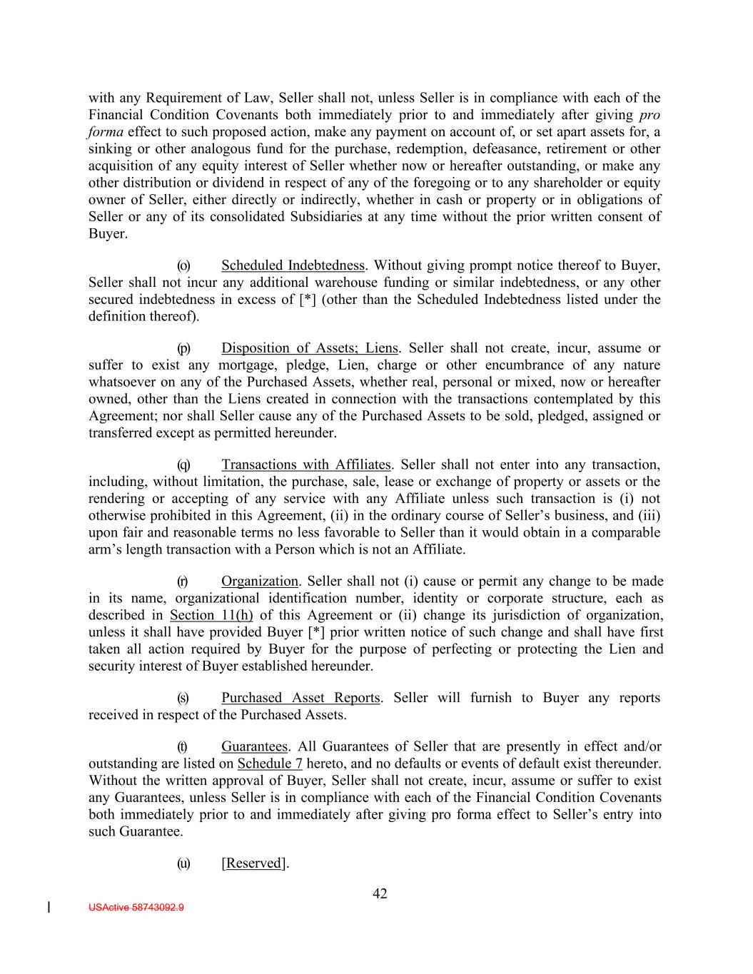 42 USActive 58743092.9 with any Requirement of Law, Seller shall not, unless Seller is in compliance with each of the Financial Condition Covenants both immediately prior to and immediately after giving pro forma effect to such proposed action, make any payment on account of, or set apart assets for, a sinking or other analogous fund for the purchase, redemption, defeasance, retirement or other acquisition of any equity interest of Seller whether now or hereafter outstanding, or make any other distribution or dividend in respect of any of the foregoing or to any shareholder or equity owner of Seller, either directly or indirectly, whether in cash or property or in obligations of Seller or any of its consolidated Subsidiaries at any time without the prior written consent of Buyer. (o) Scheduled Indebtedness. Without giving prompt notice thereof to Buyer, Seller shall not incur any additional warehouse funding or similar indebtedness, or any other secured indebtedness in excess of [*] (other than the Scheduled Indebtedness listed under the definition thereof). (p) Disposition of Assets; Liens. Seller shall not create, incur, assume or suffer to exist any mortgage, pledge, Lien, charge or other encumbrance of any nature whatsoever on any of the Purchased Assets, whether real, personal or mixed, now or hereafter owned, other than the Liens created in connection with the transactions contemplated by this Agreement; nor shall Seller cause any of the Purchased Assets to be sold, pledged, assigned or transferred except as permitted hereunder. (q) Transactions with Affiliates. Seller shall not enter into any transaction, including, without limitation, the purchase, sale, lease or exchange of property or assets or the rendering or accepting of any service with any Affiliate unless such transaction is (i) not otherwise prohibited in this Agreement, (ii) in the ordinary course of Seller’s business, and (iii) upon fair and reasonable terms no less favorable to Seller than it would obtain in a comparable arm’s length transaction with a Person which is not an Affiliate. (r) Organization. Seller shall not (i) cause or permit any change to be made in its name, organizational identification number, identity or corporate structure, each as described in Section 11(h) of this Agreement or (ii) change its jurisdiction of organization, unless it shall have provided Buyer [*] prior written notice of such change and shall have first taken all action required by Buyer for the purpose of perfecting or protecting the Lien and security interest of Buyer established hereunder. (s) Purchased Asset Reports. Seller will furnish to Buyer any reports received in respect of the Purchased Assets. (t) Guarantees. All Guarantees of Seller that are presently in effect and/or outstanding are listed on Schedule 7 hereto, and no defaults or events of default exist thereunder. Without the written approval of Buyer, Seller shall not create, incur, assume or suffer to exist any Guarantees, unless Seller is in compliance with each of the Financial Condition Covenants both immediately prior to and immediately after giving pro forma effect to Seller’s entry into such Guarantee. (u) [Reserved].