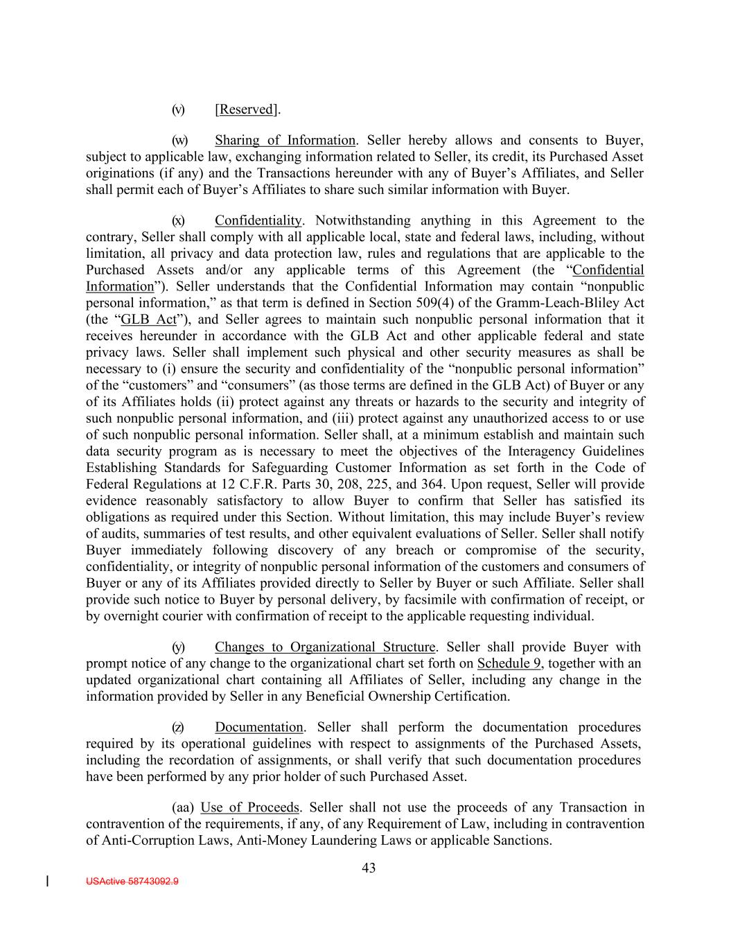 43 USActive 58743092.9 (v) [Reserved]. (w) Sharing of Information. Seller hereby allows and consents to Buyer, subject to applicable law, exchanging information related to Seller, its credit, its Purchased Asset originations (if any) and the Transactions hereunder with any of Buyer’s Affiliates, and Seller shall permit each of Buyer’s Affiliates to share such similar information with Buyer. (x) Confidentiality. Notwithstanding anything in this Agreement to the contrary, Seller shall comply with all applicable local, state and federal laws, including, without limitation, all privacy and data protection law, rules and regulations that are applicable to the Purchased Assets and/or any applicable terms of this Agreement (the “Confidential Information”). Seller understands that the Confidential Information may contain “nonpublic personal information,” as that term is defined in Section 509(4) of the Gramm-Leach-Bliley Act (the “GLB Act”), and Seller agrees to maintain such nonpublic personal information that it receives hereunder in accordance with the GLB Act and other applicable federal and state privacy laws. Seller shall implement such physical and other security measures as shall be necessary to (i) ensure the security and confidentiality of the “nonpublic personal information” of the “customers” and “consumers” (as those terms are defined in the GLB Act) of Buyer or any of its Affiliates holds (ii) protect against any threats or hazards to the security and integrity of such nonpublic personal information, and (iii) protect against any unauthorized access to or use of such nonpublic personal information. Seller shall, at a minimum establish and maintain such data security program as is necessary to meet the objectives of the Interagency Guidelines Establishing Standards for Safeguarding Customer Information as set forth in the Code of Federal Regulations at 12 C.F.R. Parts 30, 208, 225, and 364. Upon request, Seller will provide evidence reasonably satisfactory to allow Buyer to confirm that Seller has satisfied its obligations as required under this Section. Without limitation, this may include Buyer’s review of audits, summaries of test results, and other equivalent evaluations of Seller. Seller shall notify Buyer immediately following discovery of any breach or compromise of the security, confidentiality, or integrity of nonpublic personal information of the customers and consumers of Buyer or any of its Affiliates provided directly to Seller by Buyer or such Affiliate. Seller shall provide such notice to Buyer by personal delivery, by facsimile with confirmation of receipt, or by overnight courier with confirmation of receipt to the applicable requesting individual. (y) Changes to Organizational Structure. Seller shall provide Buyer with prompt notice of any change to the organizational chart set forth on Schedule 9, together with an updated organizational chart containing all Affiliates of Seller, including any change in the information provided by Seller in any Beneficial Ownership Certification. (z) Documentation. Seller shall perform the documentation procedures required by its operational guidelines with respect to assignments of the Purchased Assets, including the recordation of assignments, or shall verify that such documentation procedures have been performed by any prior holder of such Purchased Asset. (aa) Use of Proceeds. Seller shall not use the proceeds of any Transaction in contravention of the requirements, if any, of any Requirement of Law, including in contravention of Anti-Corruption Laws, Anti-Money Laundering Laws or applicable Sanctions.