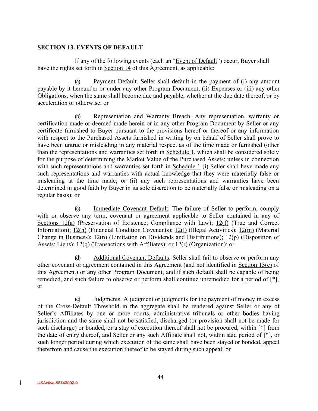 44 USActive 58743092.9 SECTION 13. EVENTS OF DEFAULT If any of the following events (each an “Event of Default”) occur, Buyer shall have the rights set forth in Section 14 of this Agreement, as applicable: (a) Payment Default. Seller shall default in the payment of (i) any amount payable by it hereunder or under any other Program Document, (ii) Expenses or (iii) any other Obligations, when the same shall become due and payable, whether at the due date thereof, or by acceleration or otherwise; or (b) Representation and Warranty Breach. Any representation, warranty or certification made or deemed made herein or in any other Program Document by Seller or any certificate furnished to Buyer pursuant to the provisions hereof or thereof or any information with respect to the Purchased Assets furnished in writing by on behalf of Seller shall prove to have been untrue or misleading in any material respect as of the time made or furnished (other than the representations and warranties set forth in Schedule 1, which shall be considered solely for the purpose of determining the Market Value of the Purchased Assets; unless in connection with such representations and warranties set forth in Schedule 1 (i) Seller shall have made any such representations and warranties with actual knowledge that they were materially false or misleading at the time made; or (ii) any such representations and warranties have been determined in good faith by Buyer in its sole discretion to be materially false or misleading on a regular basis); or (c) Immediate Covenant Default. The failure of Seller to perform, comply with or observe any term, covenant or agreement applicable to Seller contained in any of Sections 12(a) (Preservation of Existence; Compliance with Law); 12(f) (True and Correct Information); 12(h) (Financial Condition Covenants); 12(l) (Illegal Activities); 12(m) (Material Change in Business); 12(n) (Limitation on Dividends and Distributions); 12(p) (Disposition of Assets; Liens); 12(q) (Transactions with Affiliates); or 12(r) (Organization); or (d) Additional Covenant Defaults. Seller shall fail to observe or perform any other covenant or agreement contained in this Agreement (and not identified in Section 13(c) of this Agreement) or any other Program Document, and if such default shall be capable of being remedied, and such failure to observe or perform shall continue unremedied for a period of [*]; or (e) Judgments. A judgment or judgments for the payment of money in excess of the Cross-Default Threshold in the aggregate shall be rendered against Seller or any of Seller’s Affiliates by one or more courts, administrative tribunals or other bodies having jurisdiction and the same shall not be satisfied, discharged (or provision shall not be made for such discharge) or bonded, or a stay of execution thereof shall not be procured, within [*] from the date of entry thereof, and Seller or any such Affiliate shall not, within said period of [*], or such longer period during which execution of the same shall have been stayed or bonded, appeal therefrom and cause the execution thereof to be stayed during such appeal; or