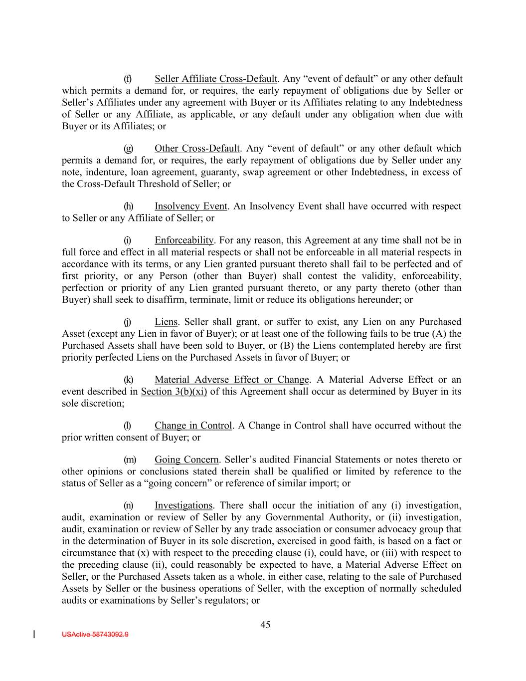 45 USActive 58743092.9 (f) Seller Affiliate Cross-Default. Any “event of default” or any other default which permits a demand for, or requires, the early repayment of obligations due by Seller or Seller’s Affiliates under any agreement with Buyer or its Affiliates relating to any Indebtedness of Seller or any Affiliate, as applicable, or any default under any obligation when due with Buyer or its Affiliates; or (g) Other Cross-Default. Any “event of default” or any other default which permits a demand for, or requires, the early repayment of obligations due by Seller under any note, indenture, loan agreement, guaranty, swap agreement or other Indebtedness, in excess of the Cross-Default Threshold of Seller; or (h) Insolvency Event. An Insolvency Event shall have occurred with respect to Seller or any Affiliate of Seller; or (i) Enforceability. For any reason, this Agreement at any time shall not be in full force and effect in all material respects or shall not be enforceable in all material respects in accordance with its terms, or any Lien granted pursuant thereto shall fail to be perfected and of first priority, or any Person (other than Buyer) shall contest the validity, enforceability, perfection or priority of any Lien granted pursuant thereto, or any party thereto (other than Buyer) shall seek to disaffirm, terminate, limit or reduce its obligations hereunder; or (j) Liens. Seller shall grant, or suffer to exist, any Lien on any Purchased Asset (except any Lien in favor of Buyer); or at least one of the following fails to be true (A) the Purchased Assets shall have been sold to Buyer, or (B) the Liens contemplated hereby are first priority perfected Liens on the Purchased Assets in favor of Buyer; or (k) Material Adverse Effect or Change. A Material Adverse Effect or an event described in Section 3(b)(xi) of this Agreement shall occur as determined by Buyer in its sole discretion; (l) Change in Control. A Change in Control shall have occurred without the prior written consent of Buyer; or (m) Going Concern. Seller’s audited Financial Statements or notes thereto or other opinions or conclusions stated therein shall be qualified or limited by reference to the status of Seller as a “going concern” or reference of similar import; or (n) Investigations. There shall occur the initiation of any (i) investigation, audit, examination or review of Seller by any Governmental Authority, or (ii) investigation, audit, examination or review of Seller by any trade association or consumer advocacy group that in the determination of Buyer in its sole discretion, exercised in good faith, is based on a fact or circumstance that (x) with respect to the preceding clause (i), could have, or (iii) with respect to the preceding clause (ii), could reasonably be expected to have, a Material Adverse Effect on Seller, or the Purchased Assets taken as a whole, in either case, relating to the sale of Purchased Assets by Seller or the business operations of Seller, with the exception of normally scheduled audits or examinations by Seller’s regulators; or
