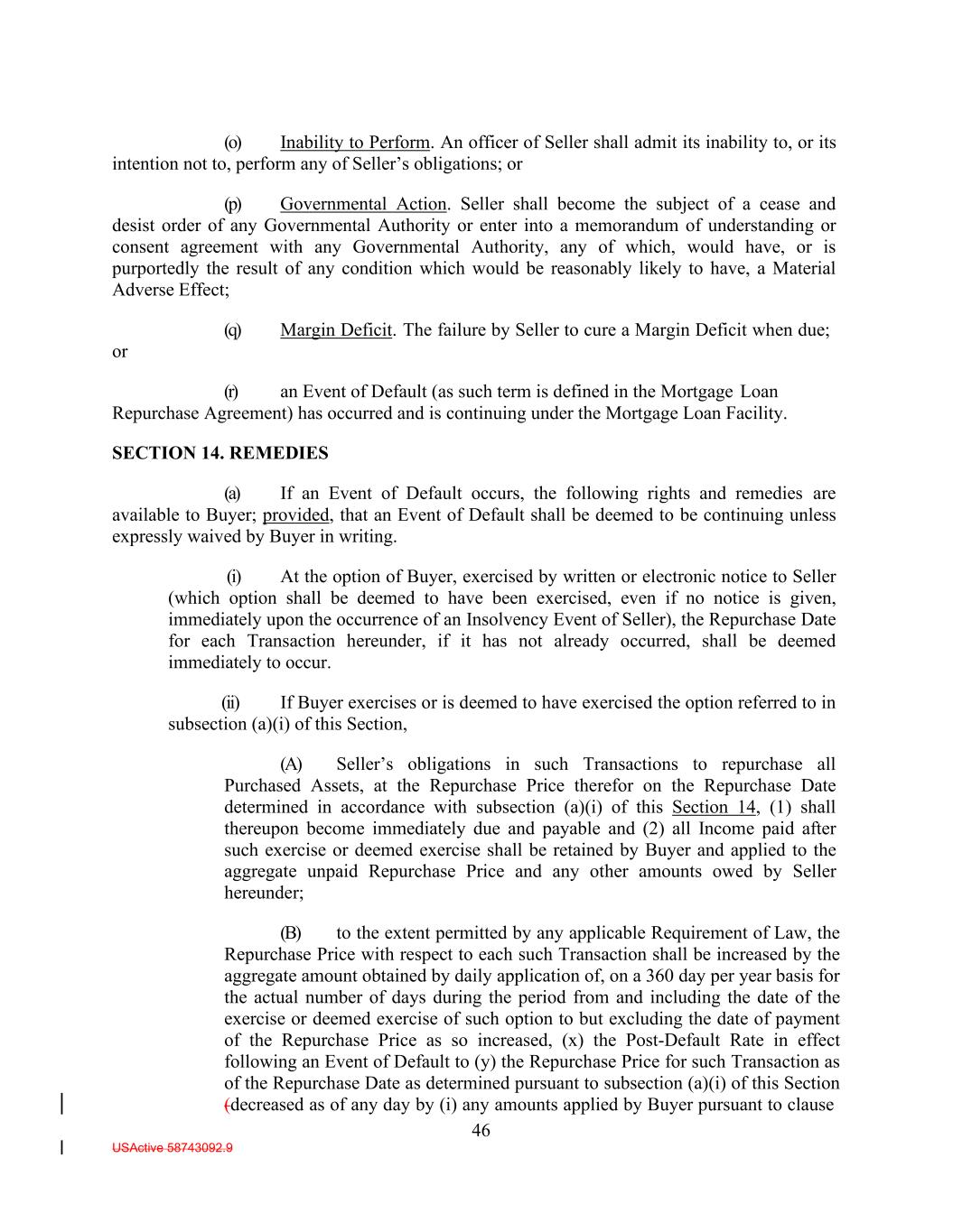 46 USActive 58743092.9 (o) Inability to Perform. An officer of Seller shall admit its inability to, or its intention not to, perform any of Seller’s obligations; or (p) Governmental Action. Seller shall become the subject of a cease and desist order of any Governmental Authority or enter into a memorandum of understanding or consent agreement with any Governmental Authority, any of which, would have, or is purportedly the result of any condition which would be reasonably likely to have, a Material Adverse Effect; (q) Margin Deficit. The failure by Seller to cure a Margin Deficit when due; or (r) an Event of Default (as such term is defined in the Mortgage Loan Repurchase Agreement) has occurred and is continuing under the Mortgage Loan Facility. SECTION 14. REMEDIES (a) If an Event of Default occurs, the following rights and remedies are available to Buyer; provided, that an Event of Default shall be deemed to be continuing unless expressly waived by Buyer in writing. (i) At the option of Buyer, exercised by written or electronic notice to Seller (which option shall be deemed to have been exercised, even if no notice is given, immediately upon the occurrence of an Insolvency Event of Seller), the Repurchase Date for each Transaction hereunder, if it has not already occurred, shall be deemed immediately to occur. (ii) If Buyer exercises or is deemed to have exercised the option referred to in subsection (a)(i) of this Section, (A) Seller’s obligations in such Transactions to repurchase all Purchased Assets, at the Repurchase Price therefor on the Repurchase Date determined in accordance with subsection (a)(i) of this Section 14, (1) shall thereupon become immediately due and payable and (2) all Income paid after such exercise or deemed exercise shall be retained by Buyer and applied to the aggregate unpaid Repurchase Price and any other amounts owed by Seller hereunder; (B) to the extent permitted by any applicable Requirement of Law, the Repurchase Price with respect to each such Transaction shall be increased by the aggregate amount obtained by daily application of, on a 360 day per year basis for the actual number of days during the period from and including the date of the exercise or deemed exercise of such option to but excluding the date of payment of the Repurchase Price as so increased, (x) the Post-Default Rate in effect following an Event of Default to (y) the Repurchase Price for such Transaction as of the Repurchase Date as determined pursuant to subsection (a)(i) of this Section (decreased as of any day by (i) any amounts applied by Buyer pursuant to clause