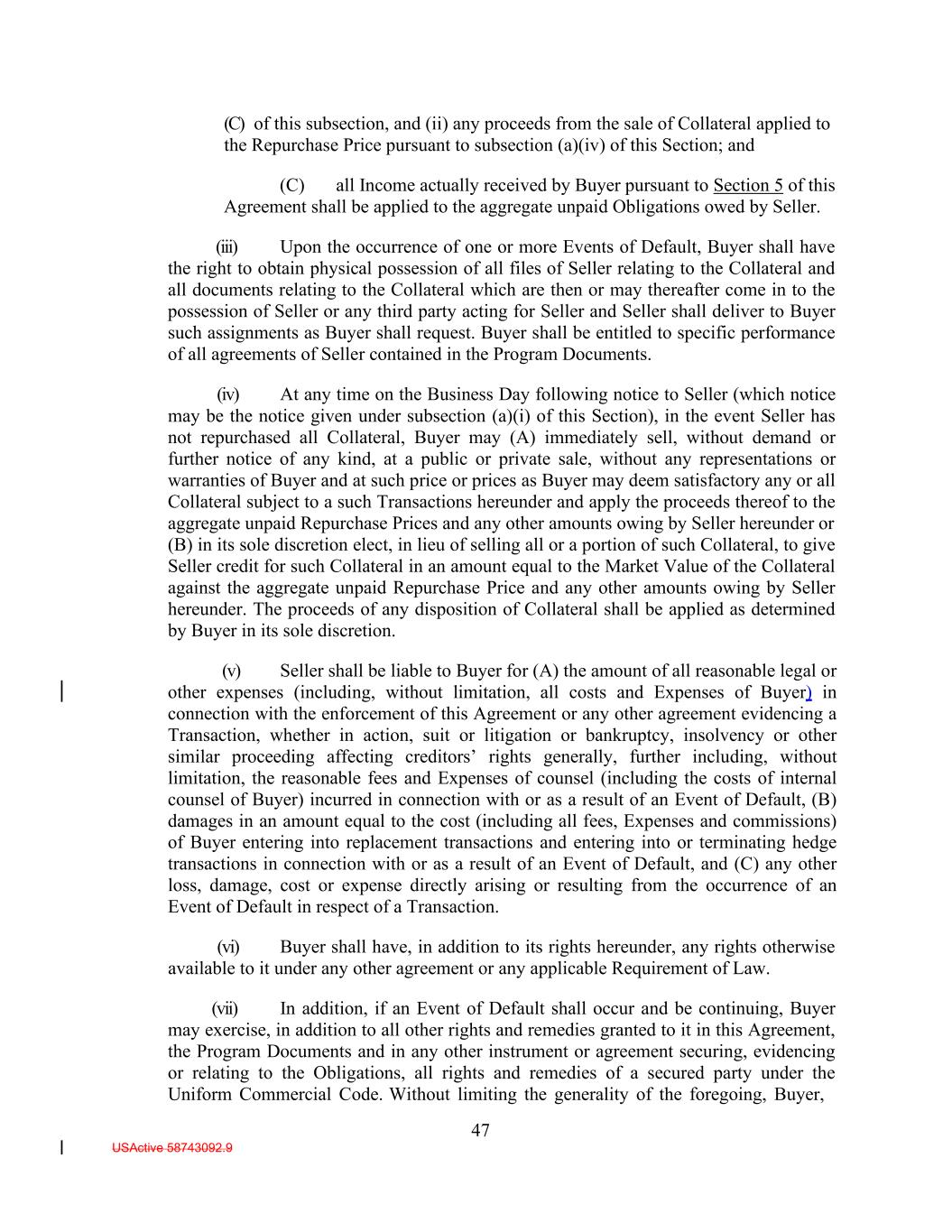 47 USActive 58743092.9 (C) of this subsection, and (ii) any proceeds from the sale of Collateral applied to the Repurchase Price pursuant to subsection (a)(iv) of this Section; and (C) all Income actually received by Buyer pursuant to Section 5 of this Agreement shall be applied to the aggregate unpaid Obligations owed by Seller. (iii) Upon the occurrence of one or more Events of Default, Buyer shall have the right to obtain physical possession of all files of Seller relating to the Collateral and all documents relating to the Collateral which are then or may thereafter come in to the possession of Seller or any third party acting for Seller and Seller shall deliver to Buyer such assignments as Buyer shall request. Buyer shall be entitled to specific performance of all agreements of Seller contained in the Program Documents. (iv) At any time on the Business Day following notice to Seller (which notice may be the notice given under subsection (a)(i) of this Section), in the event Seller has not repurchased all Collateral, Buyer may (A) immediately sell, without demand or further notice of any kind, at a public or private sale, without any representations or warranties of Buyer and at such price or prices as Buyer may deem satisfactory any or all Collateral subject to a such Transactions hereunder and apply the proceeds thereof to the aggregate unpaid Repurchase Prices and any other amounts owing by Seller hereunder or (B) in its sole discretion elect, in lieu of selling all or a portion of such Collateral, to give Seller credit for such Collateral in an amount equal to the Market Value of the Collateral against the aggregate unpaid Repurchase Price and any other amounts owing by Seller hereunder. The proceeds of any disposition of Collateral shall be applied as determined by Buyer in its sole discretion. (v) Seller shall be liable to Buyer for (A) the amount of all reasonable legal or other expenses (including, without limitation, all costs and Expenses of Buyer) in connection with the enforcement of this Agreement or any other agreement evidencing a Transaction, whether in action, suit or litigation or bankruptcy, insolvency or other similar proceeding affecting creditors’ rights generally, further including, without limitation, the reasonable fees and Expenses of counsel (including the costs of internal counsel of Buyer) incurred in connection with or as a result of an Event of Default, (B) damages in an amount equal to the cost (including all fees, Expenses and commissions) of Buyer entering into replacement transactions and entering into or terminating hedge transactions in connection with or as a result of an Event of Default, and (C) any other loss, damage, cost or expense directly arising or resulting from the occurrence of an Event of Default in respect of a Transaction. (vi) Buyer shall have, in addition to its rights hereunder, any rights otherwise available to it under any other agreement or any applicable Requirement of Law. (vii) In addition, if an Event of Default shall occur and be continuing, Buyer may exercise, in addition to all other rights and remedies granted to it in this Agreement, the Program Documents and in any other instrument or agreement securing, evidencing or relating to the Obligations, all rights and remedies of a secured party under the Uniform Commercial Code. Without limiting the generality of the foregoing, Buyer,