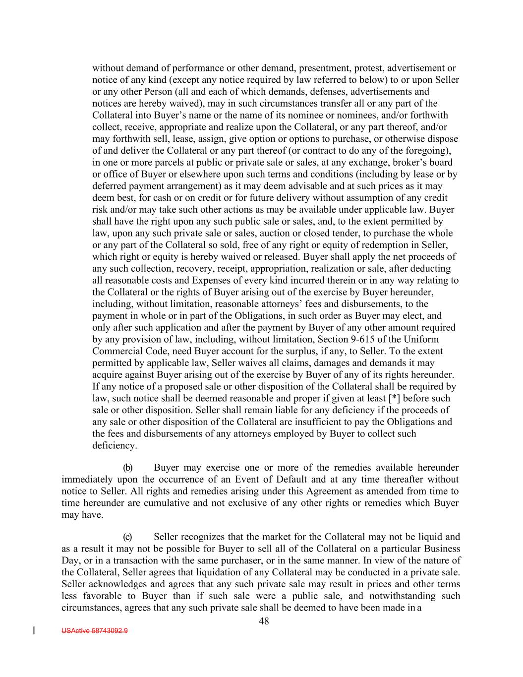48 USActive 58743092.9 without demand of performance or other demand, presentment, protest, advertisement or notice of any kind (except any notice required by law referred to below) to or upon Seller or any other Person (all and each of which demands, defenses, advertisements and notices are hereby waived), may in such circumstances transfer all or any part of the Collateral into Buyer’s name or the name of its nominee or nominees, and/or forthwith collect, receive, appropriate and realize upon the Collateral, or any part thereof, and/or may forthwith sell, lease, assign, give option or options to purchase, or otherwise dispose of and deliver the Collateral or any part thereof (or contract to do any of the foregoing), in one or more parcels at public or private sale or sales, at any exchange, broker’s board or office of Buyer or elsewhere upon such terms and conditions (including by lease or by deferred payment arrangement) as it may deem advisable and at such prices as it may deem best, for cash or on credit or for future delivery without assumption of any credit risk and/or may take such other actions as may be available under applicable law. Buyer shall have the right upon any such public sale or sales, and, to the extent permitted by law, upon any such private sale or sales, auction or closed tender, to purchase the whole or any part of the Collateral so sold, free of any right or equity of redemption in Seller, which right or equity is hereby waived or released. Buyer shall apply the net proceeds of any such collection, recovery, receipt, appropriation, realization or sale, after deducting all reasonable costs and Expenses of every kind incurred therein or in any way relating to the Collateral or the rights of Buyer arising out of the exercise by Buyer hereunder, including, without limitation, reasonable attorneys’ fees and disbursements, to the payment in whole or in part of the Obligations, in such order as Buyer may elect, and only after such application and after the payment by Buyer of any other amount required by any provision of law, including, without limitation, Section 9-615 of the Uniform Commercial Code, need Buyer account for the surplus, if any, to Seller. To the extent permitted by applicable law, Seller waives all claims, damages and demands it may acquire against Buyer arising out of the exercise by Buyer of any of its rights hereunder. If any notice of a proposed sale or other disposition of the Collateral shall be required by law, such notice shall be deemed reasonable and proper if given at least [*] before such sale or other disposition. Seller shall remain liable for any deficiency if the proceeds of any sale or other disposition of the Collateral are insufficient to pay the Obligations and the fees and disbursements of any attorneys employed by Buyer to collect such deficiency. (b) Buyer may exercise one or more of the remedies available hereunder immediately upon the occurrence of an Event of Default and at any time thereafter without notice to Seller. All rights and remedies arising under this Agreement as amended from time to time hereunder are cumulative and not exclusive of any other rights or remedies which Buyer may have. (c) Seller recognizes that the market for the Collateral may not be liquid and as a result it may not be possible for Buyer to sell all of the Collateral on a particular Business Day, or in a transaction with the same purchaser, or in the same manner. In view of the nature of the Collateral, Seller agrees that liquidation of any Collateral may be conducted in a private sale. Seller acknowledges and agrees that any such private sale may result in prices and other terms less favorable to Buyer than if such sale were a public sale, and notwithstanding such circumstances, agrees that any such private sale shall be deemed to have been made in a