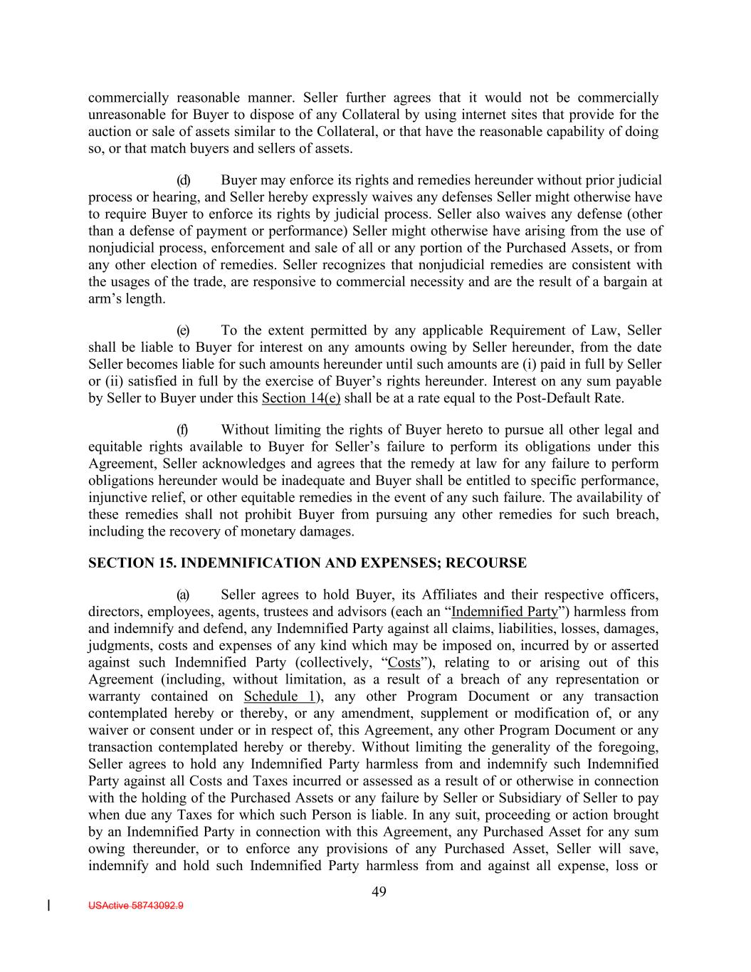 49 USActive 58743092.9 commercially reasonable manner. Seller further agrees that it would not be commercially unreasonable for Buyer to dispose of any Collateral by using internet sites that provide for the auction or sale of assets similar to the Collateral, or that have the reasonable capability of doing so, or that match buyers and sellers of assets. (d) Buyer may enforce its rights and remedies hereunder without prior judicial process or hearing, and Seller hereby expressly waives any defenses Seller might otherwise have to require Buyer to enforce its rights by judicial process. Seller also waives any defense (other than a defense of payment or performance) Seller might otherwise have arising from the use of nonjudicial process, enforcement and sale of all or any portion of the Purchased Assets, or from any other election of remedies. Seller recognizes that nonjudicial remedies are consistent with the usages of the trade, are responsive to commercial necessity and are the result of a bargain at arm’s length. (e) To the extent permitted by any applicable Requirement of Law, Seller shall be liable to Buyer for interest on any amounts owing by Seller hereunder, from the date Seller becomes liable for such amounts hereunder until such amounts are (i) paid in full by Seller or (ii) satisfied in full by the exercise of Buyer’s rights hereunder. Interest on any sum payable by Seller to Buyer under this Section 14(e) shall be at a rate equal to the Post-Default Rate. (f) Without limiting the rights of Buyer hereto to pursue all other legal and equitable rights available to Buyer for Seller’s failure to perform its obligations under this Agreement, Seller acknowledges and agrees that the remedy at law for any failure to perform obligations hereunder would be inadequate and Buyer shall be entitled to specific performance, injunctive relief, or other equitable remedies in the event of any such failure. The availability of these remedies shall not prohibit Buyer from pursuing any other remedies for such breach, including the recovery of monetary damages. SECTION 15. INDEMNIFICATION AND EXPENSES; RECOURSE (a) Seller agrees to hold Buyer, its Affiliates and their respective officers, directors, employees, agents, trustees and advisors (each an “Indemnified Party”) harmless from and indemnify and defend, any Indemnified Party against all claims, liabilities, losses, damages, judgments, costs and expenses of any kind which may be imposed on, incurred by or asserted against such Indemnified Party (collectively, “Costs”), relating to or arising out of this Agreement (including, without limitation, as a result of a breach of any representation or warranty contained on Schedule 1), any other Program Document or any transaction contemplated hereby or thereby, or any amendment, supplement or modification of, or any waiver or consent under or in respect of, this Agreement, any other Program Document or any transaction contemplated hereby or thereby. Without limiting the generality of the foregoing, Seller agrees to hold any Indemnified Party harmless from and indemnify such Indemnified Party against all Costs and Taxes incurred or assessed as a result of or otherwise in connection with the holding of the Purchased Assets or any failure by Seller or Subsidiary of Seller to pay when due any Taxes for which such Person is liable. In any suit, proceeding or action brought by an Indemnified Party in connection with this Agreement, any Purchased Asset for any sum owing thereunder, or to enforce any provisions of any Purchased Asset, Seller will save, indemnify and hold such Indemnified Party harmless from and against all expense, loss or
