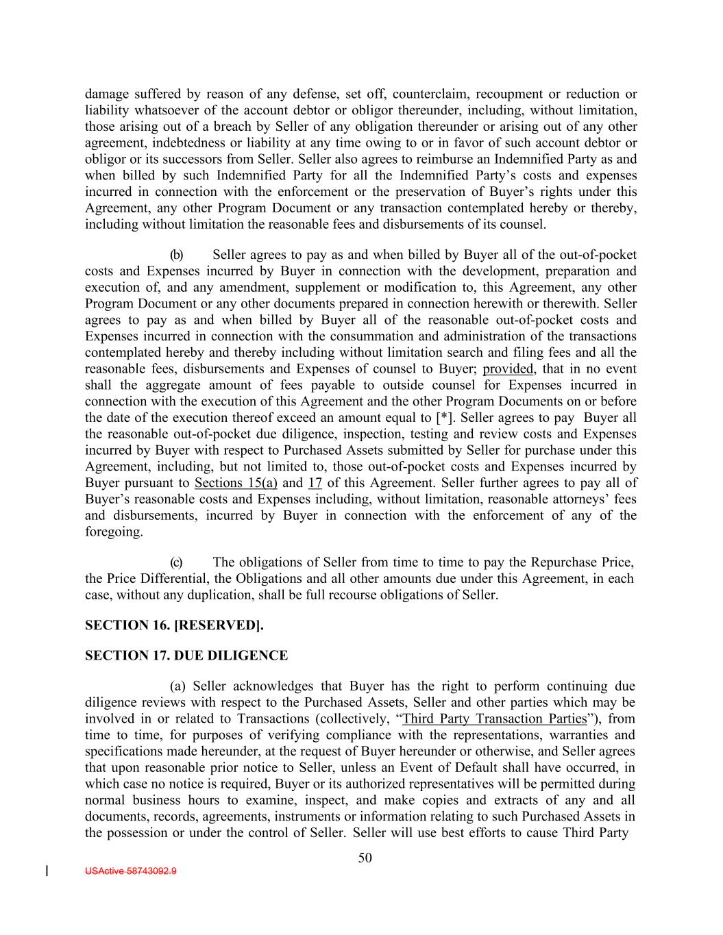 50 USActive 58743092.9 damage suffered by reason of any defense, set off, counterclaim, recoupment or reduction or liability whatsoever of the account debtor or obligor thereunder, including, without limitation, those arising out of a breach by Seller of any obligation thereunder or arising out of any other agreement, indebtedness or liability at any time owing to or in favor of such account debtor or obligor or its successors from Seller. Seller also agrees to reimburse an Indemnified Party as and when billed by such Indemnified Party for all the Indemnified Party’s costs and expenses incurred in connection with the enforcement or the preservation of Buyer’s rights under this Agreement, any other Program Document or any transaction contemplated hereby or thereby, including without limitation the reasonable fees and disbursements of its counsel. (b) Seller agrees to pay as and when billed by Buyer all of the out-of-pocket costs and Expenses incurred by Buyer in connection with the development, preparation and execution of, and any amendment, supplement or modification to, this Agreement, any other Program Document or any other documents prepared in connection herewith or therewith. Seller agrees to pay as and when billed by Buyer all of the reasonable out-of-pocket costs and Expenses incurred in connection with the consummation and administration of the transactions contemplated hereby and thereby including without limitation search and filing fees and all the reasonable fees, disbursements and Expenses of counsel to Buyer; provided, that in no event shall the aggregate amount of fees payable to outside counsel for Expenses incurred in connection with the execution of this Agreement and the other Program Documents on or before the date of the execution thereof exceed an amount equal to [*]. Seller agrees to pay Buyer all the reasonable out-of-pocket due diligence, inspection, testing and review costs and Expenses incurred by Buyer with respect to Purchased Assets submitted by Seller for purchase under this Agreement, including, but not limited to, those out-of-pocket costs and Expenses incurred by Buyer pursuant to Sections 15(a) and 17 of this Agreement. Seller further agrees to pay all of Buyer’s reasonable costs and Expenses including, without limitation, reasonable attorneys’ fees and disbursements, incurred by Buyer in connection with the enforcement of any of the foregoing. (c) The obligations of Seller from time to time to pay the Repurchase Price, the Price Differential, the Obligations and all other amounts due under this Agreement, in each case, without any duplication, shall be full recourse obligations of Seller. SECTION 16. [RESERVED]. SECTION 17. DUE DILIGENCE (a) Seller acknowledges that Buyer has the right to perform continuing due diligence reviews with respect to the Purchased Assets, Seller and other parties which may be involved in or related to Transactions (collectively, “Third Party Transaction Parties”), from time to time, for purposes of verifying compliance with the representations, warranties and specifications made hereunder, at the request of Buyer hereunder or otherwise, and Seller agrees that upon reasonable prior notice to Seller, unless an Event of Default shall have occurred, in which case no notice is required, Buyer or its authorized representatives will be permitted during normal business hours to examine, inspect, and make copies and extracts of any and all documents, records, agreements, instruments or information relating to such Purchased Assets in the possession or under the control of Seller. Seller will use best efforts to cause Third Party