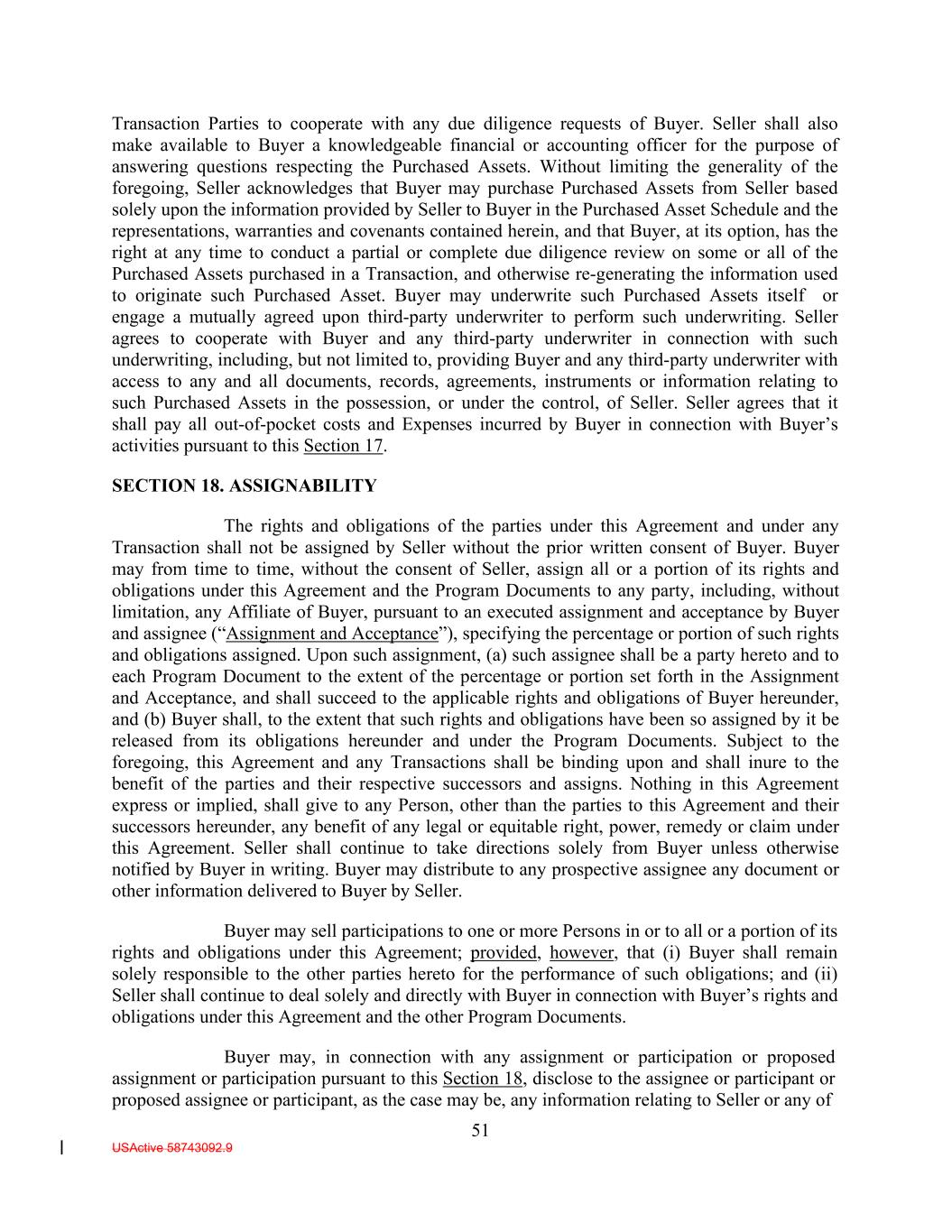 51 USActive 58743092.9 Transaction Parties to cooperate with any due diligence requests of Buyer. Seller shall also make available to Buyer a knowledgeable financial or accounting officer for the purpose of answering questions respecting the Purchased Assets. Without limiting the generality of the foregoing, Seller acknowledges that Buyer may purchase Purchased Assets from Seller based solely upon the information provided by Seller to Buyer in the Purchased Asset Schedule and the representations, warranties and covenants contained herein, and that Buyer, at its option, has the right at any time to conduct a partial or complete due diligence review on some or all of the Purchased Assets purchased in a Transaction, and otherwise re-generating the information used to originate such Purchased Asset. Buyer may underwrite such Purchased Assets itself or engage a mutually agreed upon third-party underwriter to perform such underwriting. Seller agrees to cooperate with Buyer and any third-party underwriter in connection with such underwriting, including, but not limited to, providing Buyer and any third-party underwriter with access to any and all documents, records, agreements, instruments or information relating to such Purchased Assets in the possession, or under the control, of Seller. Seller agrees that it shall pay all out-of-pocket costs and Expenses incurred by Buyer in connection with Buyer’s activities pursuant to this Section 17. SECTION 18. ASSIGNABILITY The rights and obligations of the parties under this Agreement and under any Transaction shall not be assigned by Seller without the prior written consent of Buyer. Buyer may from time to time, without the consent of Seller, assign all or a portion of its rights and obligations under this Agreement and the Program Documents to any party, including, without limitation, any Affiliate of Buyer, pursuant to an executed assignment and acceptance by Buyer and assignee (“Assignment and Acceptance”), specifying the percentage or portion of such rights and obligations assigned. Upon such assignment, (a) such assignee shall be a party hereto and to each Program Document to the extent of the percentage or portion set forth in the Assignment and Acceptance, and shall succeed to the applicable rights and obligations of Buyer hereunder, and (b) Buyer shall, to the extent that such rights and obligations have been so assigned by it be released from its obligations hereunder and under the Program Documents. Subject to the foregoing, this Agreement and any Transactions shall be binding upon and shall inure to the benefit of the parties and their respective successors and assigns. Nothing in this Agreement express or implied, shall give to any Person, other than the parties to this Agreement and their successors hereunder, any benefit of any legal or equitable right, power, remedy or claim under this Agreement. Seller shall continue to take directions solely from Buyer unless otherwise notified by Buyer in writing. Buyer may distribute to any prospective assignee any document or other information delivered to Buyer by Seller. Buyer may sell participations to one or more Persons in or to all or a portion of its rights and obligations under this Agreement; provided, however, that (i) Buyer shall remain solely responsible to the other parties hereto for the performance of such obligations; and (ii) Seller shall continue to deal solely and directly with Buyer in connection with Buyer’s rights and obligations under this Agreement and the other Program Documents. Buyer may, in connection with any assignment or participation or proposed assignment or participation pursuant to this Section 18, disclose to the assignee or participant or proposed assignee or participant, as the case may be, any information relating to Seller or any of