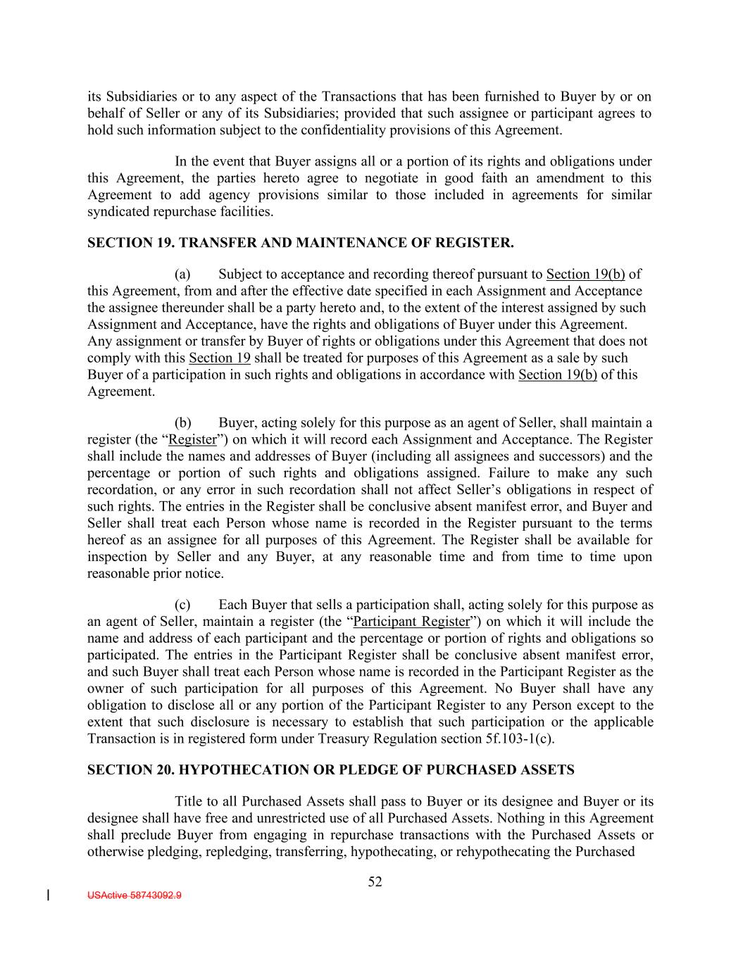 52 USActive 58743092.9 its Subsidiaries or to any aspect of the Transactions that has been furnished to Buyer by or on behalf of Seller or any of its Subsidiaries; provided that such assignee or participant agrees to hold such information subject to the confidentiality provisions of this Agreement. In the event that Buyer assigns all or a portion of its rights and obligations under this Agreement, the parties hereto agree to negotiate in good faith an amendment to this Agreement to add agency provisions similar to those included in agreements for similar syndicated repurchase facilities. SECTION 19. TRANSFER AND MAINTENANCE OF REGISTER. (a) Subject to acceptance and recording thereof pursuant to Section 19(b) of this Agreement, from and after the effective date specified in each Assignment and Acceptance the assignee thereunder shall be a party hereto and, to the extent of the interest assigned by such Assignment and Acceptance, have the rights and obligations of Buyer under this Agreement. Any assignment or transfer by Buyer of rights or obligations under this Agreement that does not comply with this Section 19 shall be treated for purposes of this Agreement as a sale by such Buyer of a participation in such rights and obligations in accordance with Section 19(b) of this Agreement. (b) Buyer, acting solely for this purpose as an agent of Seller, shall maintain a register (the “Register”) on which it will record each Assignment and Acceptance. The Register shall include the names and addresses of Buyer (including all assignees and successors) and the percentage or portion of such rights and obligations assigned. Failure to make any such recordation, or any error in such recordation shall not affect Seller’s obligations in respect of such rights. The entries in the Register shall be conclusive absent manifest error, and Buyer and Seller shall treat each Person whose name is recorded in the Register pursuant to the terms hereof as an assignee for all purposes of this Agreement. The Register shall be available for inspection by Seller and any Buyer, at any reasonable time and from time to time upon reasonable prior notice. (c) Each Buyer that sells a participation shall, acting solely for this purpose as an agent of Seller, maintain a register (the “Participant Register”) on which it will include the name and address of each participant and the percentage or portion of rights and obligations so participated. The entries in the Participant Register shall be conclusive absent manifest error, and such Buyer shall treat each Person whose name is recorded in the Participant Register as the owner of such participation for all purposes of this Agreement. No Buyer shall have any obligation to disclose all or any portion of the Participant Register to any Person except to the extent that such disclosure is necessary to establish that such participation or the applicable Transaction is in registered form under Treasury Regulation section 5f.103-1(c). SECTION 20. HYPOTHECATION OR PLEDGE OF PURCHASED ASSETS Title to all Purchased Assets shall pass to Buyer or its designee and Buyer or its designee shall have free and unrestricted use of all Purchased Assets. Nothing in this Agreement shall preclude Buyer from engaging in repurchase transactions with the Purchased Assets or otherwise pledging, repledging, transferring, hypothecating, or rehypothecating the Purchased