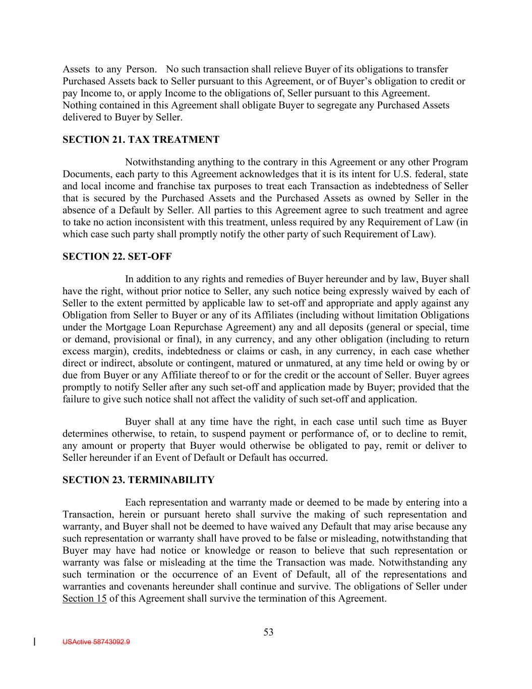 53 USActive 58743092.9 Assets to any Person. No such transaction shall relieve Buyer of its obligations to transfer Purchased Assets back to Seller pursuant to this Agreement, or of Buyer’s obligation to credit or pay Income to, or apply Income to the obligations of, Seller pursuant to this Agreement. Nothing contained in this Agreement shall obligate Buyer to segregate any Purchased Assets delivered to Buyer by Seller. SECTION 21. TAX TREATMENT Notwithstanding anything to the contrary in this Agreement or any other Program Documents, each party to this Agreement acknowledges that it is its intent for U.S. federal, state and local income and franchise tax purposes to treat each Transaction as indebtedness of Seller that is secured by the Purchased Assets and the Purchased Assets as owned by Seller in the absence of a Default by Seller. All parties to this Agreement agree to such treatment and agree to take no action inconsistent with this treatment, unless required by any Requirement of Law (in which case such party shall promptly notify the other party of such Requirement of Law). SECTION 22. SET-OFF In addition to any rights and remedies of Buyer hereunder and by law, Buyer shall have the right, without prior notice to Seller, any such notice being expressly waived by each of Seller to the extent permitted by applicable law to set-off and appropriate and apply against any Obligation from Seller to Buyer or any of its Affiliates (including without limitation Obligations under the Mortgage Loan Repurchase Agreement) any and all deposits (general or special, time or demand, provisional or final), in any currency, and any other obligation (including to return excess margin), credits, indebtedness or claims or cash, in any currency, in each case whether direct or indirect, absolute or contingent, matured or unmatured, at any time held or owing by or due from Buyer or any Affiliate thereof to or for the credit or the account of Seller. Buyer agrees promptly to notify Seller after any such set-off and application made by Buyer; provided that the failure to give such notice shall not affect the validity of such set-off and application. Buyer shall at any time have the right, in each case until such time as Buyer determines otherwise, to retain, to suspend payment or performance of, or to decline to remit, any amount or property that Buyer would otherwise be obligated to pay, remit or deliver to Seller hereunder if an Event of Default or Default has occurred. SECTION 23. TERMINABILITY Each representation and warranty made or deemed to be made by entering into a Transaction, herein or pursuant hereto shall survive the making of such representation and warranty, and Buyer shall not be deemed to have waived any Default that may arise because any such representation or warranty shall have proved to be false or misleading, notwithstanding that Buyer may have had notice or knowledge or reason to believe that such representation or warranty was false or misleading at the time the Transaction was made. Notwithstanding any such termination or the occurrence of an Event of Default, all of the representations and warranties and covenants hereunder shall continue and survive. The obligations of Seller under Section 15 of this Agreement shall survive the termination of this Agreement.