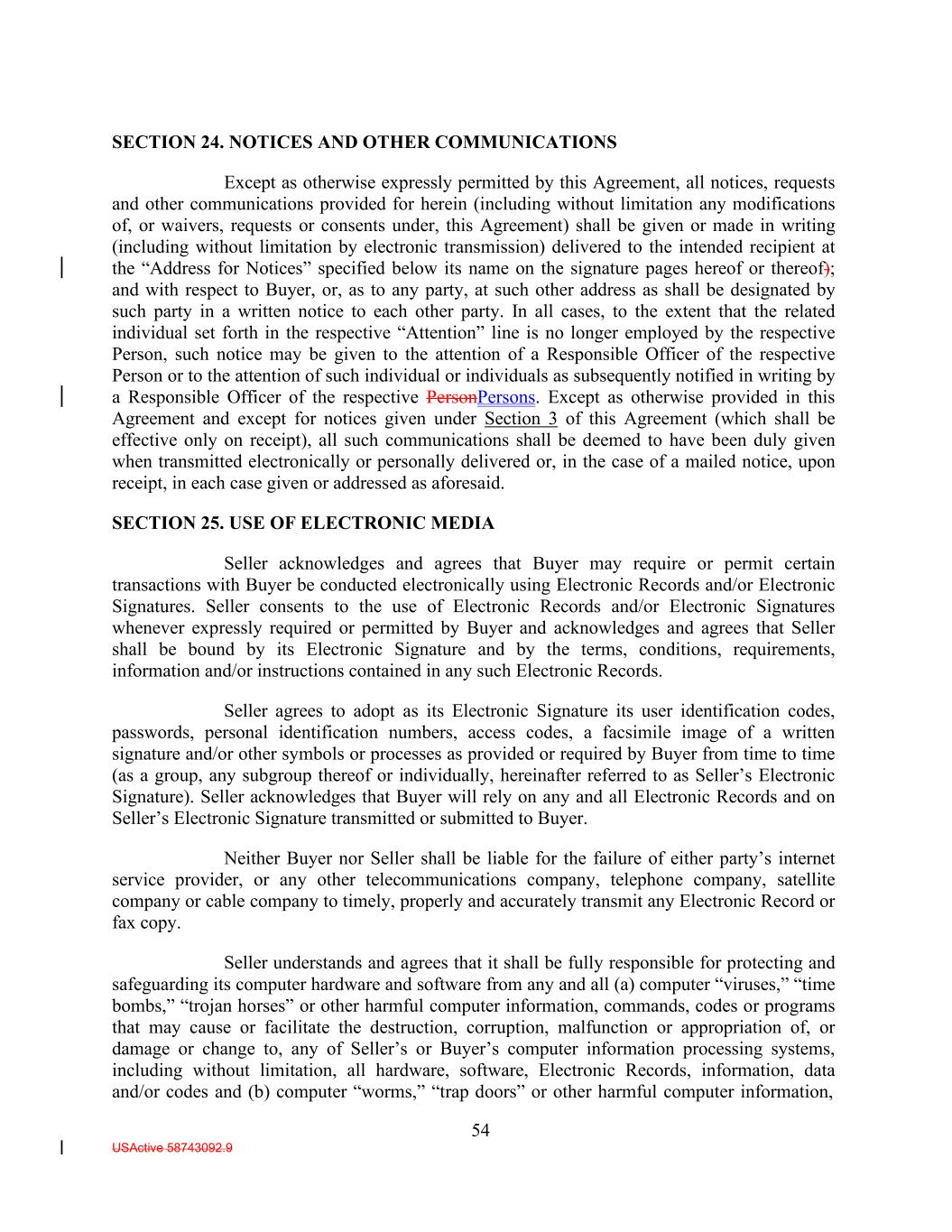54 USActive 58743092.9 SECTION 24. NOTICES AND OTHER COMMUNICATIONS Except as otherwise expressly permitted by this Agreement, all notices, requests and other communications provided for herein (including without limitation any modifications of, or waivers, requests or consents under, this Agreement) shall be given or made in writing (including without limitation by electronic transmission) delivered to the intended recipient at the “Address for Notices” specified below its name on the signature pages hereof or thereof); and with respect to Buyer, or, as to any party, at such other address as shall be designated by such party in a written notice to each other party. In all cases, to the extent that the related individual set forth in the respective “Attention” line is no longer employed by the respective Person, such notice may be given to the attention of a Responsible Officer of the respective Person or to the attention of such individual or individuals as subsequently notified in writing by a Responsible Officer of the respective PersonPersons. Except as otherwise provided in this Agreement and except for notices given under Section 3 of this Agreement (which shall be effective only on receipt), all such communications shall be deemed to have been duly given when transmitted electronically or personally delivered or, in the case of a mailed notice, upon receipt, in each case given or addressed as aforesaid. SECTION 25. USE OF ELECTRONIC MEDIA Seller acknowledges and agrees that Buyer may require or permit certain transactions with Buyer be conducted electronically using Electronic Records and/or Electronic Signatures. Seller consents to the use of Electronic Records and/or Electronic Signatures whenever expressly required or permitted by Buyer and acknowledges and agrees that Seller shall be bound by its Electronic Signature and by the terms, conditions, requirements, information and/or instructions contained in any such Electronic Records. Seller agrees to adopt as its Electronic Signature its user identification codes, passwords, personal identification numbers, access codes, a facsimile image of a written signature and/or other symbols or processes as provided or required by Buyer from time to time (as a group, any subgroup thereof or individually, hereinafter referred to as Seller’s Electronic Signature). Seller acknowledges that Buyer will rely on any and all Electronic Records and on Seller’s Electronic Signature transmitted or submitted to Buyer. Neither Buyer nor Seller shall be liable for the failure of either party’s internet service provider, or any other telecommunications company, telephone company, satellite company or cable company to timely, properly and accurately transmit any Electronic Record or fax copy. Seller understands and agrees that it shall be fully responsible for protecting and safeguarding its computer hardware and software from any and all (a) computer “viruses,” “time bombs,” “trojan horses” or other harmful computer information, commands, codes or programs that may cause or facilitate the destruction, corruption, malfunction or appropriation of, or damage or change to, any of Seller’s or Buyer’s computer information processing systems, including without limitation, all hardware, software, Electronic Records, information, data and/or codes and (b) computer “worms,” “trap doors” or other harmful computer information,