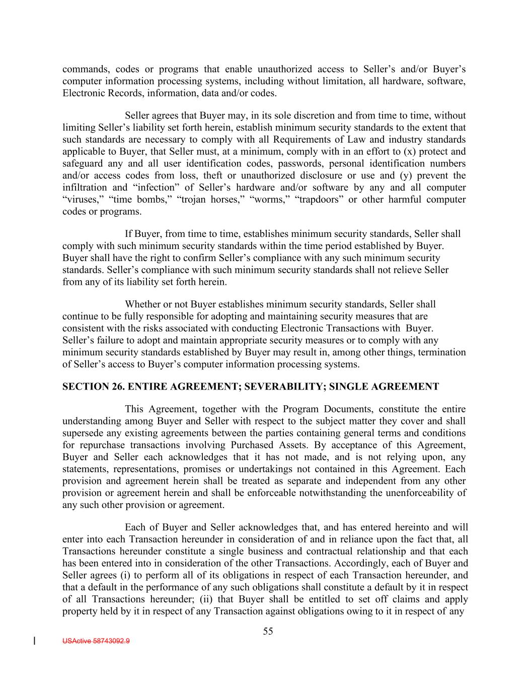 55 USActive 58743092.9 commands, codes or programs that enable unauthorized access to Seller’s and/or Buyer’s computer information processing systems, including without limitation, all hardware, software, Electronic Records, information, data and/or codes. Seller agrees that Buyer may, in its sole discretion and from time to time, without limiting Seller’s liability set forth herein, establish minimum security standards to the extent that such standards are necessary to comply with all Requirements of Law and industry standards applicable to Buyer, that Seller must, at a minimum, comply with in an effort to (x) protect and safeguard any and all user identification codes, passwords, personal identification numbers and/or access codes from loss, theft or unauthorized disclosure or use and (y) prevent the infiltration and “infection” of Seller’s hardware and/or software by any and all computer “viruses,” “time bombs,” “trojan horses,” “worms,” “trapdoors” or other harmful computer codes or programs. If Buyer, from time to time, establishes minimum security standards, Seller shall comply with such minimum security standards within the time period established by Buyer. Buyer shall have the right to confirm Seller’s compliance with any such minimum security standards. Seller’s compliance with such minimum security standards shall not relieve Seller from any of its liability set forth herein. Whether or not Buyer establishes minimum security standards, Seller shall continue to be fully responsible for adopting and maintaining security measures that are consistent with the risks associated with conducting Electronic Transactions with Buyer. Seller’s failure to adopt and maintain appropriate security measures or to comply with any minimum security standards established by Buyer may result in, among other things, termination of Seller’s access to Buyer’s computer information processing systems. SECTION 26. ENTIRE AGREEMENT; SEVERABILITY; SINGLE AGREEMENT This Agreement, together with the Program Documents, constitute the entire understanding among Buyer and Seller with respect to the subject matter they cover and shall supersede any existing agreements between the parties containing general terms and conditions for repurchase transactions involving Purchased Assets. By acceptance of this Agreement, Buyer and Seller each acknowledges that it has not made, and is not relying upon, any statements, representations, promises or undertakings not contained in this Agreement. Each provision and agreement herein shall be treated as separate and independent from any other provision or agreement herein and shall be enforceable notwithstanding the unenforceability of any such other provision or agreement. Each of Buyer and Seller acknowledges that, and has entered hereinto and will enter into each Transaction hereunder in consideration of and in reliance upon the fact that, all Transactions hereunder constitute a single business and contractual relationship and that each has been entered into in consideration of the other Transactions. Accordingly, each of Buyer and Seller agrees (i) to perform all of its obligations in respect of each Transaction hereunder, and that a default in the performance of any such obligations shall constitute a default by it in respect of all Transactions hereunder; (ii) that Buyer shall be entitled to set off claims and apply property held by it in respect of any Transaction against obligations owing to it in respect of any