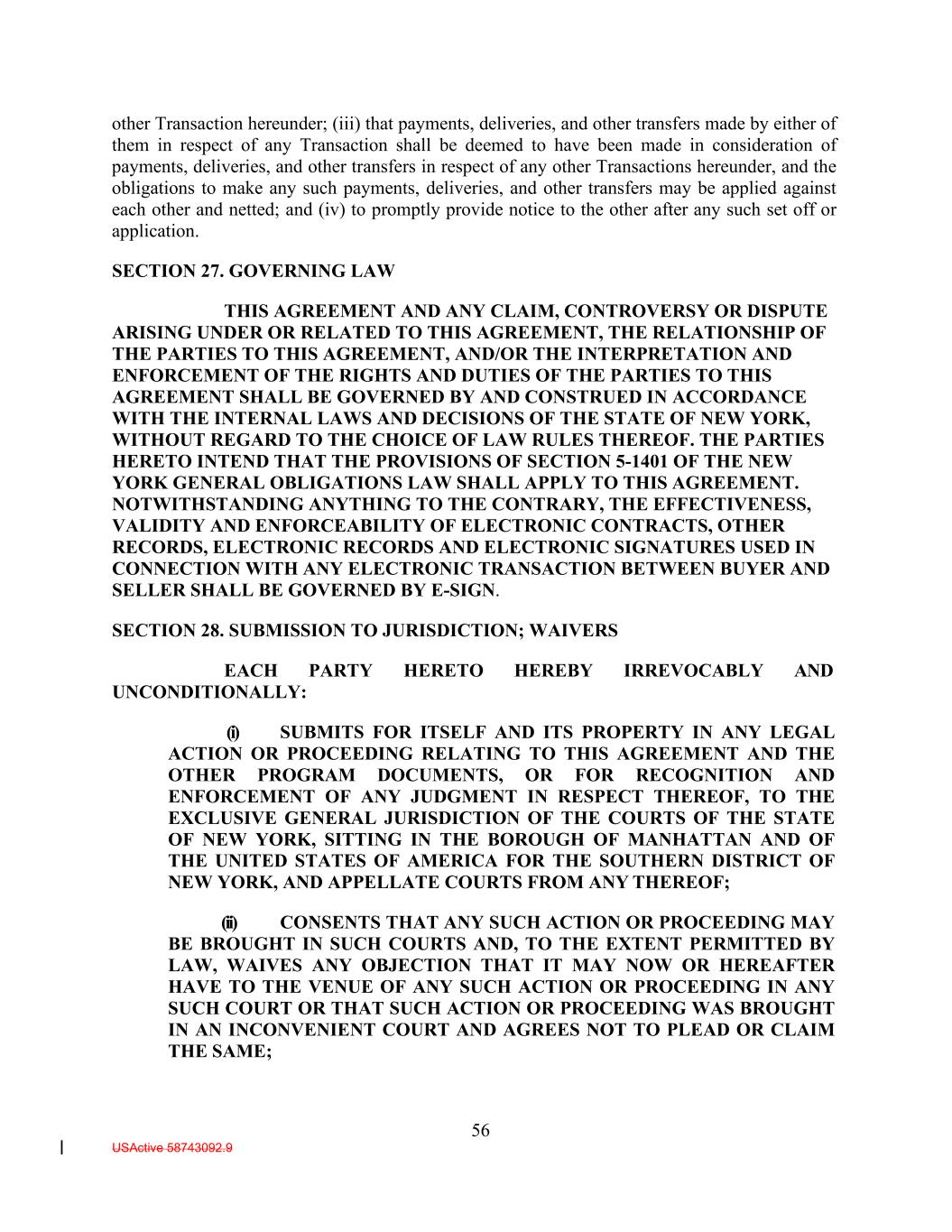 56 USActive 58743092.9 other Transaction hereunder; (iii) that payments, deliveries, and other transfers made by either of them in respect of any Transaction shall be deemed to have been made in consideration of payments, deliveries, and other transfers in respect of any other Transactions hereunder, and the obligations to make any such payments, deliveries, and other transfers may be applied against each other and netted; and (iv) to promptly provide notice to the other after any such set off or application. SECTION 27. GOVERNING LAW THIS AGREEMENT AND ANY CLAIM, CONTROVERSY OR DISPUTE ARISING UNDER OR RELATED TO THIS AGREEMENT, THE RELATIONSHIP OF THE PARTIES TO THIS AGREEMENT, AND/OR THE INTERPRETATION AND ENFORCEMENT OF THE RIGHTS AND DUTIES OF THE PARTIES TO THIS AGREEMENT SHALL BE GOVERNED BY AND CONSTRUED IN ACCORDANCE WITH THE INTERNAL LAWS AND DECISIONS OF THE STATE OF NEW YORK, WITHOUT REGARD TO THE CHOICE OF LAW RULES THEREOF. THE PARTIES HERETO INTEND THAT THE PROVISIONS OF SECTION 5-1401 OF THE NEW YORK GENERAL OBLIGATIONS LAW SHALL APPLY TO THIS AGREEMENT. NOTWITHSTANDING ANYTHING TO THE CONTRARY, THE EFFECTIVENESS, VALIDITY AND ENFORCEABILITY OF ELECTRONIC CONTRACTS, OTHER RECORDS, ELECTRONIC RECORDS AND ELECTRONIC SIGNATURES USED IN CONNECTION WITH ANY ELECTRONIC TRANSACTION BETWEEN BUYER AND SELLER SHALL BE GOVERNED BY E-SIGN. SECTION 28. SUBMISSION TO JURISDICTION; WAIVERS EACH PARTY HERETO HEREBY IRREVOCABLY AND UNCONDITIONALLY: (i) SUBMITS FOR ITSELF AND ITS PROPERTY IN ANY LEGAL ACTION OR PROCEEDING RELATING TO THIS AGREEMENT AND THE OTHER PROGRAM DOCUMENTS, OR FOR RECOGNITION AND ENFORCEMENT OF ANY JUDGMENT IN RESPECT THEREOF, TO THE EXCLUSIVE GENERAL JURISDICTION OF THE COURTS OF THE STATE OF NEW YORK, SITTING IN THE BOROUGH OF MANHATTAN AND OF THE UNITED STATES OF AMERICA FOR THE SOUTHERN DISTRICT OF NEW YORK, AND APPELLATE COURTS FROM ANY THEREOF; (ii) CONSENTS THAT ANY SUCH ACTION OR PROCEEDING MAY BE BROUGHT IN SUCH COURTS AND, TO THE EXTENT PERMITTED BY LAW, WAIVES ANY OBJECTION THAT IT MAY NOW OR HEREAFTER HAVE TO THE VENUE OF ANY SUCH ACTION OR PROCEEDING IN ANY SUCH COURT OR THAT SUCH ACTION OR PROCEEDING WAS BROUGHT IN AN INCONVENIENT COURT AND AGREES NOT TO PLEAD OR CLAIM THE SAME;