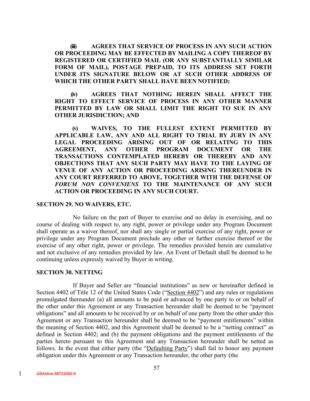57 USActive 58743092.9 (iii) AGREES THAT SERVICE OF PROCESS IN ANY SUCH ACTION OR PROCEEDING MAY BE EFFECTED BY MAILING A COPY THEREOF BY REGISTERED OR CERTIFIED MAIL (OR ANY SUBSTANTIALLY SIMILAR FORM OF MAIL), POSTAGE PREPAID, TO ITS ADDRESS SET FORTH UNDER ITS SIGNATURE BELOW OR AT SUCH OTHER ADDRESS OF WHICH THE OTHER PARTY SHALL HAVE BEEN NOTIFIED; (iv) AGREES THAT NOTHING HEREIN SHALL AFFECT THE RIGHT TO EFFECT SERVICE OF PROCESS IN ANY OTHER MANNER PERMITTED BY LAW OR SHALL LIMIT THE RIGHT TO SUE IN ANY OTHER JURISDICTION; AND (v) WAIVES, TO THE FULLEST EXTENT PERMITTED BY APPLICABLE LAW, ANY AND ALL RIGHT TO TRIAL BY JURY IN ANY LEGAL PROCEEDING ARISING OUT OF OR RELATING TO THIS AGREEMENT, ANY OTHER PROGRAM DOCUMENT OR THE TRANSACTIONS CONTEMPLATED HEREBY OR THEREBY AND ANY OBJECTIONS THAT ANY SUCH PARTY MAY HAVE TO THE LAYING OF VENUE OF ANY ACTION OR PROCEEDING ARISING THEREUNDER IN ANY COURT REFERRED TO ABOVE, TOGETHER WITH THE DEFENSE OF FORUM NON CONVENIENS TO THE MAINTENANCE OF ANY SUCH ACTION OR PROCEEDING IN ANY SUCH COURT. SECTION 29. NO WAIVERS, ETC. No failure on the part of Buyer to exercise and no delay in exercising, and no course of dealing with respect to, any right, power or privilege under any Program Document shall operate as a waiver thereof, nor shall any single or partial exercise of any right, power or privilege under any Program Document preclude any other or further exercise thereof or the exercise of any other right, power or privilege. The remedies provided herein are cumulative and not exclusive of any remedies provided by law. An Event of Default shall be deemed to be continuing unless expressly waived by Buyer in writing. SECTION 30. NETTING If Buyer and Seller are “financial institutions” as now or hereinafter defined in Section 4402 of Title 12 of the United States Code (“Section 4402”) and any rules or regulations promulgated thereunder (a) all amounts to be paid or advanced by one party to or on behalf of the other under this Agreement or any Transaction hereunder shall be deemed to be “payment obligations” and all amounts to be received by or on behalf of one party from the other under this Agreement or any Transaction hereunder shall be deemed to be “payment entitlements” within the meaning of Section 4402, and this Agreement shall be deemed to be a “netting contract” as defined in Section 4402; and (b) the payment obligations and the payment entitlements of the parties hereto pursuant to this Agreement and any Transaction hereunder shall be netted as follows. In the event that either party (the “Defaulting Party”) shall fail to honor any payment obligation under this Agreement or any Transaction hereunder, the other party (the