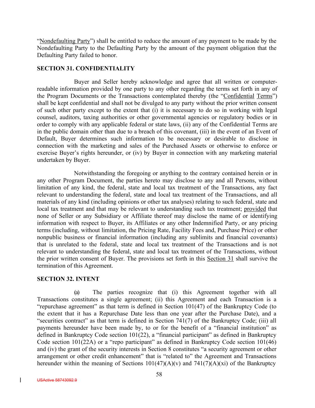 58 USActive 58743092.9 “Nondefaulting Party”) shall be entitled to reduce the amount of any payment to be made by the Nondefaulting Party to the Defaulting Party by the amount of the payment obligation that the Defaulting Party failed to honor. SECTION 31. CONFIDENTIALITY Buyer and Seller hereby acknowledge and agree that all written or computer- readable information provided by one party to any other regarding the terms set forth in any of the Program Documents or the Transactions contemplated thereby (the “Confidential Terms”) shall be kept confidential and shall not be divulged to any party without the prior written consent of such other party except to the extent that (i) it is necessary to do so in working with legal counsel, auditors, taxing authorities or other governmental agencies or regulatory bodies or in order to comply with any applicable federal or state laws, (ii) any of the Confidential Terms are in the public domain other than due to a breach of this covenant, (iii) in the event of an Event of Default, Buyer determines such information to be necessary or desirable to disclose in connection with the marketing and sales of the Purchased Assets or otherwise to enforce or exercise Buyer’s rights hereunder, or (iv) by Buyer in connection with any marketing material undertaken by Buyer. Notwithstanding the foregoing or anything to the contrary contained herein or in any other Program Document, the parties hereto may disclose to any and all Persons, without limitation of any kind, the federal, state and local tax treatment of the Transactions, any fact relevant to understanding the federal, state and local tax treatment of the Transactions, and all materials of any kind (including opinions or other tax analyses) relating to such federal, state and local tax treatment and that may be relevant to understanding such tax treatment; provided that none of Seller or any Subsidiary or Affiliate thereof may disclose the name of or identifying information with respect to Buyer, its Affiliates or any other Indemnified Party, or any pricing terms (including, without limitation, the Pricing Rate, Facility Fees and, Purchase Price) or other nonpublic business or financial information (including any sublimits and financial covenants) that is unrelated to the federal, state and local tax treatment of the Transactions and is not relevant to understanding the federal, state and local tax treatment of the Transactions, without the prior written consent of Buyer. The provisions set forth in this Section 31 shall survive the termination of this Agreement. SECTION 32. INTENT (a) The parties recognize that (i) this Agreement together with all Transactions constitutes a single agreement; (ii) this Agreement and each Transaction is a “repurchase agreement” as that term is defined in Section 101(47) of the Bankruptcy Code (to the extent that it has a Repurchase Date less than one year after the Purchase Date), and a “securities contract” as that term is defined in Section 741(7) of the Bankruptcy Code; (iii) all payments hereunder have been made by, to or for the benefit of a “financial institution” as defined in Bankruptcy Code section 101(22), a “financial participant” as defined in Bankruptcy Code section 101(22A) or a “repo participant” as defined in Bankruptcy Code section 101(46) and (iv) the grant of the security interests in Section 8 constitutes “a security agreement or other arrangement or other credit enhancement” that is “related to” the Agreement and Transactions hereunder within the meaning of Sections 101(47)(A)(v) and 741(7)(A)(xi) of the Bankruptcy