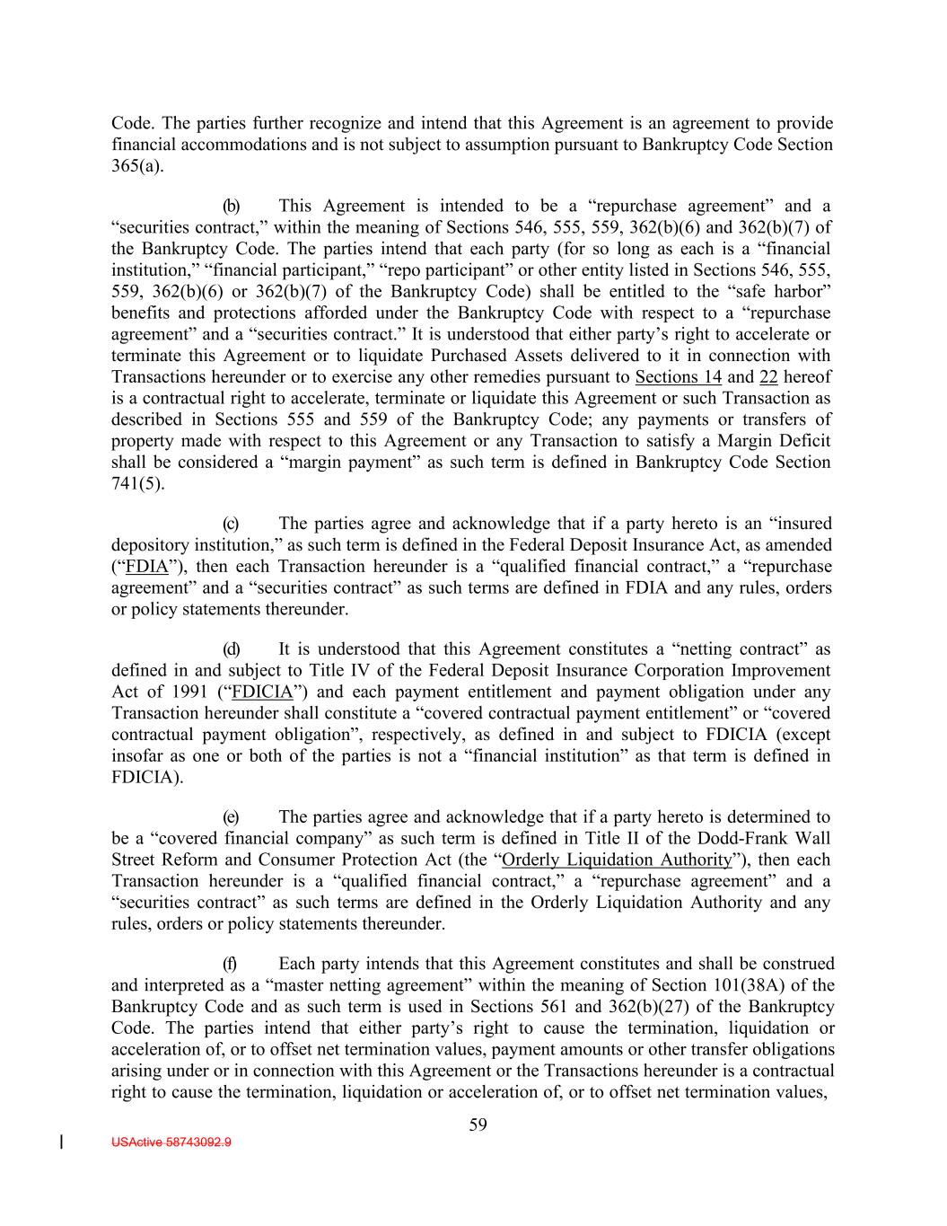 59 USActive 58743092.9 Code. The parties further recognize and intend that this Agreement is an agreement to provide financial accommodations and is not subject to assumption pursuant to Bankruptcy Code Section 365(a). (b) This Agreement is intended to be a “repurchase agreement” and a “securities contract,” within the meaning of Sections 546, 555, 559, 362(b)(6) and 362(b)(7) of the Bankruptcy Code. The parties intend that each party (for so long as each is a “financial institution,” “financial participant,” “repo participant” or other entity listed in Sections 546, 555, 559, 362(b)(6) or 362(b)(7) of the Bankruptcy Code) shall be entitled to the “safe harbor” benefits and protections afforded under the Bankruptcy Code with respect to a “repurchase agreement” and a “securities contract.” It is understood that either party’s right to accelerate or terminate this Agreement or to liquidate Purchased Assets delivered to it in connection with Transactions hereunder or to exercise any other remedies pursuant to Sections 14 and 22 hereof is a contractual right to accelerate, terminate or liquidate this Agreement or such Transaction as described in Sections 555 and 559 of the Bankruptcy Code; any payments or transfers of property made with respect to this Agreement or any Transaction to satisfy a Margin Deficit shall be considered a “margin payment” as such term is defined in Bankruptcy Code Section 741(5). (c) The parties agree and acknowledge that if a party hereto is an “insured depository institution,” as such term is defined in the Federal Deposit Insurance Act, as amended (“FDIA”), then each Transaction hereunder is a “qualified financial contract,” a “repurchase agreement” and a “securities contract” as such terms are defined in FDIA and any rules, orders or policy statements thereunder. (d) It is understood that this Agreement constitutes a “netting contract” as defined in and subject to Title IV of the Federal Deposit Insurance Corporation Improvement Act of 1991 (“FDICIA”) and each payment entitlement and payment obligation under any Transaction hereunder shall constitute a “covered contractual payment entitlement” or “covered contractual payment obligation”, respectively, as defined in and subject to FDICIA (except insofar as one or both of the parties is not a “financial institution” as that term is defined in FDICIA). (e) The parties agree and acknowledge that if a party hereto is determined to be a “covered financial company” as such term is defined in Title II of the Dodd-Frank Wall Street Reform and Consumer Protection Act (the “Orderly Liquidation Authority”), then each Transaction hereunder is a “qualified financial contract,” a “repurchase agreement” and a “securities contract” as such terms are defined in the Orderly Liquidation Authority and any rules, orders or policy statements thereunder. (f) Each party intends that this Agreement constitutes and shall be construed and interpreted as a “master netting agreement” within the meaning of Section 101(38A) of the Bankruptcy Code and as such term is used in Sections 561 and 362(b)(27) of the Bankruptcy Code. The parties intend that either party’s right to cause the termination, liquidation or acceleration of, or to offset net termination values, payment amounts or other transfer obligations arising under or in connection with this Agreement or the Transactions hereunder is a contractual right to cause the termination, liquidation or acceleration of, or to offset net termination values,
