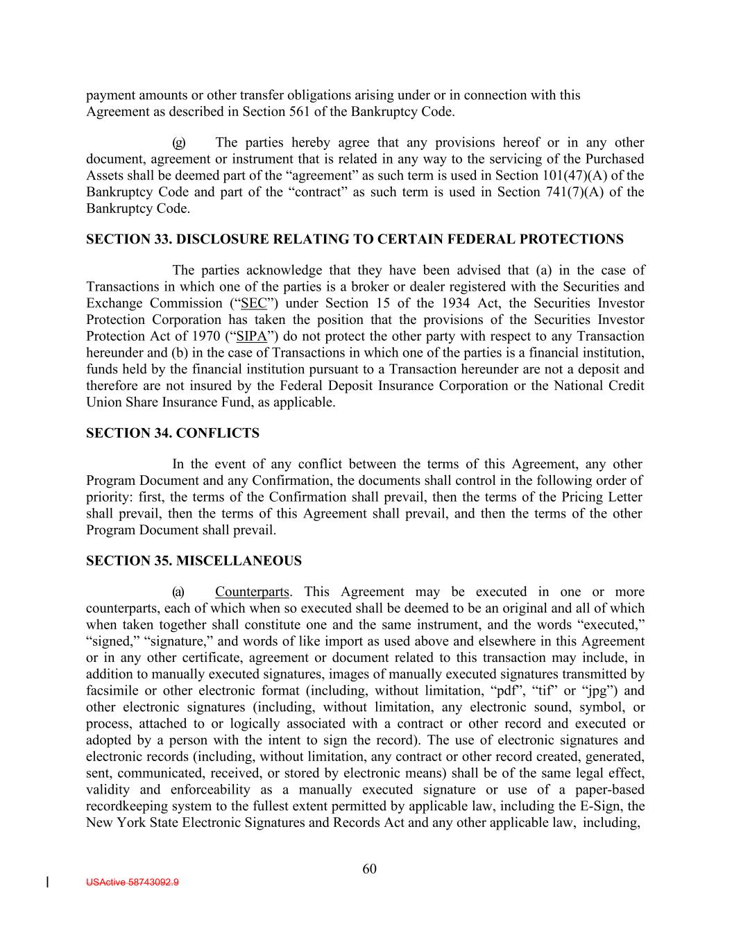 60 USActive 58743092.9 payment amounts or other transfer obligations arising under or in connection with this Agreement as described in Section 561 of the Bankruptcy Code. (g) The parties hereby agree that any provisions hereof or in any other document, agreement or instrument that is related in any way to the servicing of the Purchased Assets shall be deemed part of the “agreement” as such term is used in Section 101(47)(A) of the Bankruptcy Code and part of the “contract” as such term is used in Section 741(7)(A) of the Bankruptcy Code. SECTION 33. DISCLOSURE RELATING TO CERTAIN FEDERAL PROTECTIONS The parties acknowledge that they have been advised that (a) in the case of Transactions in which one of the parties is a broker or dealer registered with the Securities and Exchange Commission (“SEC”) under Section 15 of the 1934 Act, the Securities Investor Protection Corporation has taken the position that the provisions of the Securities Investor Protection Act of 1970 (“SIPA”) do not protect the other party with respect to any Transaction hereunder and (b) in the case of Transactions in which one of the parties is a financial institution, funds held by the financial institution pursuant to a Transaction hereunder are not a deposit and therefore are not insured by the Federal Deposit Insurance Corporation or the National Credit Union Share Insurance Fund, as applicable. SECTION 34. CONFLICTS In the event of any conflict between the terms of this Agreement, any other Program Document and any Confirmation, the documents shall control in the following order of priority: first, the terms of the Confirmation shall prevail, then the terms of the Pricing Letter shall prevail, then the terms of this Agreement shall prevail, and then the terms of the other Program Document shall prevail. SECTION 35. MISCELLANEOUS (a) Counterparts. This Agreement may be executed in one or more counterparts, each of which when so executed shall be deemed to be an original and all of which when taken together shall constitute one and the same instrument, and the words “executed,” “signed,” “signature,” and words of like import as used above and elsewhere in this Agreement or in any other certificate, agreement or document related to this transaction may include, in addition to manually executed signatures, images of manually executed signatures transmitted by facsimile or other electronic format (including, without limitation, “pdf”, “tif” or “jpg”) and other electronic signatures (including, without limitation, any electronic sound, symbol, or process, attached to or logically associated with a contract or other record and executed or adopted by a person with the intent to sign the record). The use of electronic signatures and electronic records (including, without limitation, any contract or other record created, generated, sent, communicated, received, or stored by electronic means) shall be of the same legal effect, validity and enforceability as a manually executed signature or use of a paper-based recordkeeping system to the fullest extent permitted by applicable law, including the E-Sign, the New York State Electronic Signatures and Records Act and any other applicable law, including,