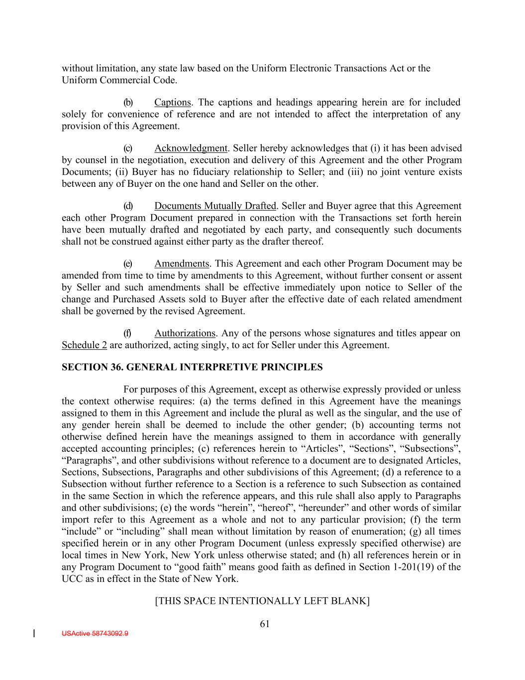 61 USActive 58743092.9 without limitation, any state law based on the Uniform Electronic Transactions Act or the Uniform Commercial Code. (b) Captions. The captions and headings appearing herein are for included solely for convenience of reference and are not intended to affect the interpretation of any provision of this Agreement. (c) Acknowledgment. Seller hereby acknowledges that (i) it has been advised by counsel in the negotiation, execution and delivery of this Agreement and the other Program Documents; (ii) Buyer has no fiduciary relationship to Seller; and (iii) no joint venture exists between any of Buyer on the one hand and Seller on the other. (d) Documents Mutually Drafted. Seller and Buyer agree that this Agreement each other Program Document prepared in connection with the Transactions set forth herein have been mutually drafted and negotiated by each party, and consequently such documents shall not be construed against either party as the drafter thereof. (e) Amendments. This Agreement and each other Program Document may be amended from time to time by amendments to this Agreement, without further consent or assent by Seller and such amendments shall be effective immediately upon notice to Seller of the change and Purchased Assets sold to Buyer after the effective date of each related amendment shall be governed by the revised Agreement. (f) Authorizations. Any of the persons whose signatures and titles appear on Schedule 2 are authorized, acting singly, to act for Seller under this Agreement. SECTION 36. GENERAL INTERPRETIVE PRINCIPLES For purposes of this Agreement, except as otherwise expressly provided or unless the context otherwise requires: (a) the terms defined in this Agreement have the meanings assigned to them in this Agreement and include the plural as well as the singular, and the use of any gender herein shall be deemed to include the other gender; (b) accounting terms not otherwise defined herein have the meanings assigned to them in accordance with generally accepted accounting principles; (c) references herein to “Articles”, “Sections”, “Subsections”, “Paragraphs”, and other subdivisions without reference to a document are to designated Articles, Sections, Subsections, Paragraphs and other subdivisions of this Agreement; (d) a reference to a Subsection without further reference to a Section is a reference to such Subsection as contained in the same Section in which the reference appears, and this rule shall also apply to Paragraphs and other subdivisions; (e) the words “herein”, “hereof”, “hereunder” and other words of similar import refer to this Agreement as a whole and not to any particular provision; (f) the term “include” or “including” shall mean without limitation by reason of enumeration; (g) all times specified herein or in any other Program Document (unless expressly specified otherwise) are local times in New York, New York unless otherwise stated; and (h) all references herein or in any Program Document to “good faith” means good faith as defined in Section 1-201(19) of the UCC as in effect in the State of New York. [THIS SPACE INTENTIONALLY LEFT BLANK]