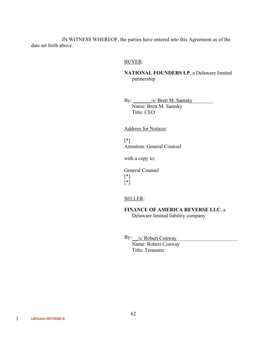 62 USActive 58743092.9 IN WITNESS WHEREOF, the parties have entered into this Agreement as of the date set forth above. BUYER: NATIONAL FOUNDERS LP, a Delaware limited partnership By: _______/s/ Brett M. Samsky________ Name: Brett M. Samsky Title: CEO Address for Notices: [*] Attention: General Counsel with a copy to: General Counsel [*] [*] SELLER: FINANCE OF AMERICA REVERSE LLC, a Delaware limited liability company By: __/s/ Robert Conway____________________________ Name: Robert Conway Title: Treasurer