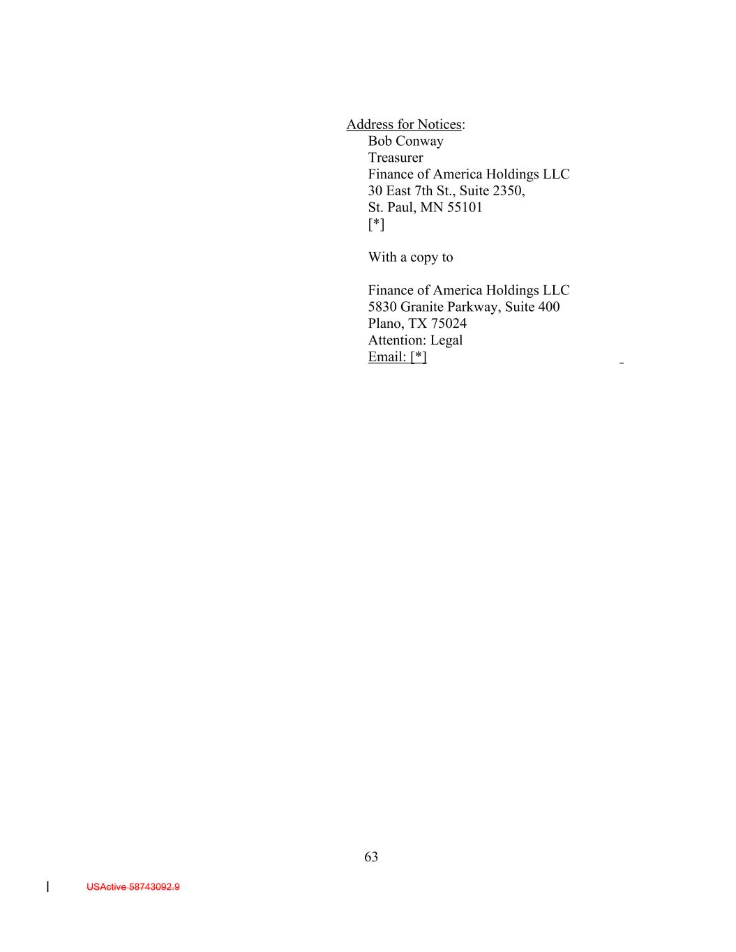 USActive 58743092.9 Address for Notices: Bob Conway Treasurer Finance of America Holdings LLC 30 East 7th St., Suite 2350, St. Paul, MN 55101 [*] With a copy to Finance of America Holdings LLC 5830 Granite Parkway, Suite 400 Plano, TX 75024 Attention: Legal Email: [*] 63