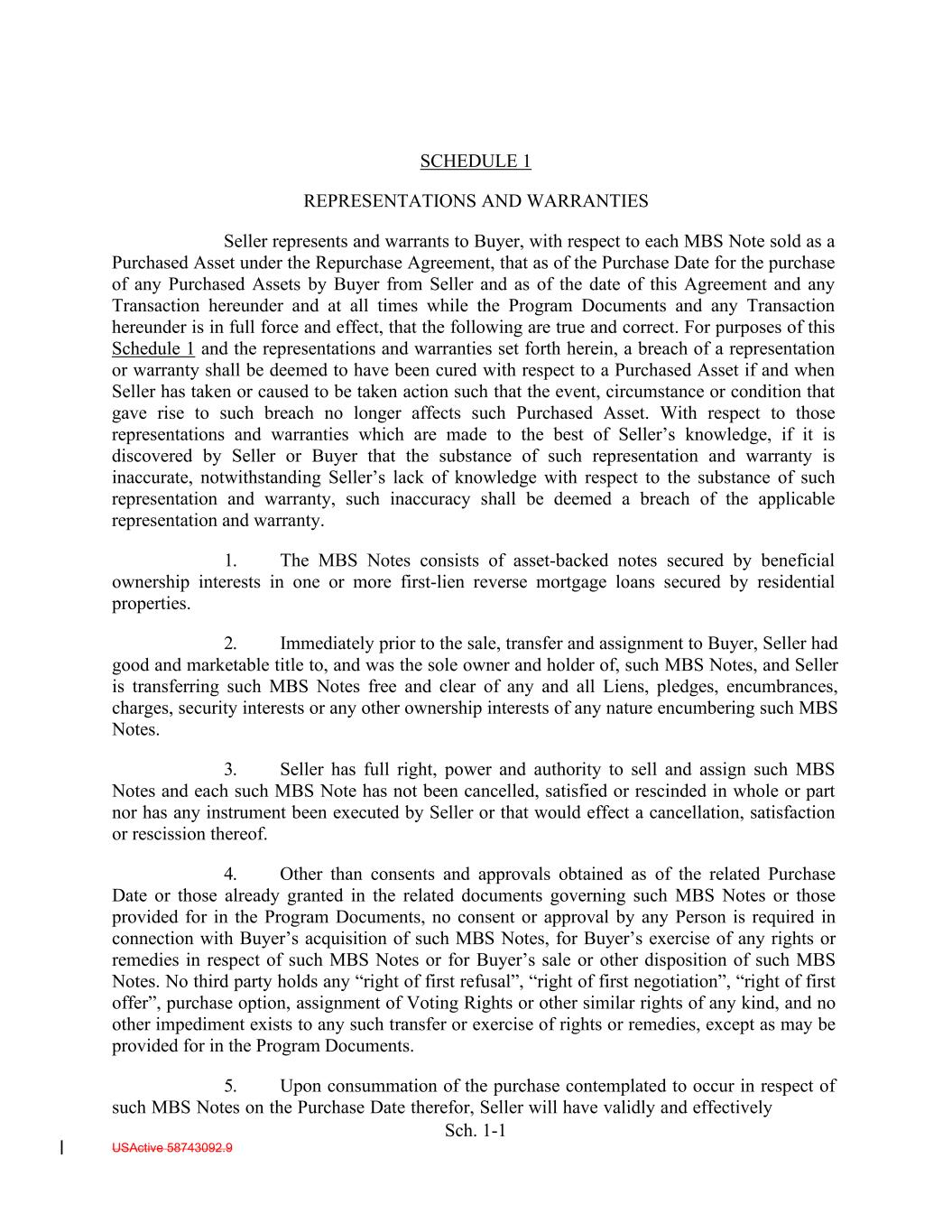 Sch. 1-1 USActive 58743092.9 SCHEDULE 1 REPRESENTATIONS AND WARRANTIES Seller represents and warrants to Buyer, with respect to each MBS Note sold as a Purchased Asset under the Repurchase Agreement, that as of the Purchase Date for the purchase of any Purchased Assets by Buyer from Seller and as of the date of this Agreement and any Transaction hereunder and at all times while the Program Documents and any Transaction hereunder is in full force and effect, that the following are true and correct. For purposes of this Schedule 1 and the representations and warranties set forth herein, a breach of a representation or warranty shall be deemed to have been cured with respect to a Purchased Asset if and when Seller has taken or caused to be taken action such that the event, circumstance or condition that gave rise to such breach no longer affects such Purchased Asset. With respect to those representations and warranties which are made to the best of Seller’s knowledge, if it is discovered by Seller or Buyer that the substance of such representation and warranty is inaccurate, notwithstanding Seller’s lack of knowledge with respect to the substance of such representation and warranty, such inaccuracy shall be deemed a breach of the applicable representation and warranty. 1. The MBS Notes consists of asset-backed notes secured by beneficial ownership interests in one or more first-lien reverse mortgage loans secured by residential properties. 2. Immediately prior to the sale, transfer and assignment to Buyer, Seller had good and marketable title to, and was the sole owner and holder of, such MBS Notes, and Seller is transferring such MBS Notes free and clear of any and all Liens, pledges, encumbrances, charges, security interests or any other ownership interests of any nature encumbering such MBS Notes. 3. Seller has full right, power and authority to sell and assign such MBS Notes and each such MBS Note has not been cancelled, satisfied or rescinded in whole or part nor has any instrument been executed by Seller or that would effect a cancellation, satisfaction or rescission thereof. 4. Other than consents and approvals obtained as of the related Purchase Date or those already granted in the related documents governing such MBS Notes or those provided for in the Program Documents, no consent or approval by any Person is required in connection with Buyer’s acquisition of such MBS Notes, for Buyer’s exercise of any rights or remedies in respect of such MBS Notes or for Buyer’s sale or other disposition of such MBS Notes. No third party holds any “right of first refusal”, “right of first negotiation”, “right of first offer”, purchase option, assignment of Voting Rights or other similar rights of any kind, and no other impediment exists to any such transfer or exercise of rights or remedies, except as may be provided for in the Program Documents. 5. Upon consummation of the purchase contemplated to occur in respect of such MBS Notes on the Purchase Date therefor, Seller will have validly and effectively