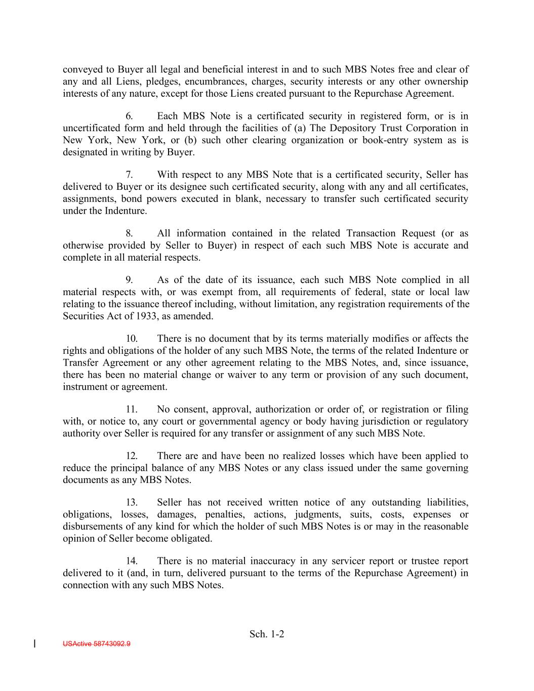 Sch. 1-2 USActive 58743092.9 conveyed to Buyer all legal and beneficial interest in and to such MBS Notes free and clear of any and all Liens, pledges, encumbrances, charges, security interests or any other ownership interests of any nature, except for those Liens created pursuant to the Repurchase Agreement. 6. Each MBS Note is a certificated security in registered form, or is in uncertificated form and held through the facilities of (a) The Depository Trust Corporation in New York, New York, or (b) such other clearing organization or book-entry system as is designated in writing by Buyer. 7. With respect to any MBS Note that is a certificated security, Seller has delivered to Buyer or its designee such certificated security, along with any and all certificates, assignments, bond powers executed in blank, necessary to transfer such certificated security under the Indenture. 8. All information contained in the related Transaction Request (or as otherwise provided by Seller to Buyer) in respect of each such MBS Note is accurate and complete in all material respects. 9. As of the date of its issuance, each such MBS Note complied in all material respects with, or was exempt from, all requirements of federal, state or local law relating to the issuance thereof including, without limitation, any registration requirements of the Securities Act of 1933, as amended. 10. There is no document that by its terms materially modifies or affects the rights and obligations of the holder of any such MBS Note, the terms of the related Indenture or Transfer Agreement or any other agreement relating to the MBS Notes, and, since issuance, there has been no material change or waiver to any term or provision of any such document, instrument or agreement. 11. No consent, approval, authorization or order of, or registration or filing with, or notice to, any court or governmental agency or body having jurisdiction or regulatory authority over Seller is required for any transfer or assignment of any such MBS Note. 12. There are and have been no realized losses which have been applied to reduce the principal balance of any MBS Notes or any class issued under the same governing documents as any MBS Notes. 13. Seller has not received written notice of any outstanding liabilities, obligations, losses, damages, penalties, actions, judgments, suits, costs, expenses or disbursements of any kind for which the holder of such MBS Notes is or may in the reasonable opinion of Seller become obligated. 14. There is no material inaccuracy in any servicer report or trustee report delivered to it (and, in turn, delivered pursuant to the terms of the Repurchase Agreement) in connection with any such MBS Notes.