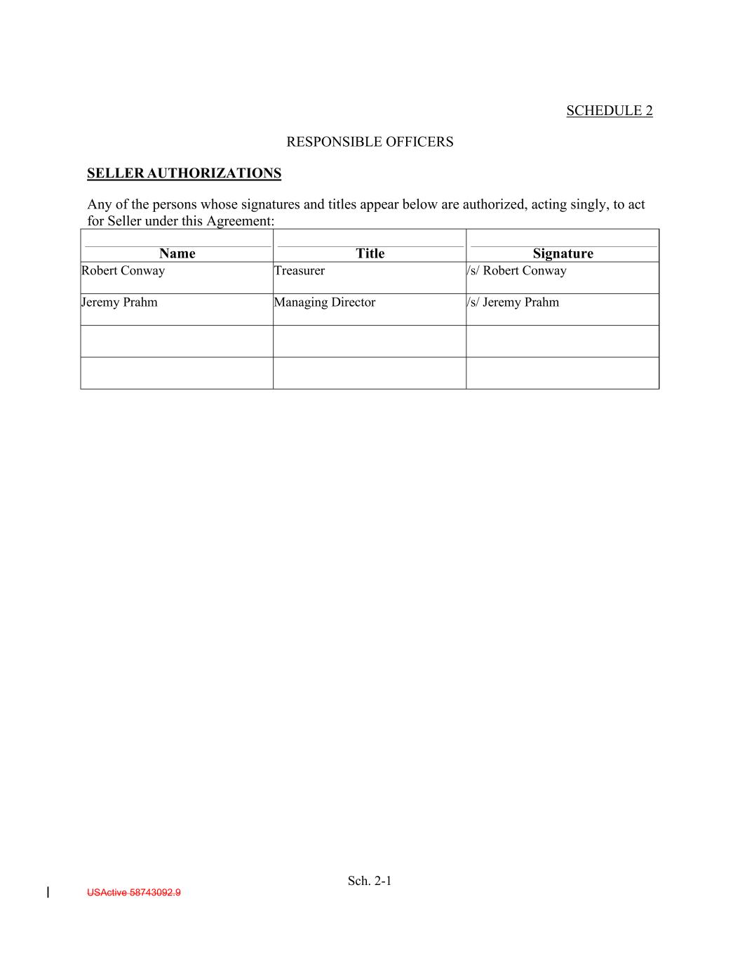 Sch. 2-1 USActive 58743092.9 SELLER AUTHORIZATIONS RESPONSIBLE OFFICERS SCHEDULE 2 Any of the persons whose signatures and titles appear below are authorized, acting singly, to act for Seller under this Agreement: Name Title Signature Robert Conway Treasurer /s/ Robert Conway Jeremy Prahm Managing Director /s/ Jeremy Prahm