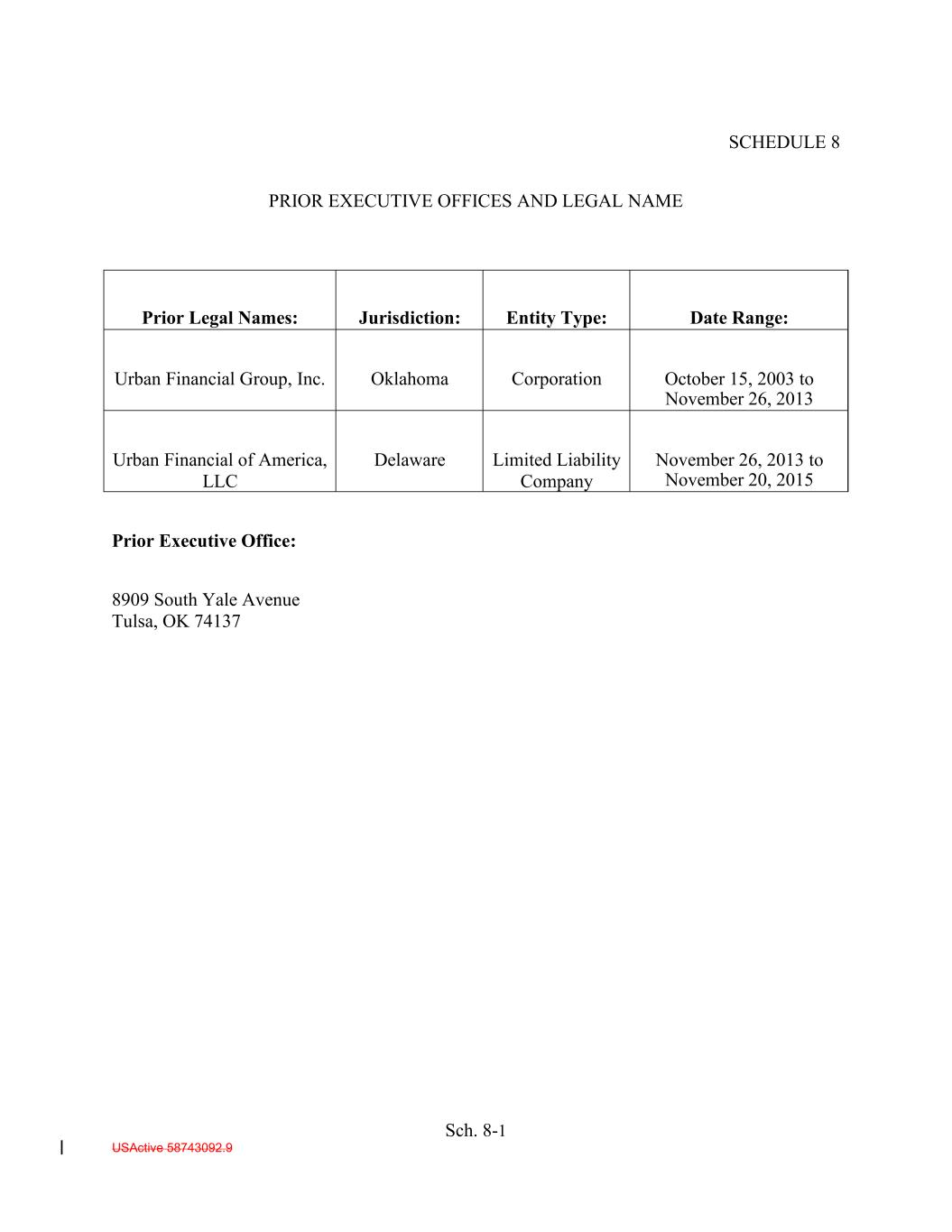 Sch. 8-1 USActive 58743092.9 SCHEDULE 8 PRIOR EXECUTIVE OFFICES AND LEGAL NAME Prior Legal Names: Jurisdiction: Entity Type: Date Range: Urban Financial Group, Inc. Oklahoma Corporation October 15, 2003 to November 26, 2013 Urban Financial of America, LLC Delaware Limited Liability Company November 26, 2013 to November 20, 2015 Prior Executive Office: 8909 South Yale Avenue Tulsa, OK 74137