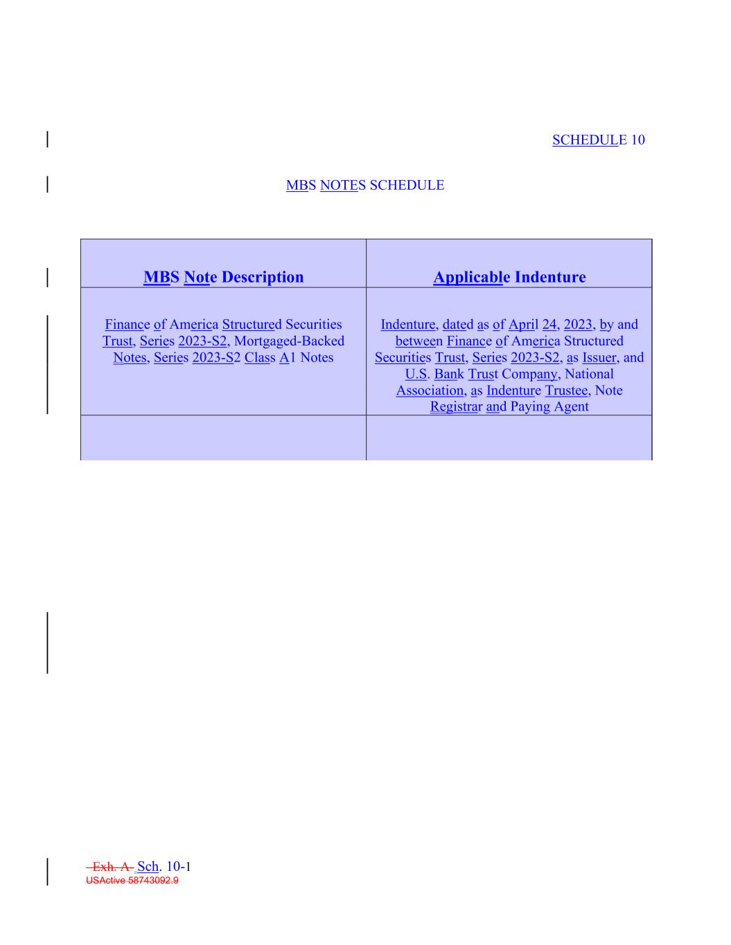USActive 58743092.9 SCHEDULE 10 MBS NOTES SCHEDULE Exh. A- Sch. 10-1 MBS Note Description Applicable Indenture Finance of America Structured Securities Indenture, dated as of April 24, 2023, by and Trust, Series 2023-S2, Mortgaged-Backed between Finance of America Structured Notes, Series 2023-S2 Class A1 Notes Securities Trust, Series 2023-S2, as Issuer, and U.S. Bank Trust Company, National Association, as Indenture Trustee, Note Registrar and Paying Agent