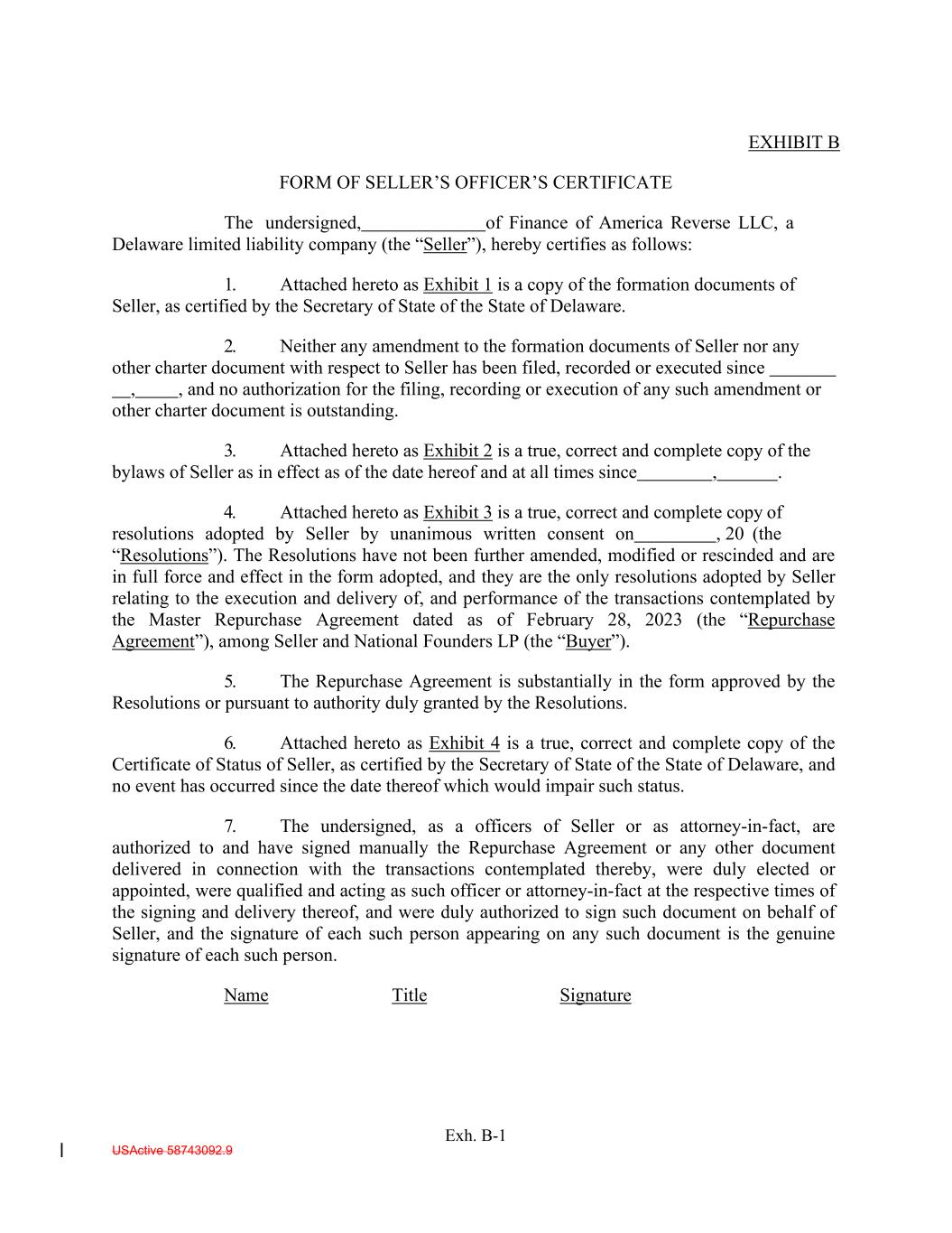 Exh. B-1 USActive 58743092.9 EXHIBIT B FORM OF SELLER’S OFFICER’S CERTIFICATE The undersigned, of Finance of America Reverse LLC, a Delaware limited liability company (the “Seller”), hereby certifies as follows: 1. Attached hereto as Exhibit 1 is a copy of the formation documents of Seller, as certified by the Secretary of State of the State of Delaware. 2. Neither any amendment to the formation documents of Seller nor any other charter document with respect to Seller has been filed, recorded or executed since , , and no authorization for the filing, recording or execution of any such amendment or other charter document is outstanding. 3. Attached hereto as Exhibit 2 is a true, correct and complete copy of the bylaws of Seller as in effect as of the date hereof and at all times since , . 4. Attached hereto as Exhibit 3 is a true, correct and complete copy of resolutions adopted by Seller by unanimous written consent on , 20 (the “Resolutions”). The Resolutions have not been further amended, modified or rescinded and are in full force and effect in the form adopted, and they are the only resolutions adopted by Seller relating to the execution and delivery of, and performance of the transactions contemplated by the Master Repurchase Agreement dated as of February 28, 2023 (the “Repurchase Agreement”), among Seller and National Founders LP (the “Buyer”). 5. The Repurchase Agreement is substantially in the form approved by the Resolutions or pursuant to authority duly granted by the Resolutions. 6. Attached hereto as Exhibit 4 is a true, correct and complete copy of the Certificate of Status of Seller, as certified by the Secretary of State of the State of Delaware, and no event has occurred since the date thereof which would impair such status. 7. The undersigned, as a officers of Seller or as attorney-in-fact, are authorized to and have signed manually the Repurchase Agreement or any other document delivered in connection with the transactions contemplated thereby, were duly elected or appointed, were qualified and acting as such officer or attorney-in-fact at the respective times of the signing and delivery thereof, and were duly authorized to sign such document on behalf of Seller, and the signature of each such person appearing on any such document is the genuine signature of each such person. Name Title Signature
