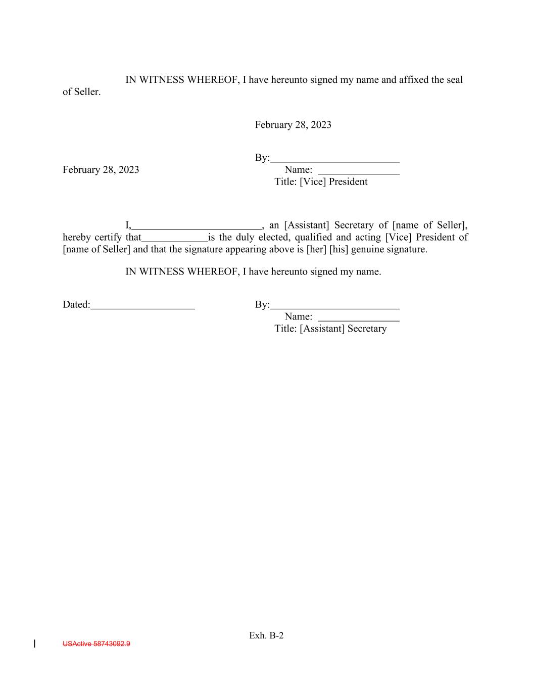 Exh. B-2 USActive 58743092.9 IN WITNESS WHEREOF, I have hereunto signed my name and affixed the seal of Seller. February 28, 2023 February 28, 2023 By: Name: Title: [Vice] President I, , an [Assistant] Secretary of [name of Seller], hereby certify that is the duly elected, qualified and acting [Vice] President of [name of Seller] and that the signature appearing above is [her] [his] genuine signature. IN WITNESS WHEREOF, I have hereunto signed my name. Dated: By: Name: Title: [Assistant] Secretary